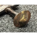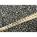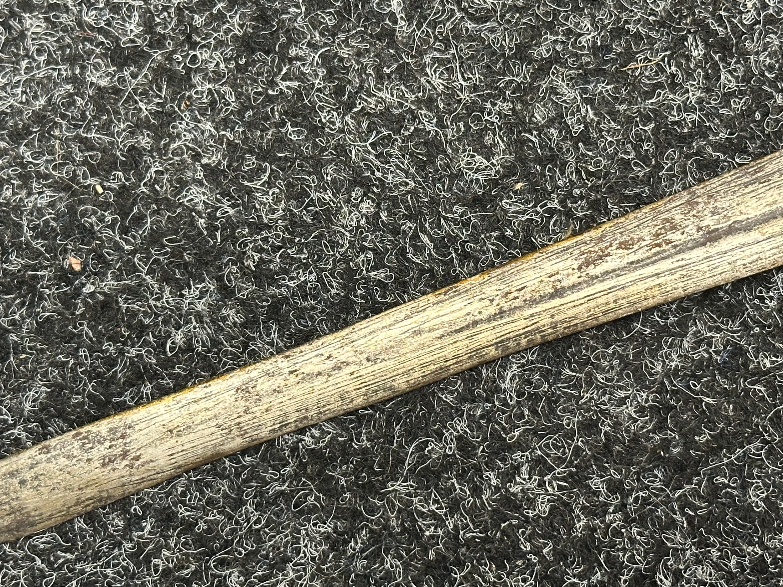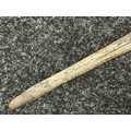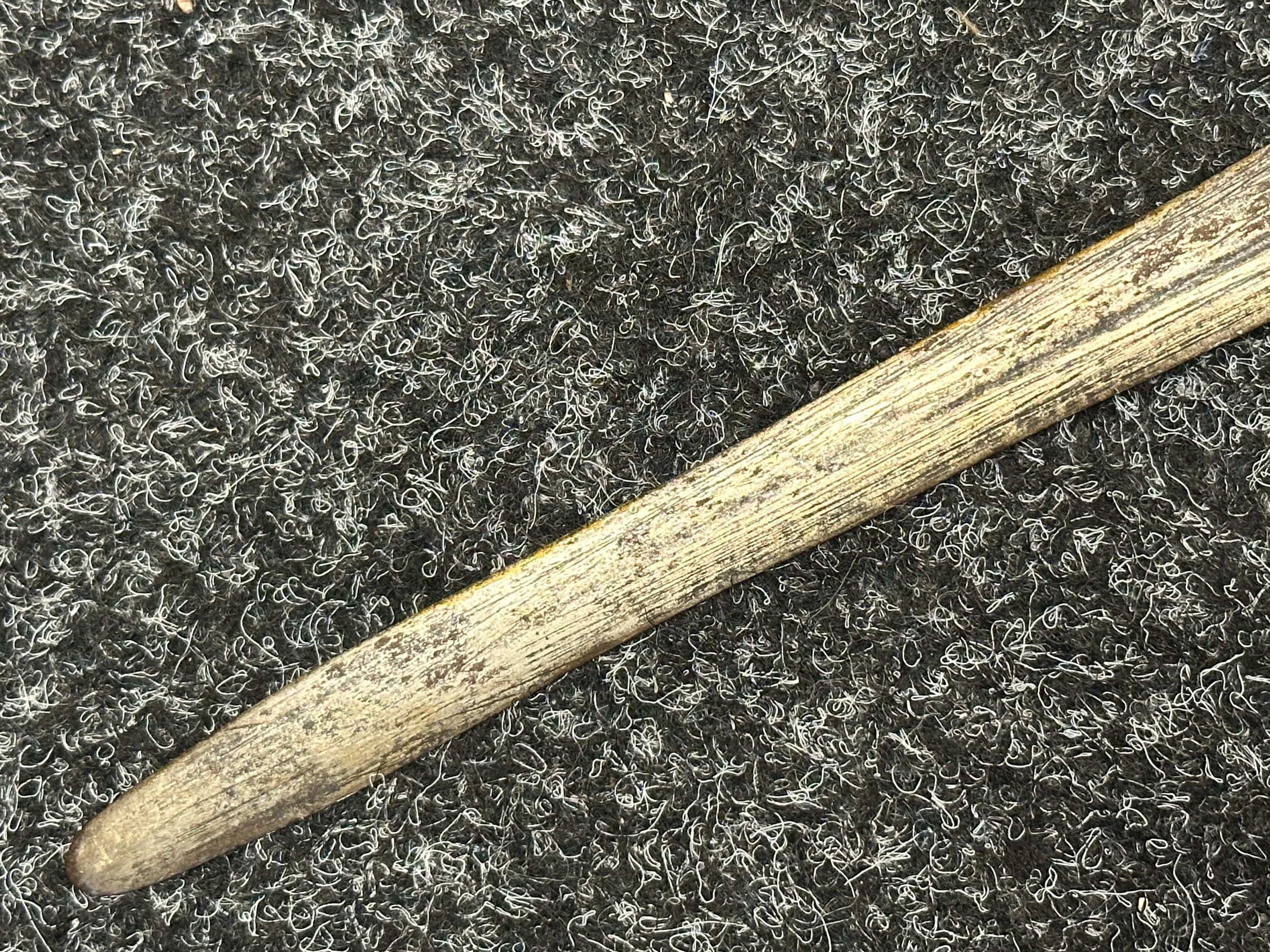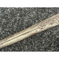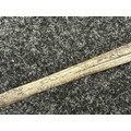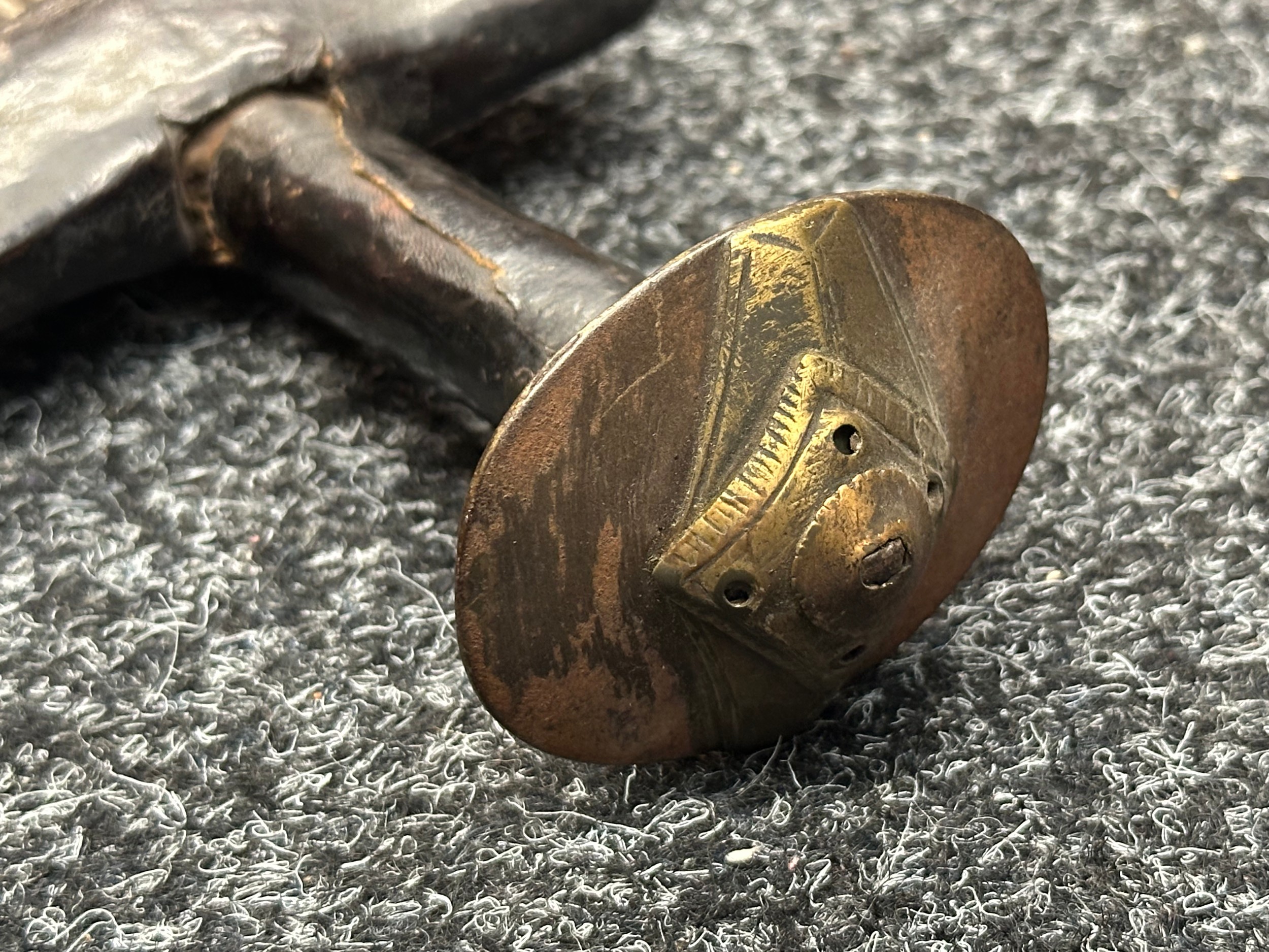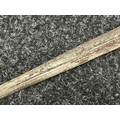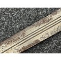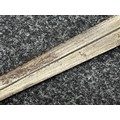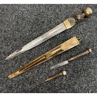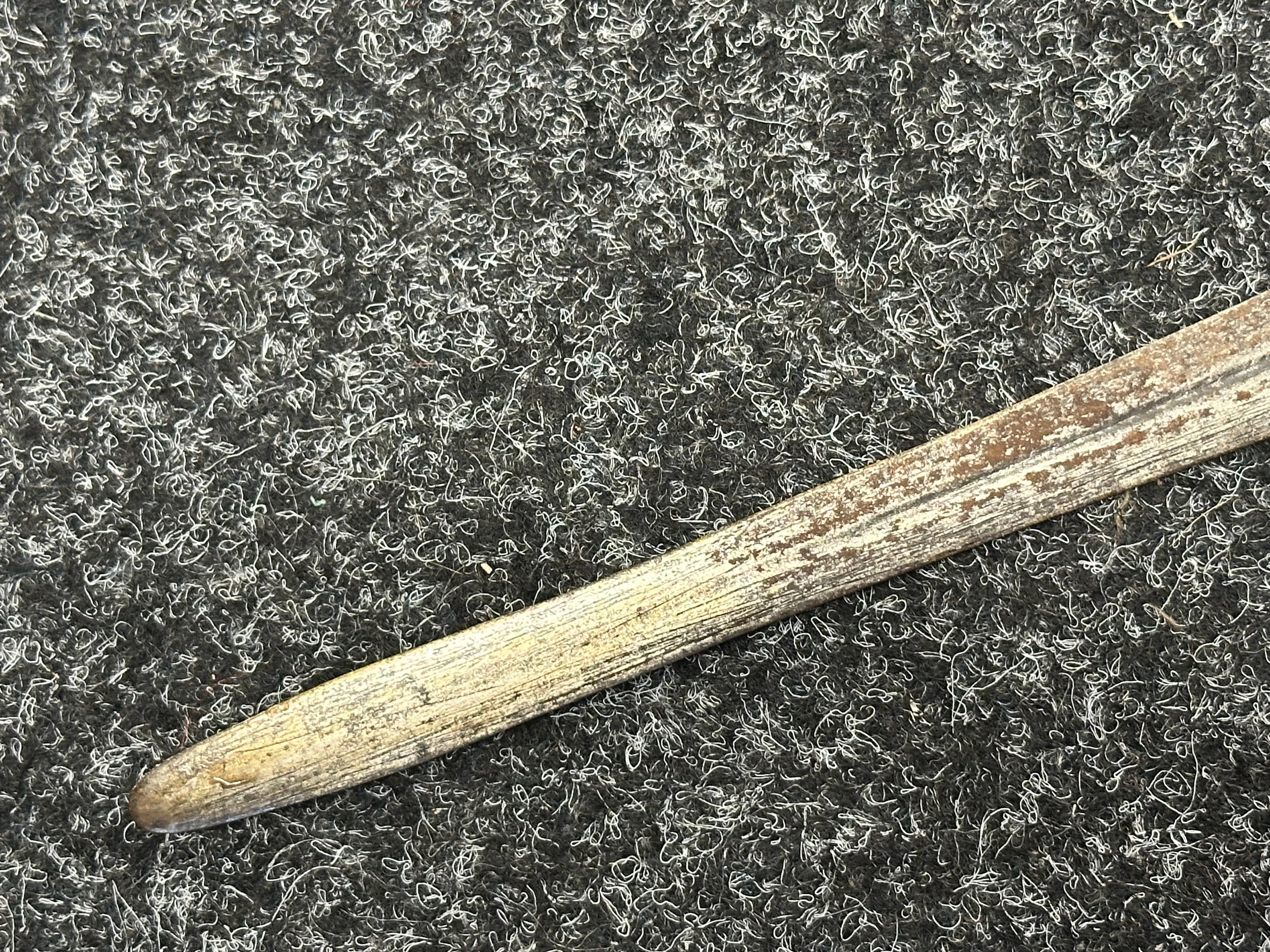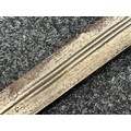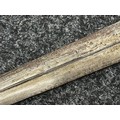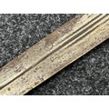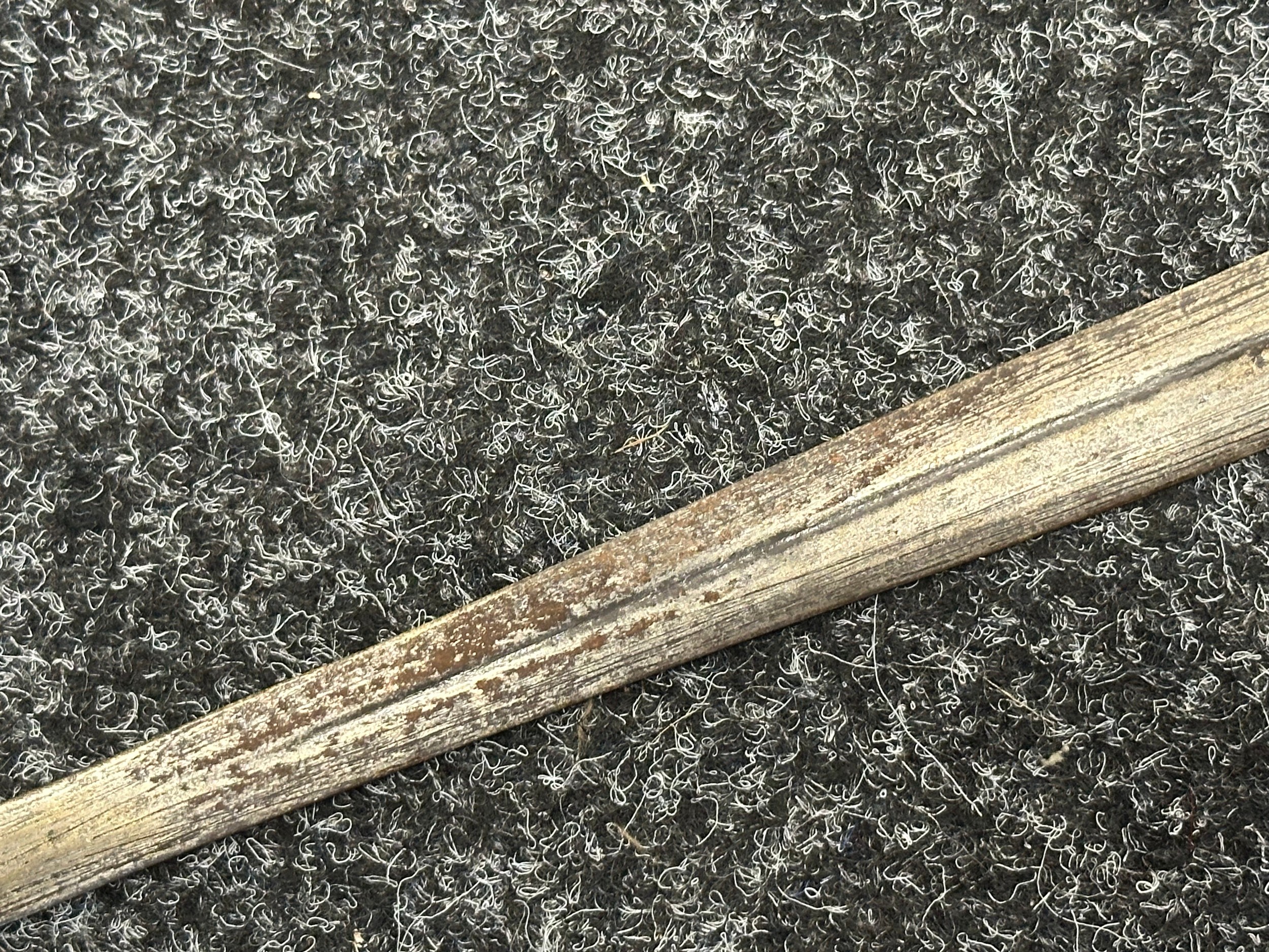 Sudanese Kaskara Sword with fullered double edged blade 834mm in length, marked with half moon markings. Leather covered crossguard and grip. Steel pommel with brass decoration. Overall length 970mm. No scabbard.