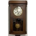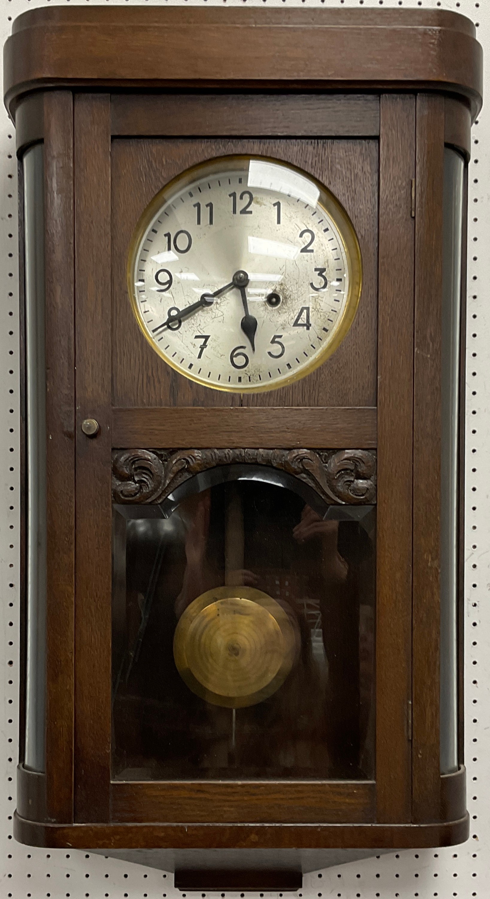 A 1930’s oak cased wall clock, eight day movement, silvered metal dial with Arabic numerals,