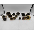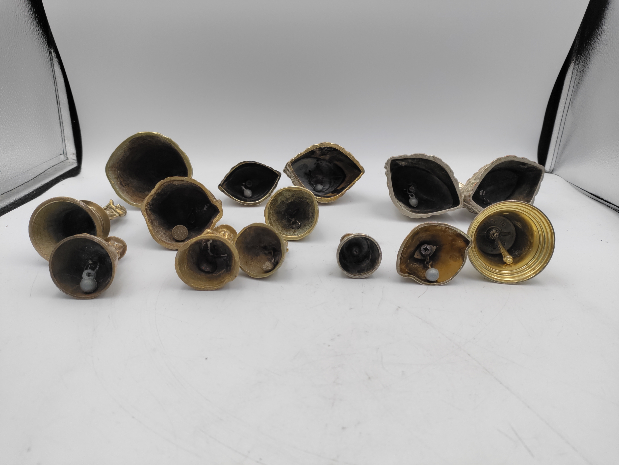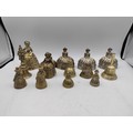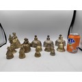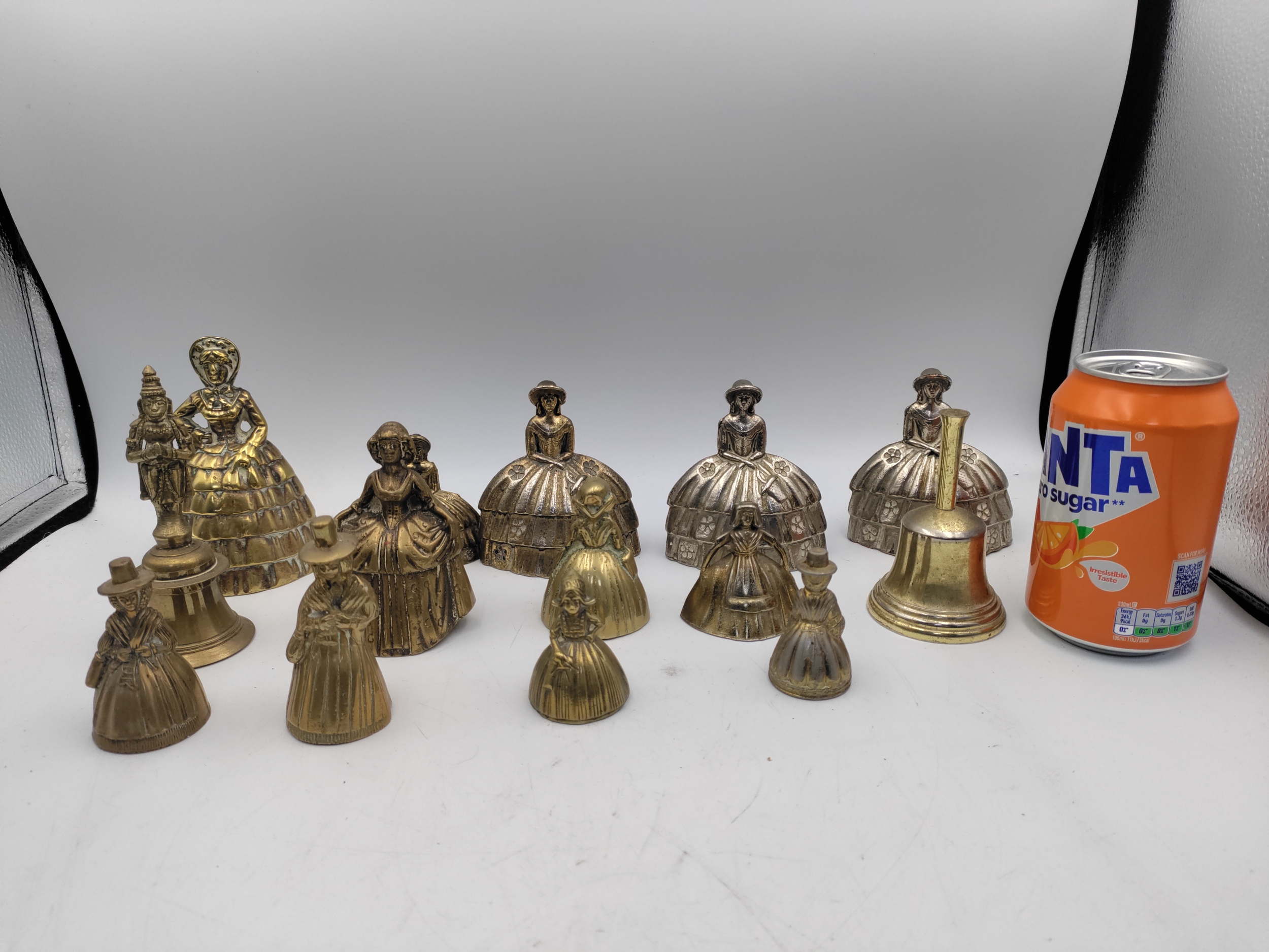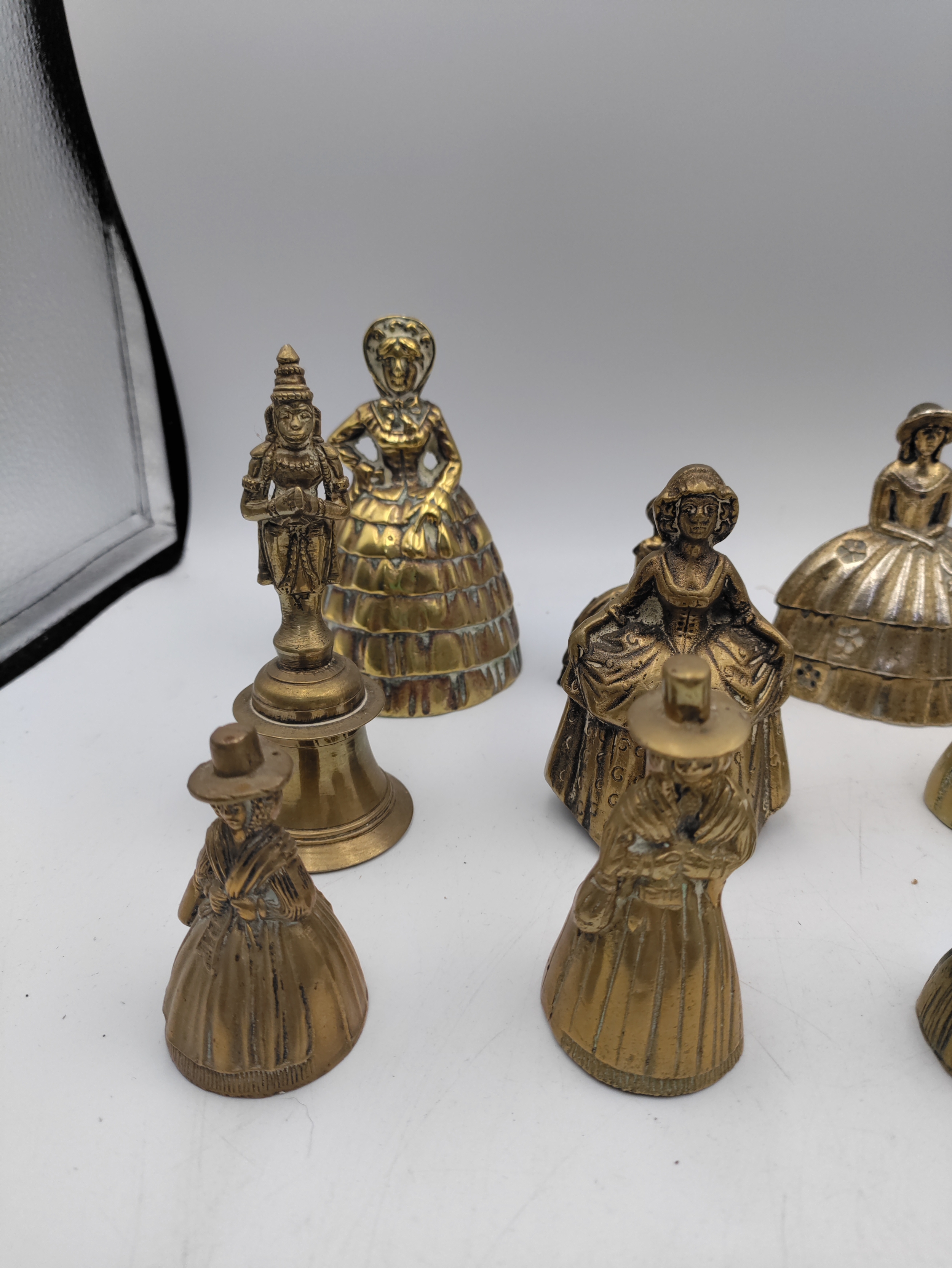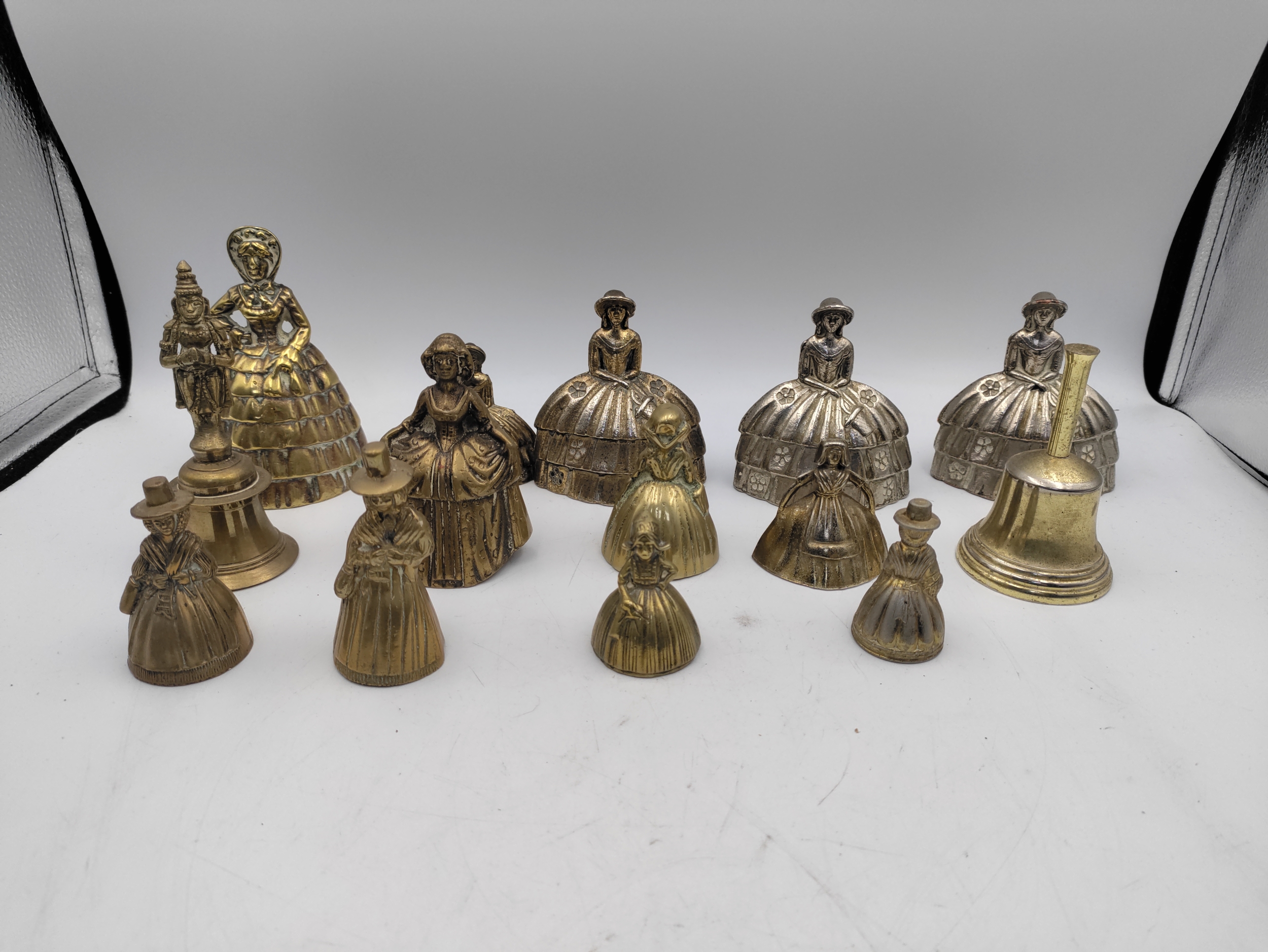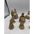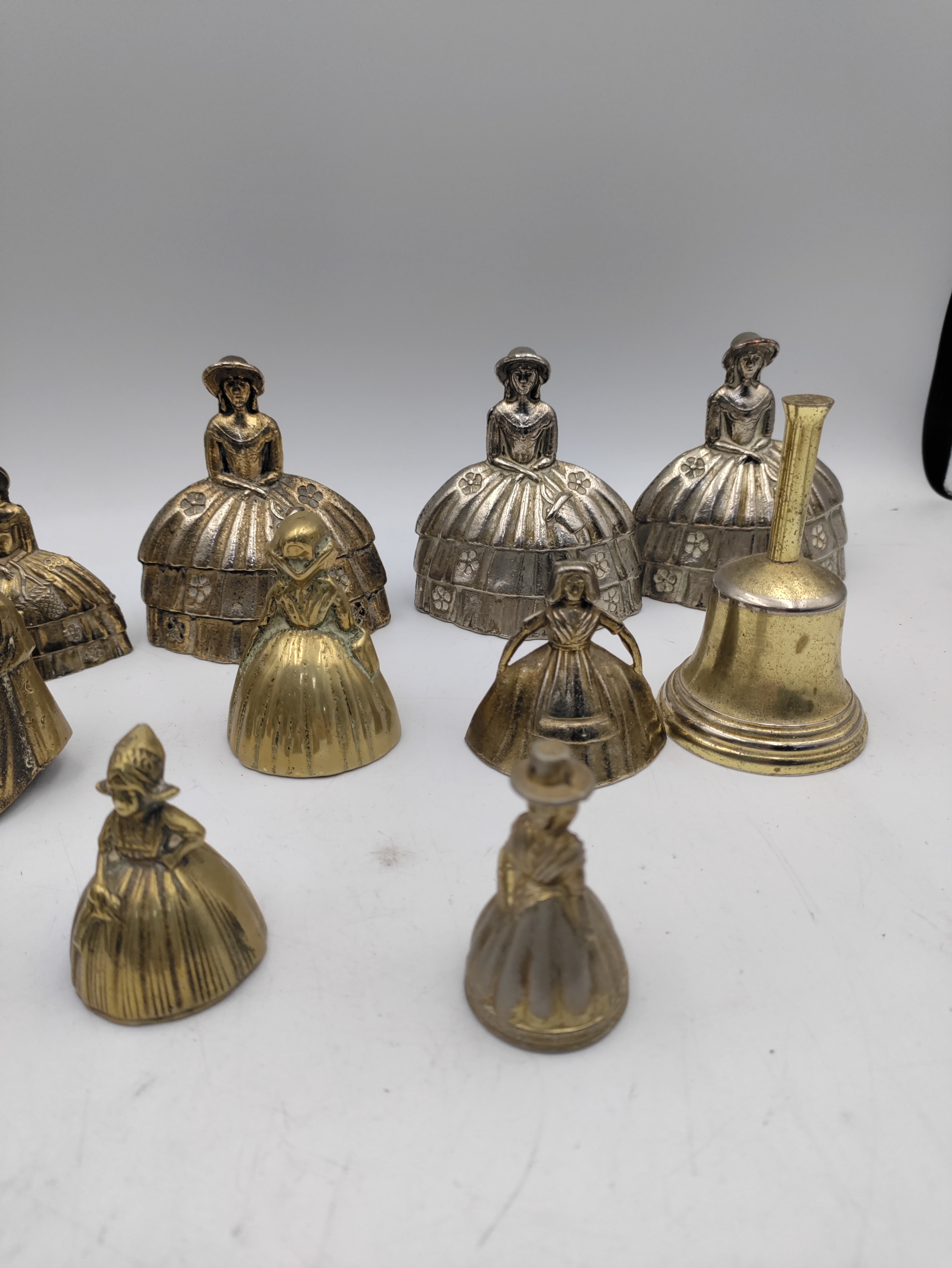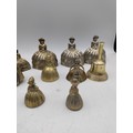 A collection of 14 brass crinoline lady bells & other brass bells.