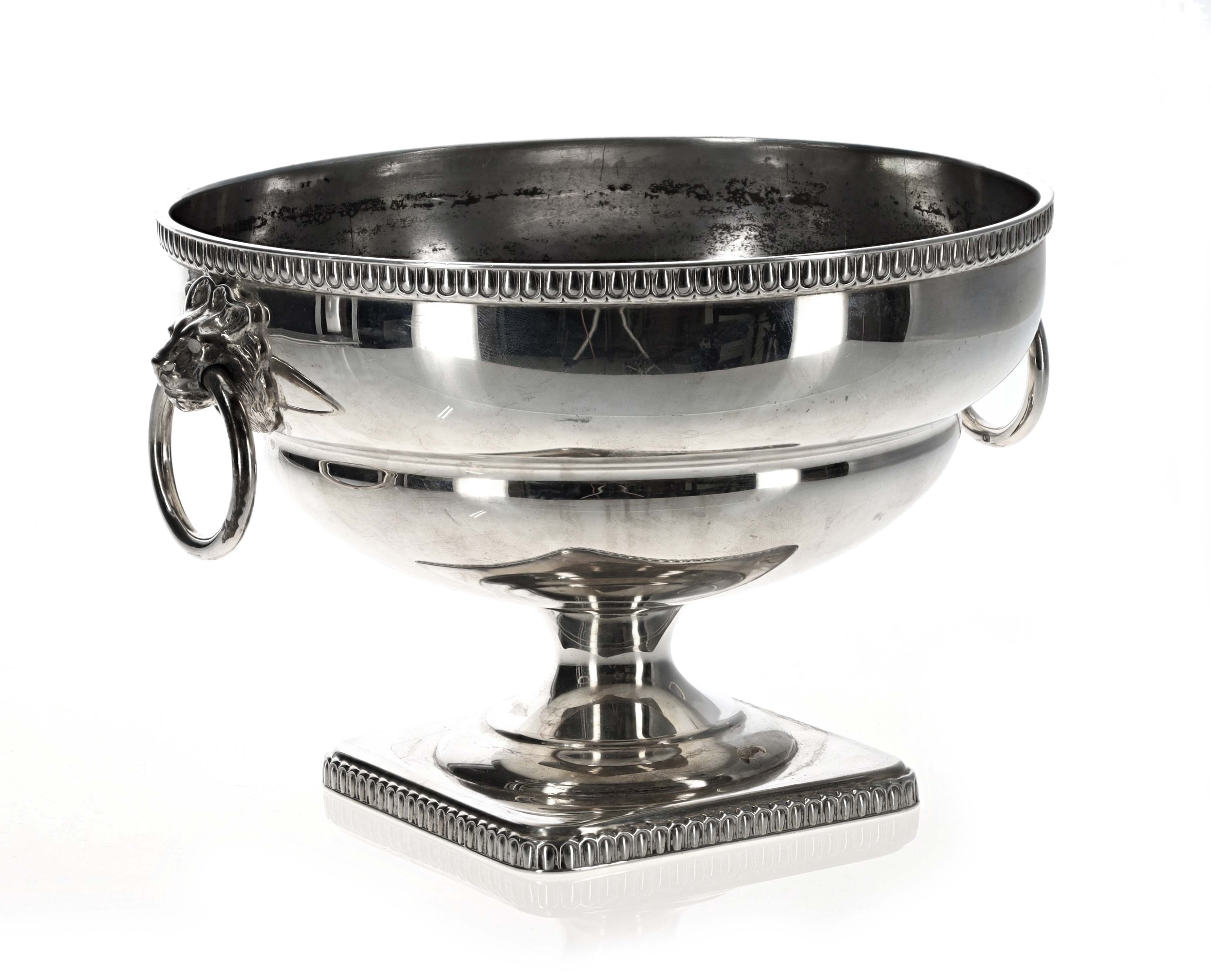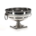 George V silver pedestal rose bowl, having gadrooned rim and pedestal borders, with two lion mask and ring handles, maker Atkin Brothers, Sheffield 1911, 8" wide, 4.5" diameter, 17oz t