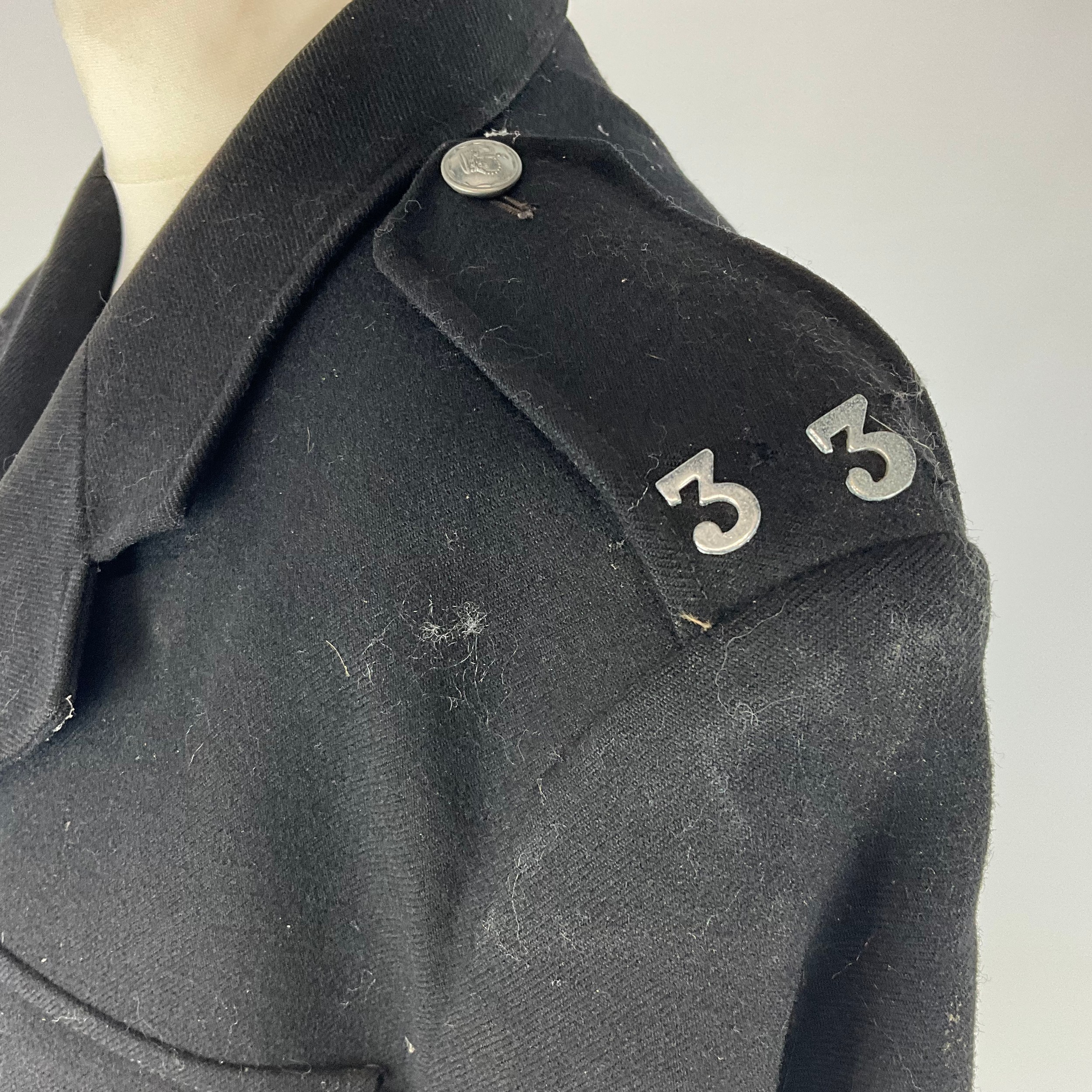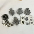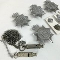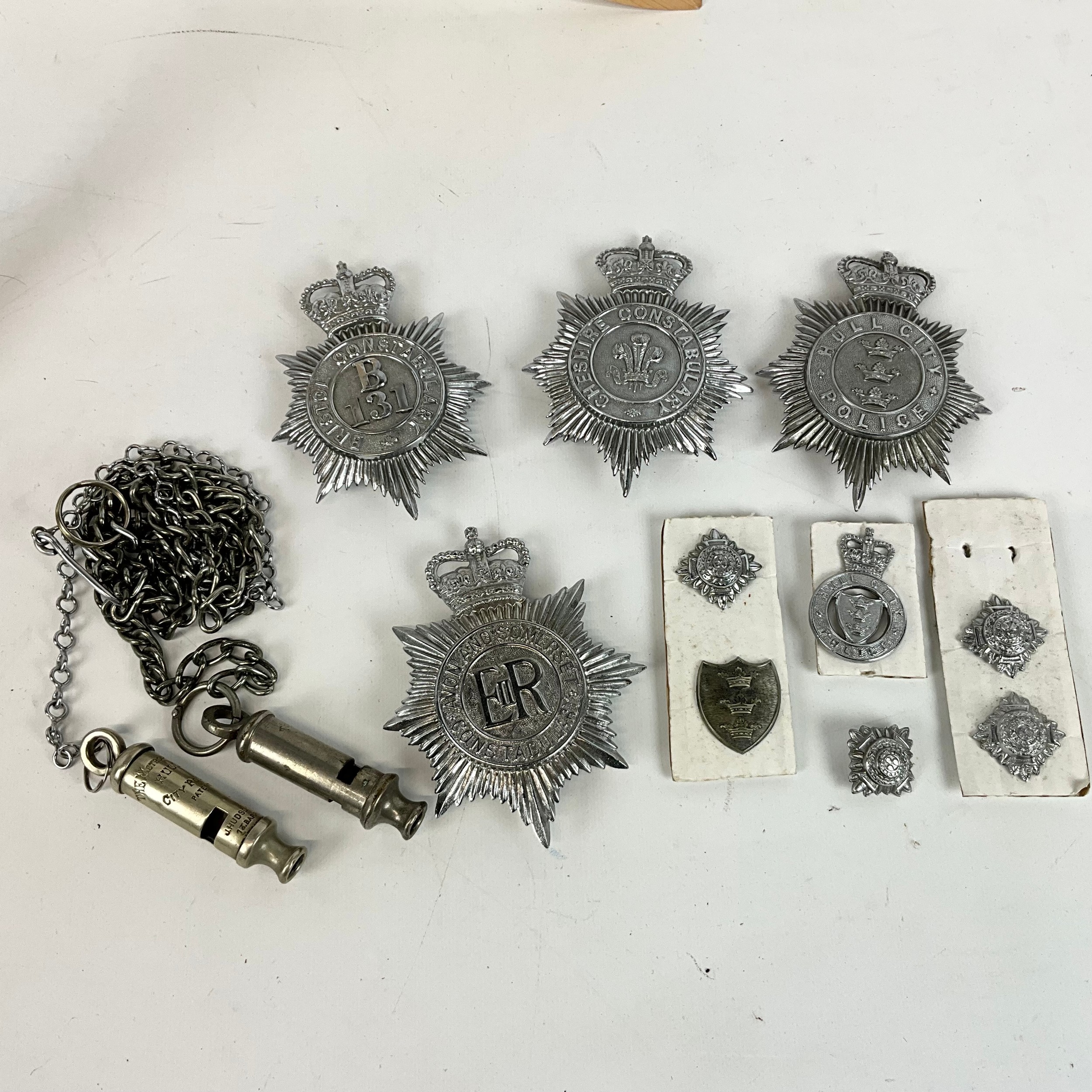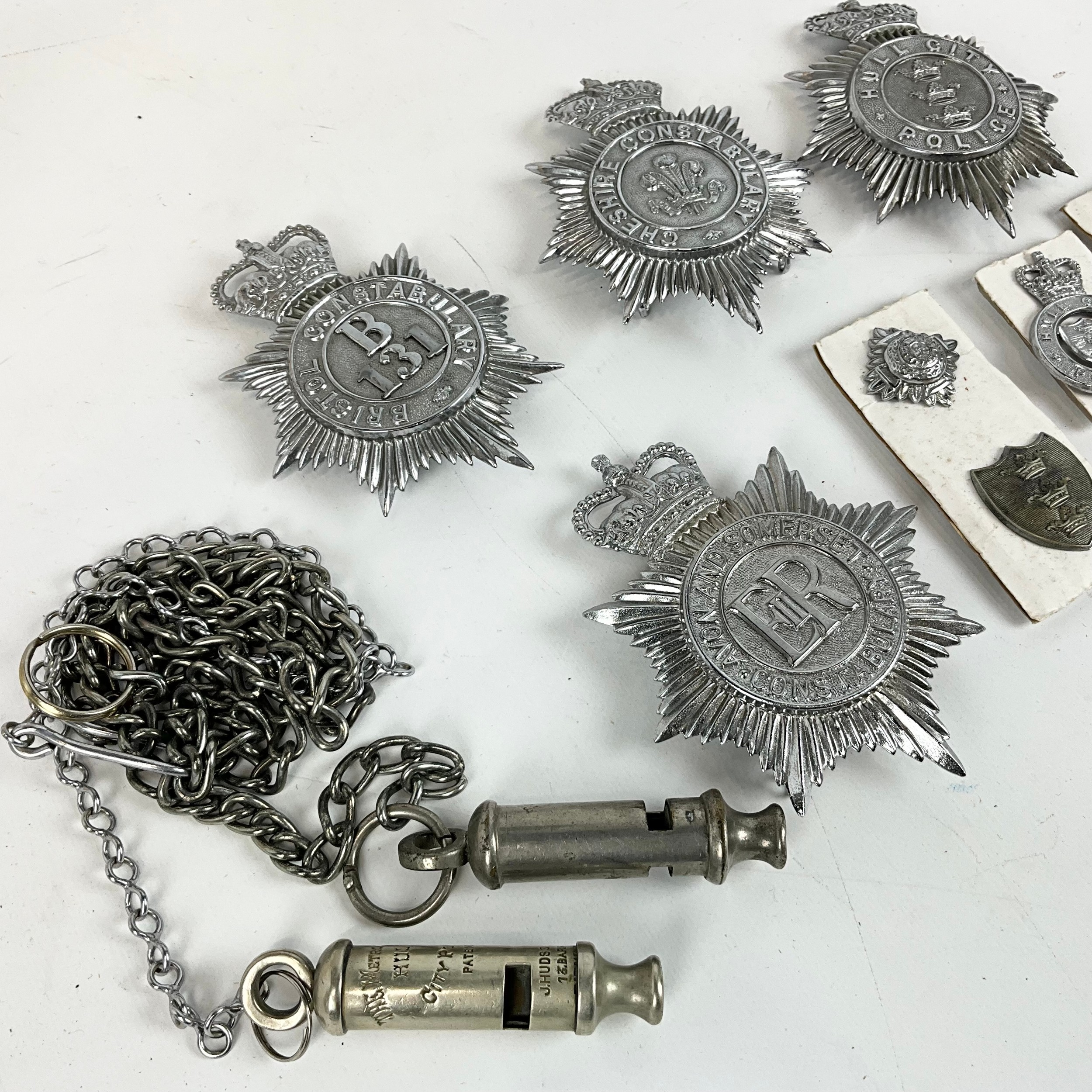 A Police Constable jacket with numbers on the shoulder, a collection of cap badges, including the Bristol Constabulary, Avon and Somerset Constabulary, Hull City Constabulary, and Cheshire, various policing badges, and two metropolitan patent whistles, one marked for Hull.