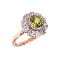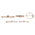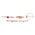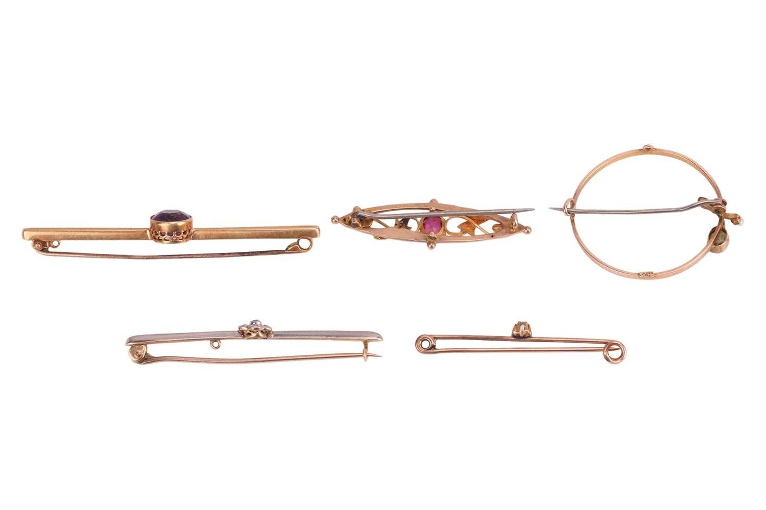 A collection of five gem-set brooches; comprising an amethyst-set bar brooch, in yellow metal marked ‘15ct’, a diamond-set floral bar brooch, in bi-colour metal mount, surface tested as 14ct, a diamond-set bar brooch, with a single old-cut diamond centrally-set, in rose metal surface tested as 9ct, a 9ct gold brooch, set with a pink doublet and seed pearls, and a peridot and seed pearl circle brooch, in yellow metal stamped ‘9ct’, 12.3 grams. (5). Please note: Unless otherwise stated, lots have been tested using an electronic tester. This is a surface test only and is not a guarantee of metal purity.