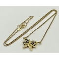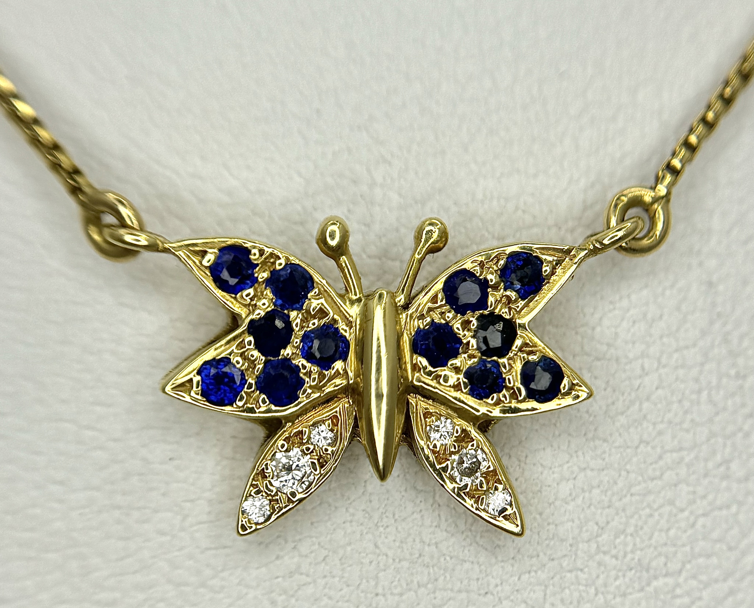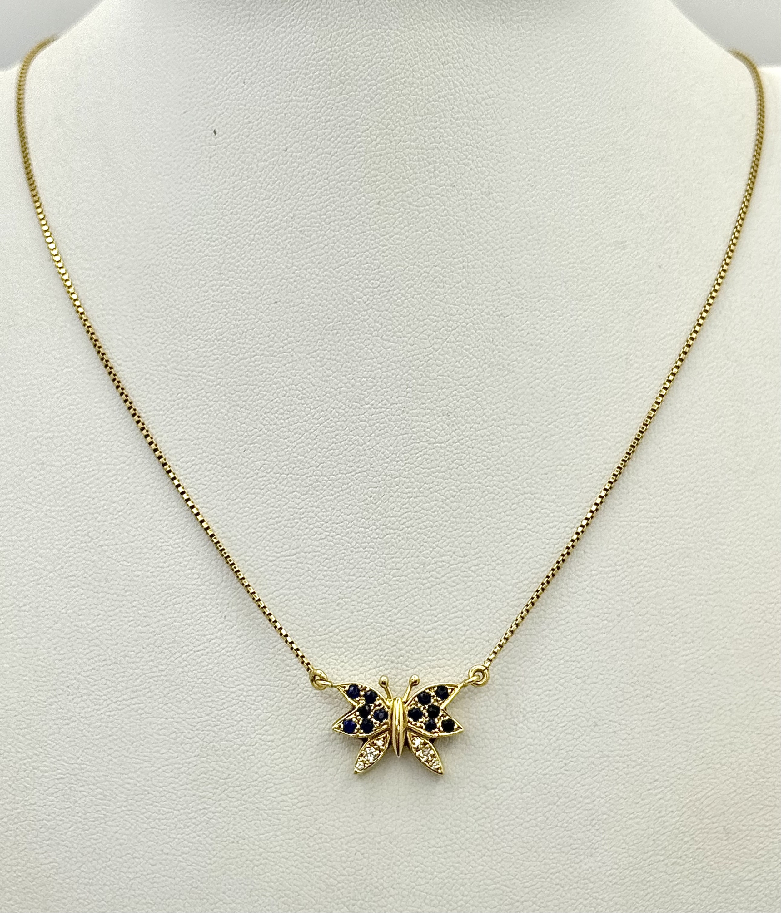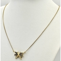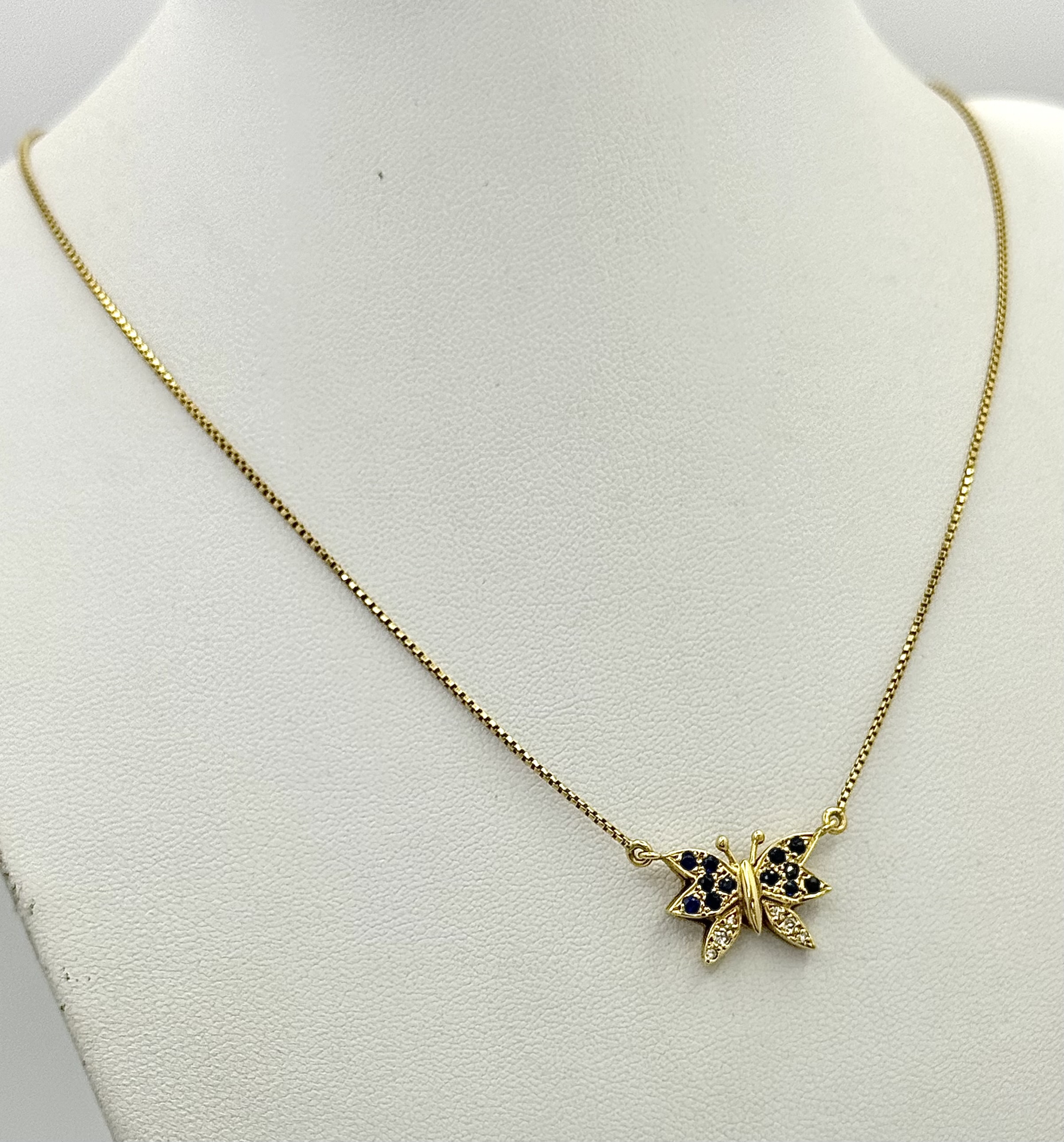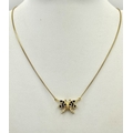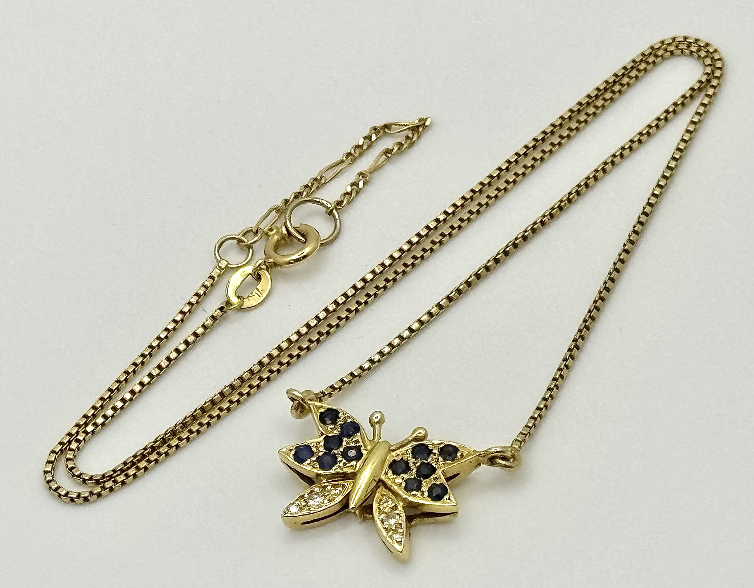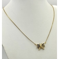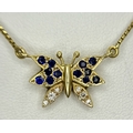 A 18K YELOW GOLD DIAMOND & SAPPHIRE SET BUTTERFLY PENDANT ON CHAIN. TOTAL WEIGHT 5.8G. TOTAL LENGTH 40.5CM. TAN 7007