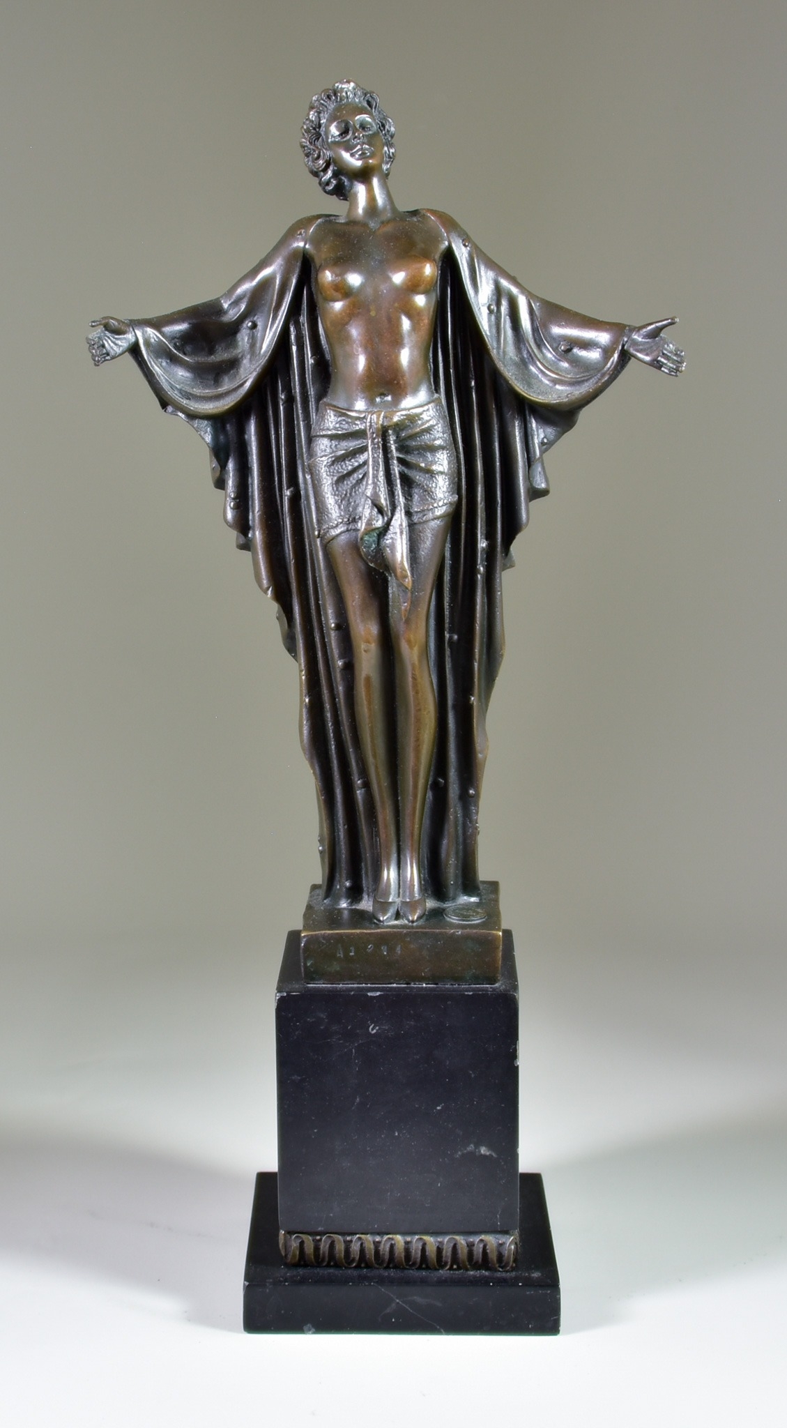 After Dimitri H. Chiparus (1886-1947) - Bronze - Standing figure of a half nude lady, garbed in open robe, signed, foundry mark to base, on square stepped socle, 18ins high overall
