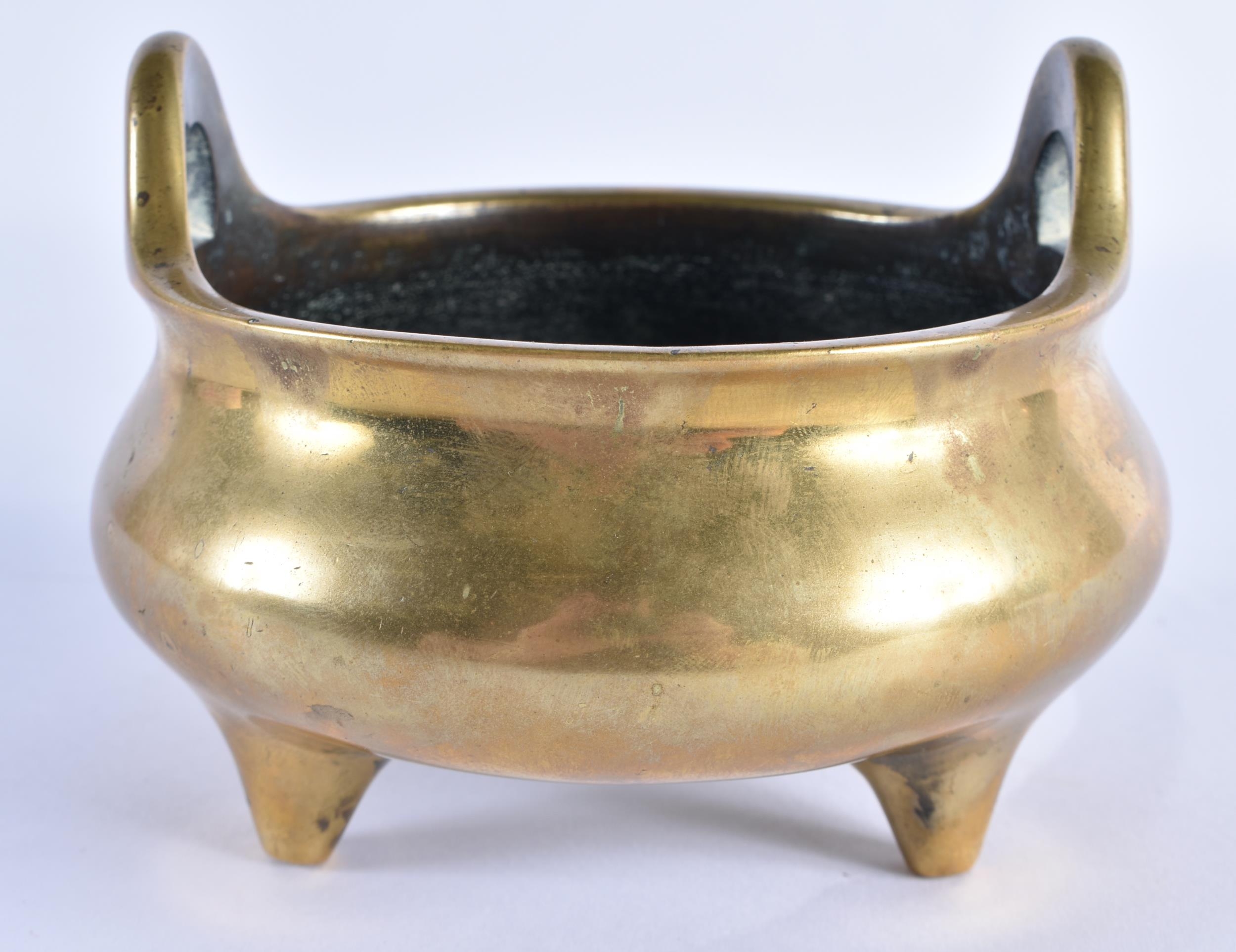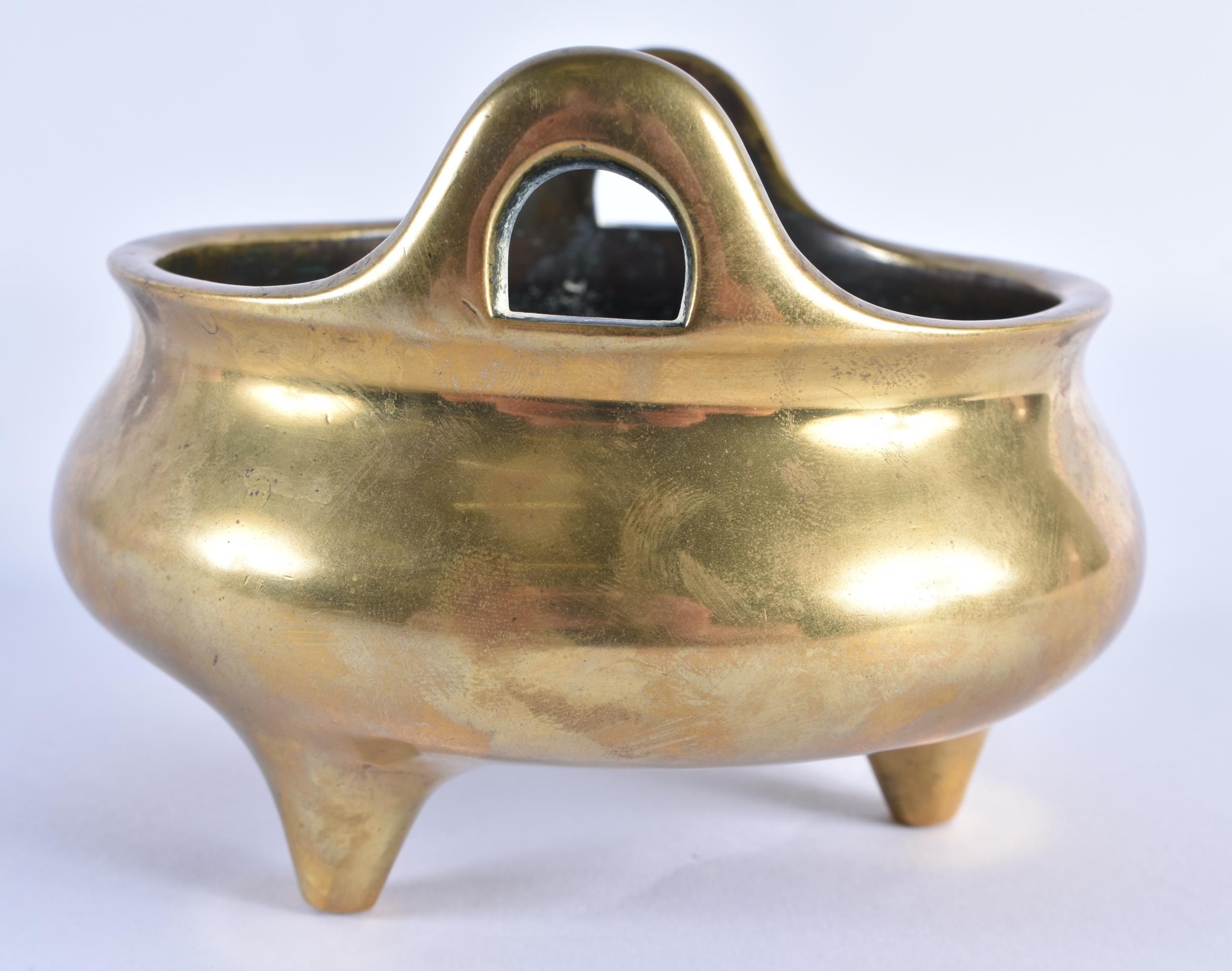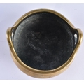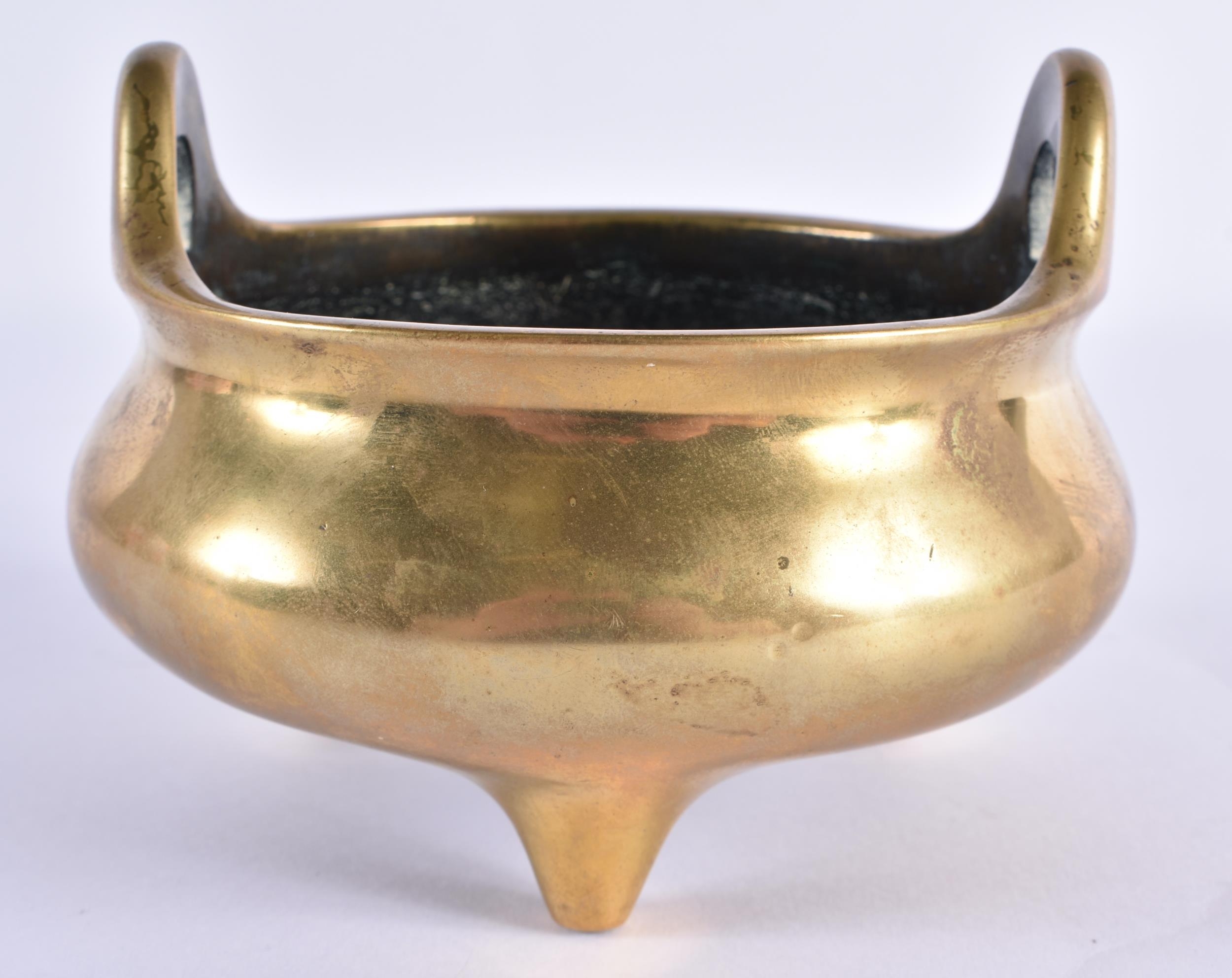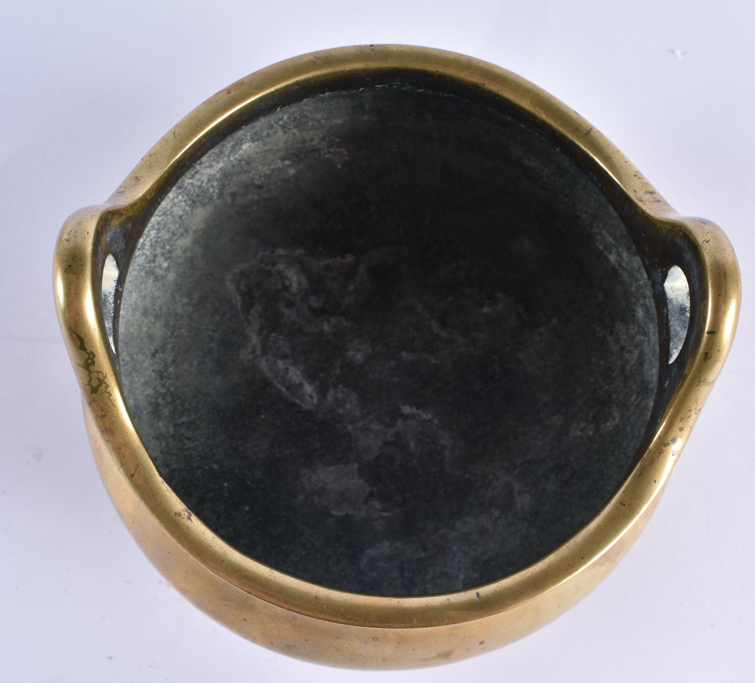 AN 18TH CENTURY CHINESE TWIN HANDLED BRONZE CENSER with high loop handles, bearing Xuande marks to base. 729 grams. 12.5 cm wide, internal width 10 cm.