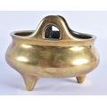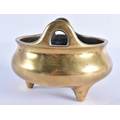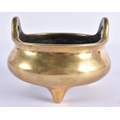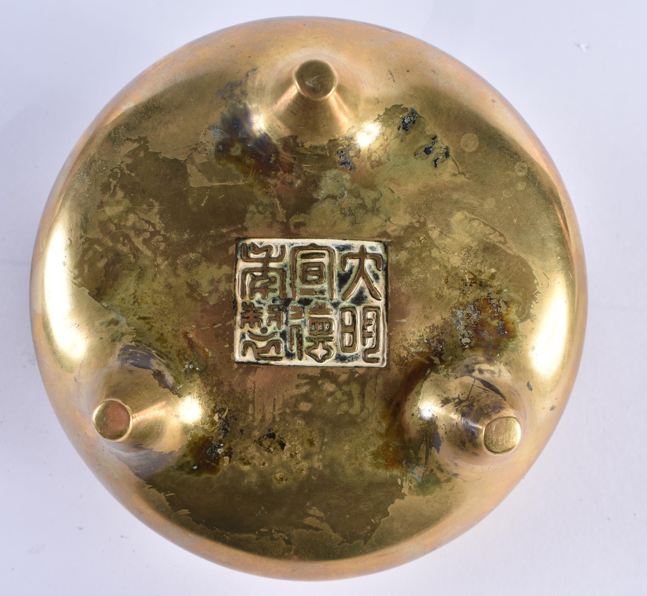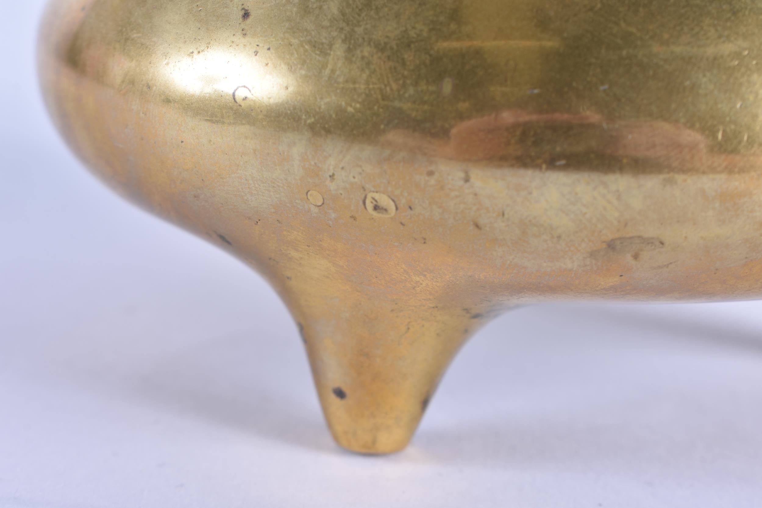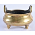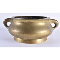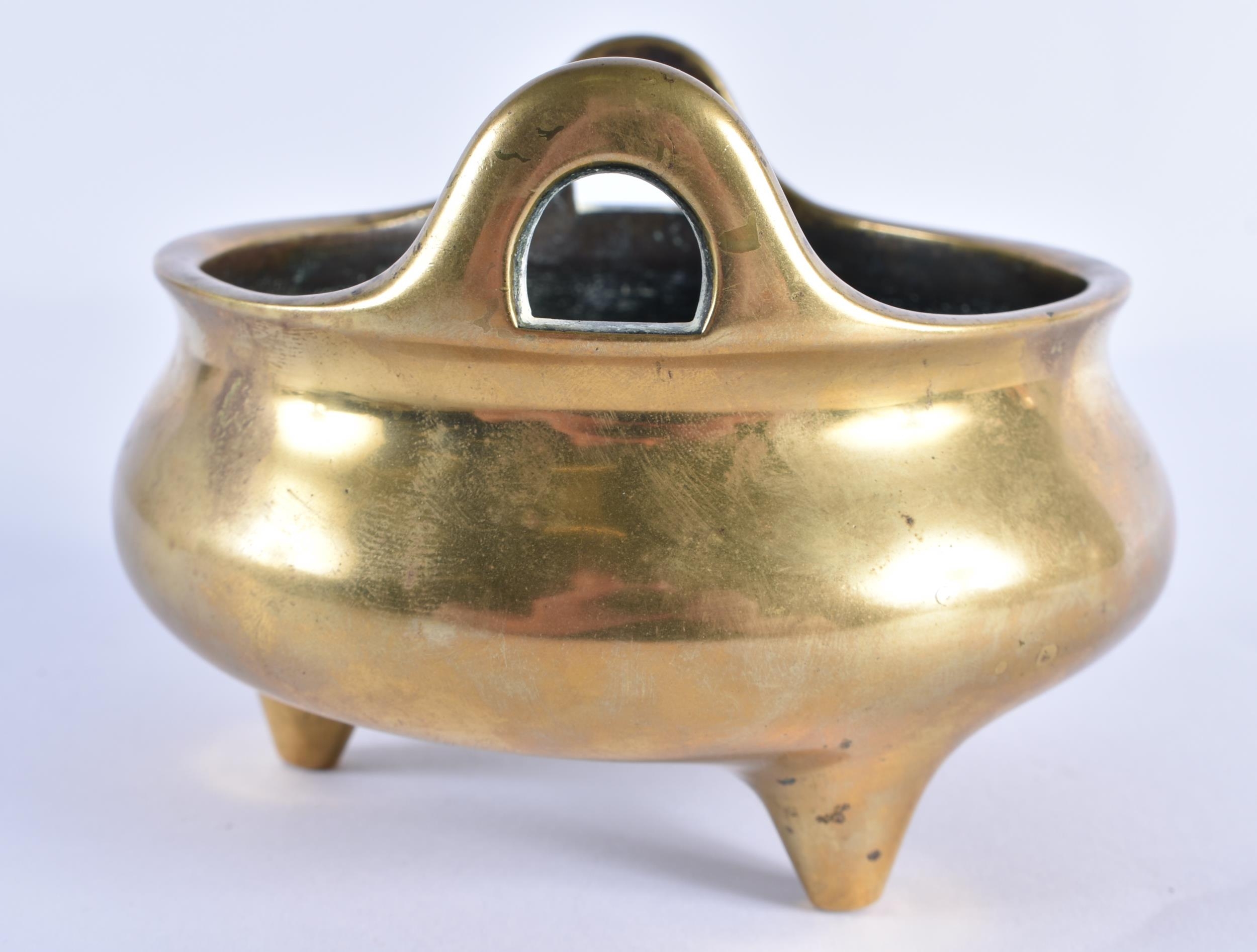 AN 18TH CENTURY CHINESE TWIN HANDLED BRONZE CENSER with high loop handles, bearing Xuande marks to base. 729 grams. 12.5 cm wide, internal width 10 cm.
