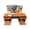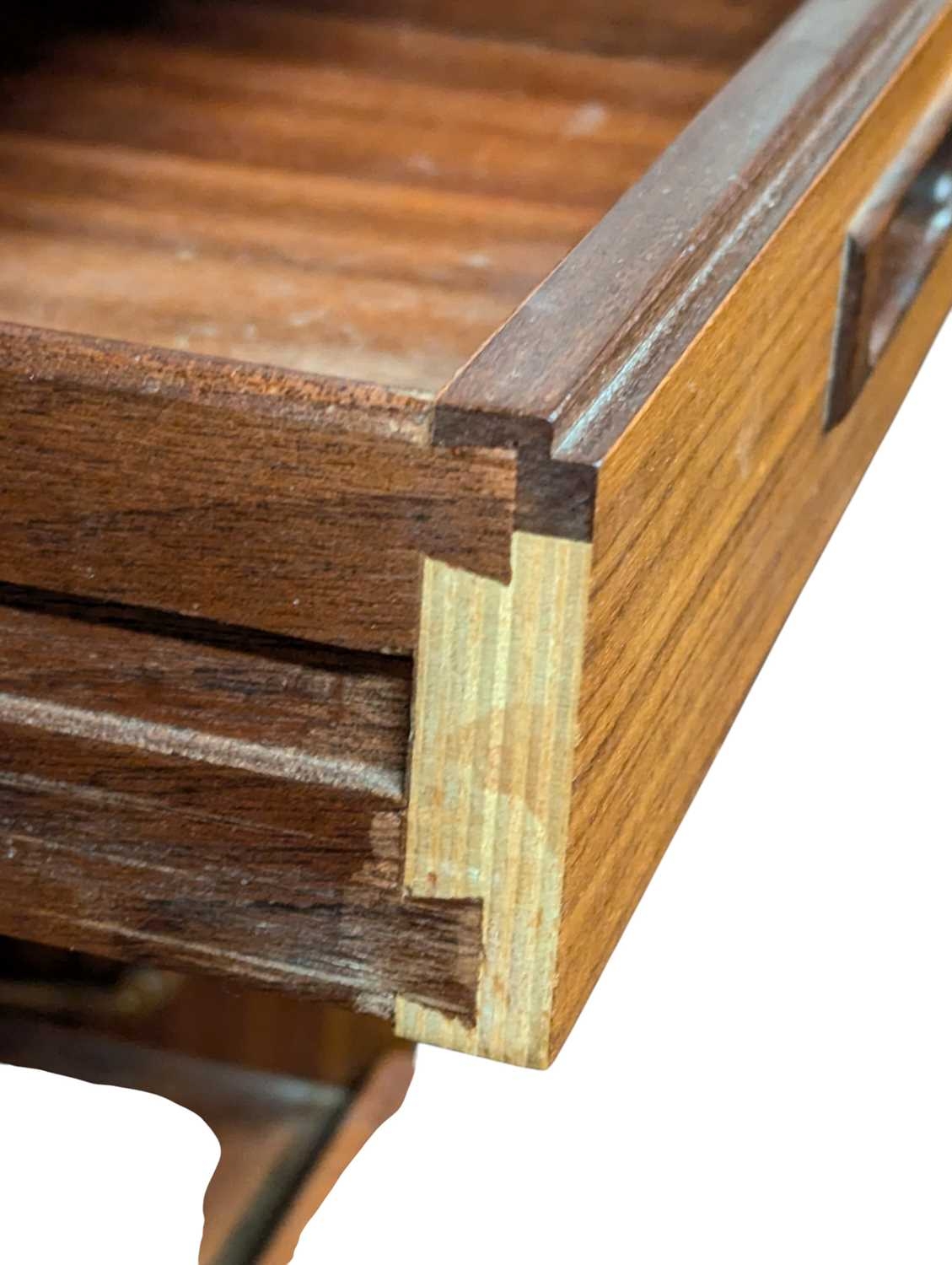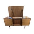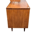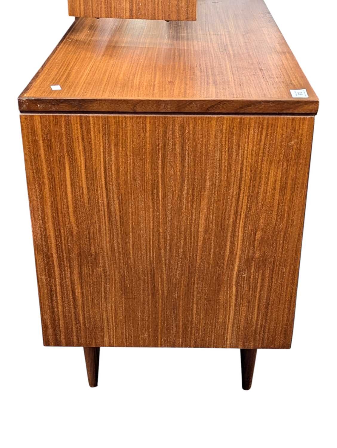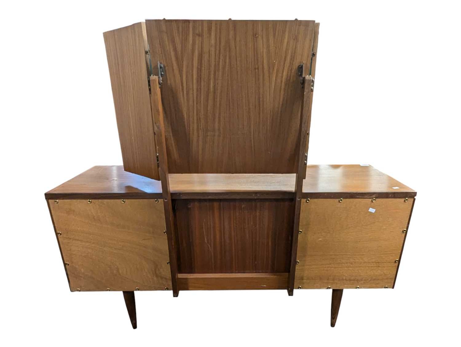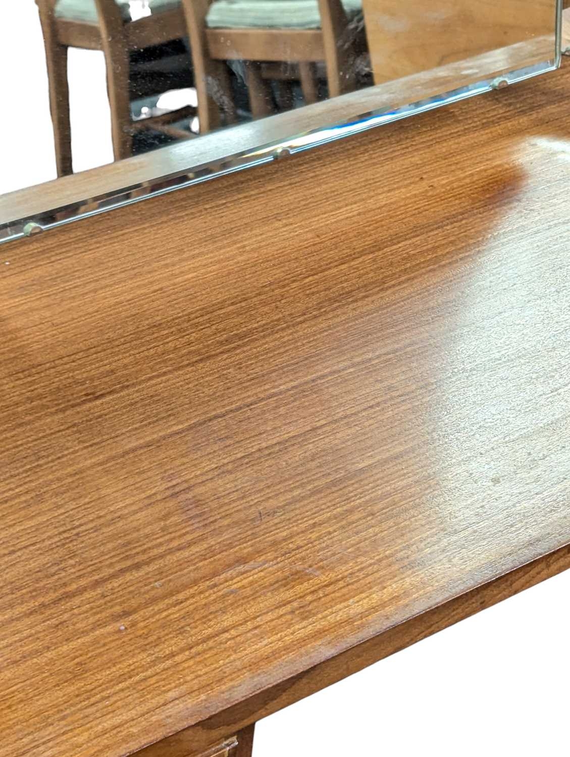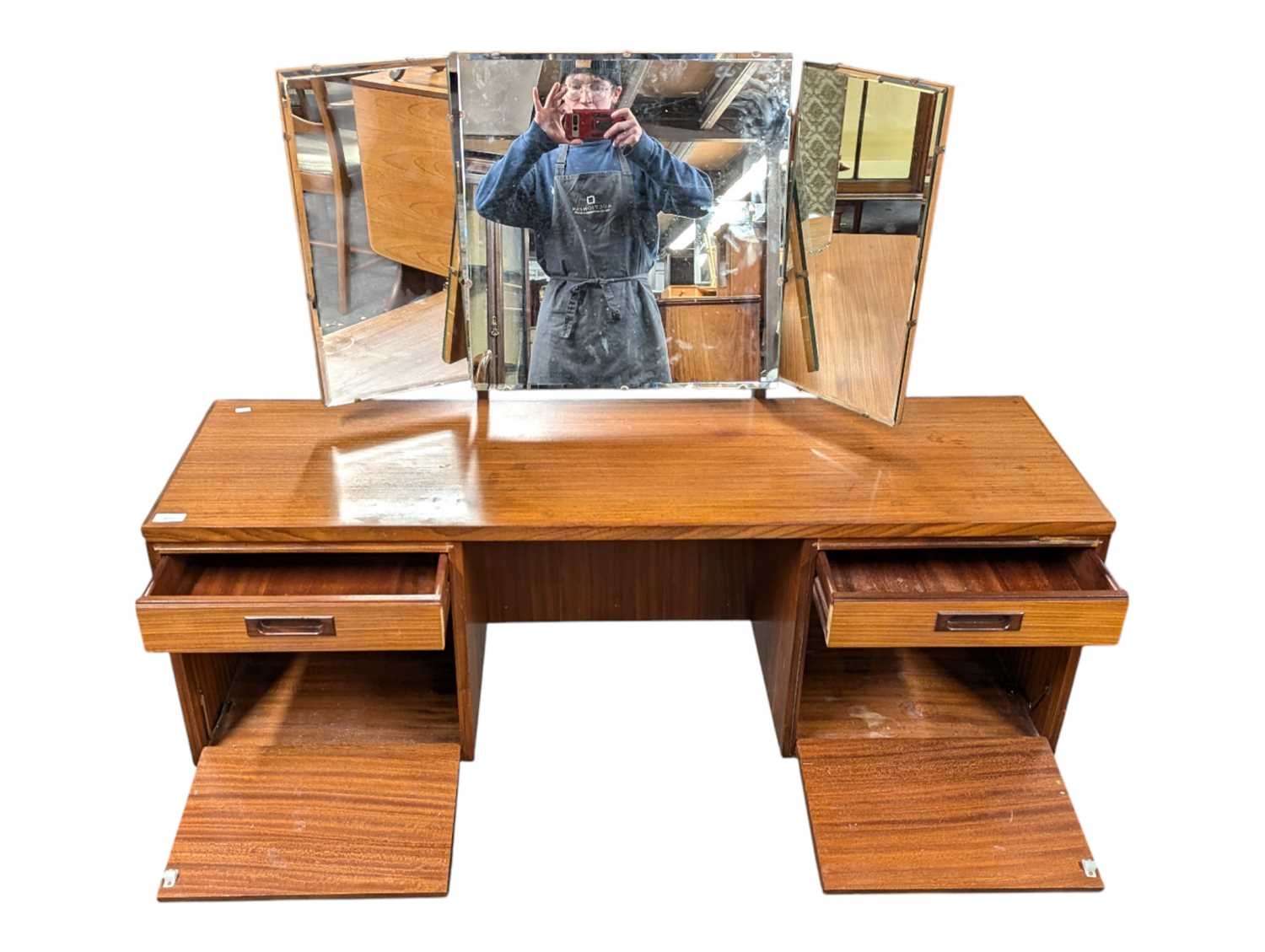 White & Newton Furniture - Vintage mid 20th century teak dressing table. Knee hole centre flanked by a bank of graduating drawers with triptych mirror atop. All raised on tapering circular legs.
