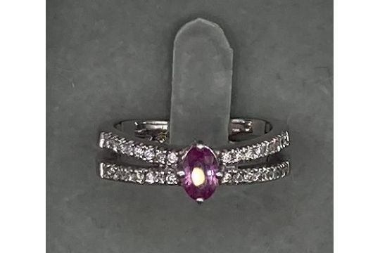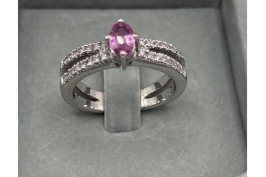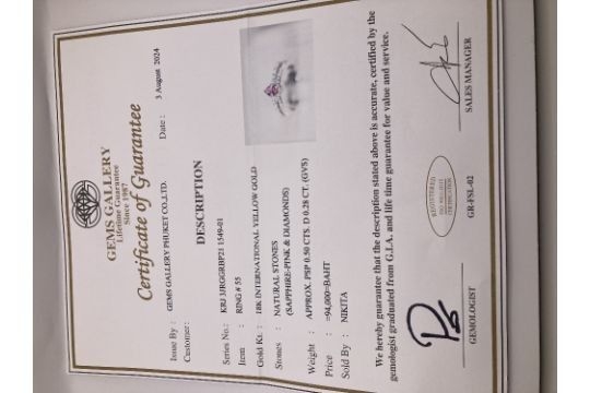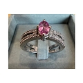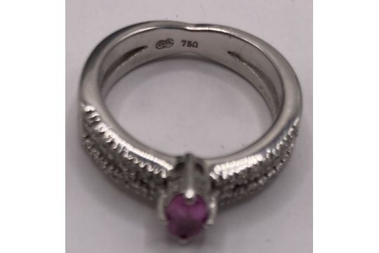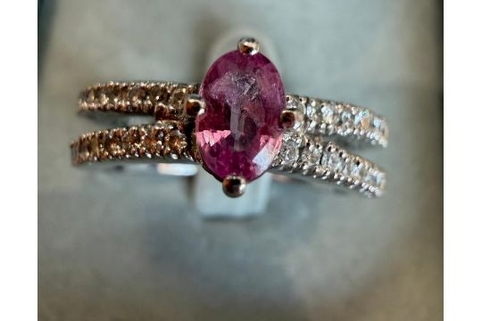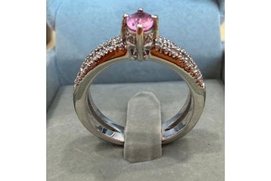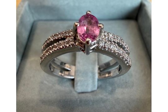 Jewellery : Very fine 18ct White Gold Diamond and Sapphire ring marked 750 , comes with original certificate, very fine item, size N (7.3g). This is a fantastic ring and not to be missed. 40 small diamonds, plus pink sapphire 7mm x 4mm . This is a fantastic ring and not to be missed. This would surely cost £1500 plus in a London shop ! PLEASE MAKE SURE YOU READ TERMS AND CONDITIONS REGARDS PAYMENT OPTIONS, CARD NOT PRESENT TRANSACTIONS NOT ACCEPTED ON GOLD JEWELLERY OR WATCHES.