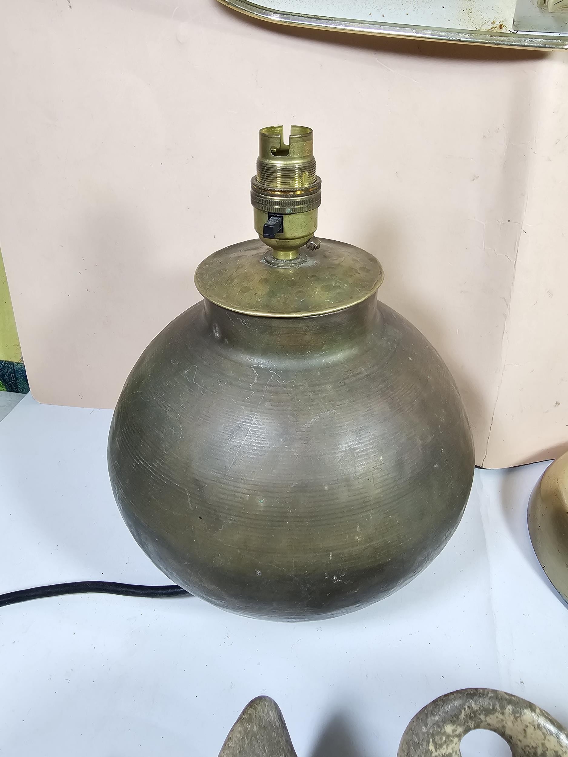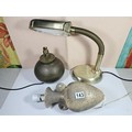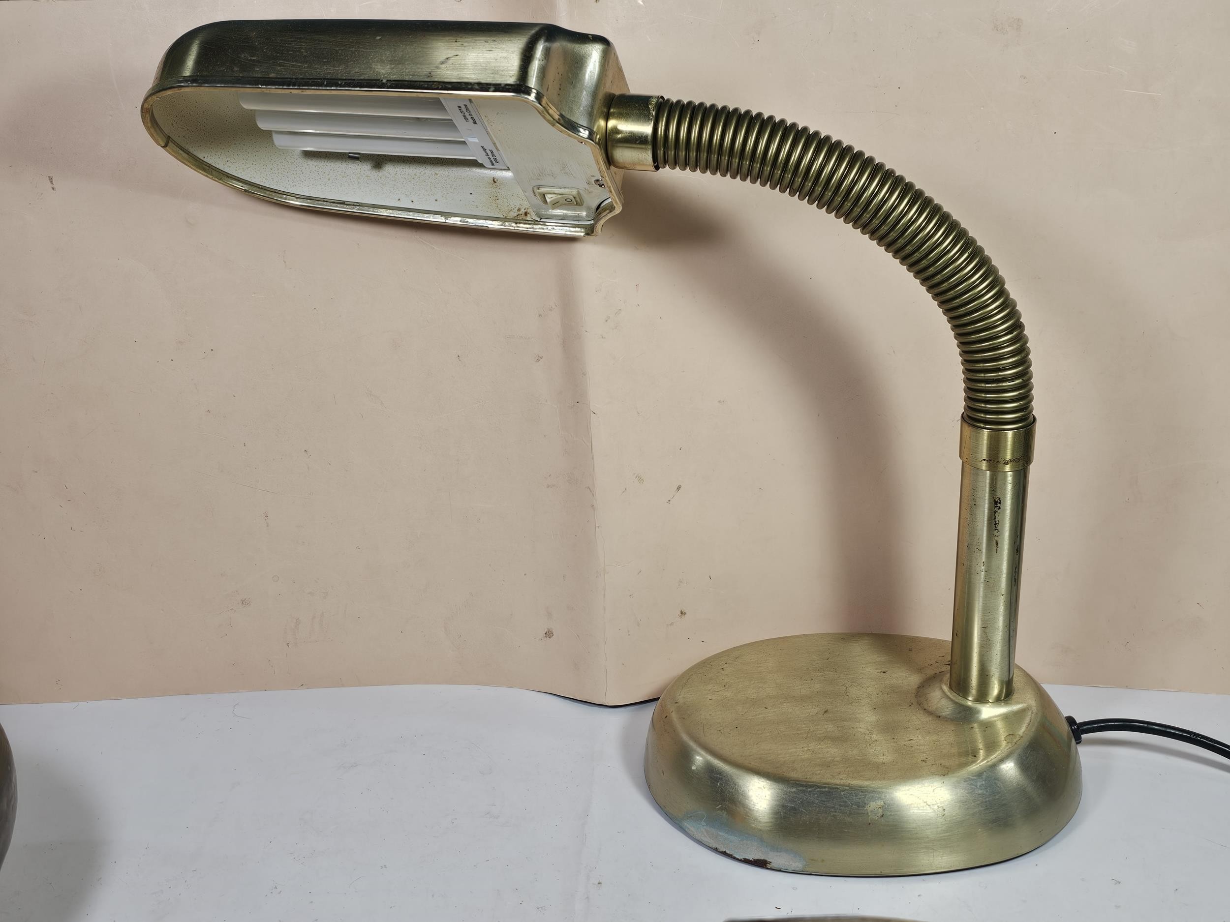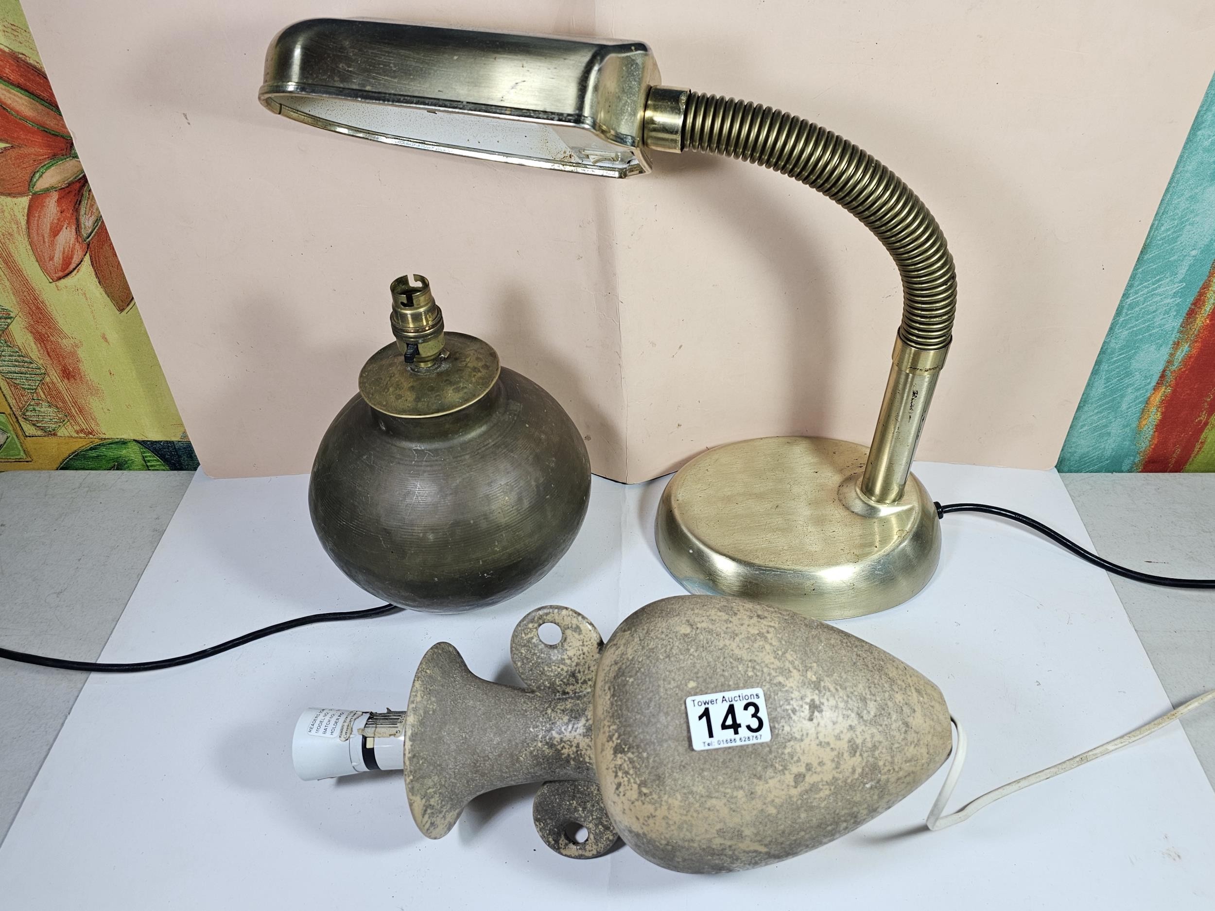 A collection of three lights to include a brass table top light with a flexible neck, a brass lamp with a bulbous base along with a ceramic light in the form of a ship wreck urn, the urn has a length of 29cm