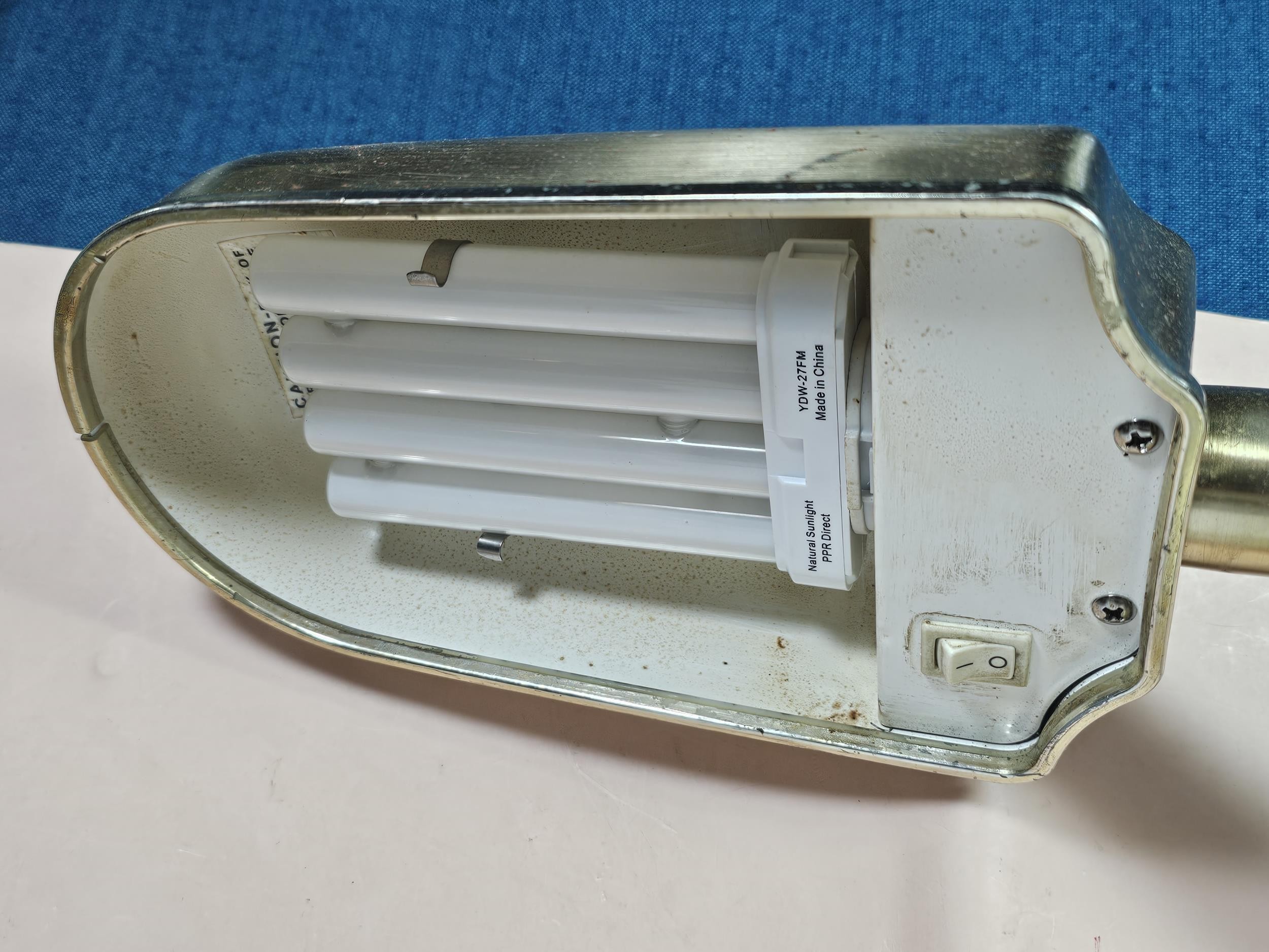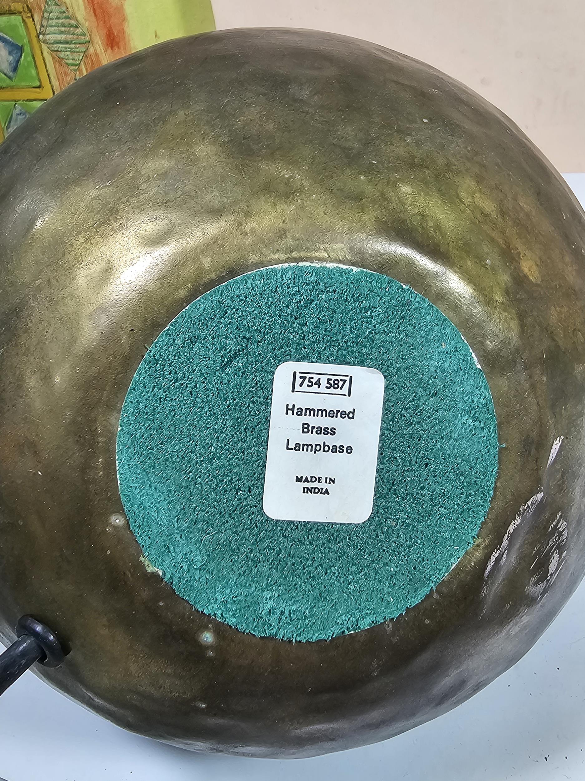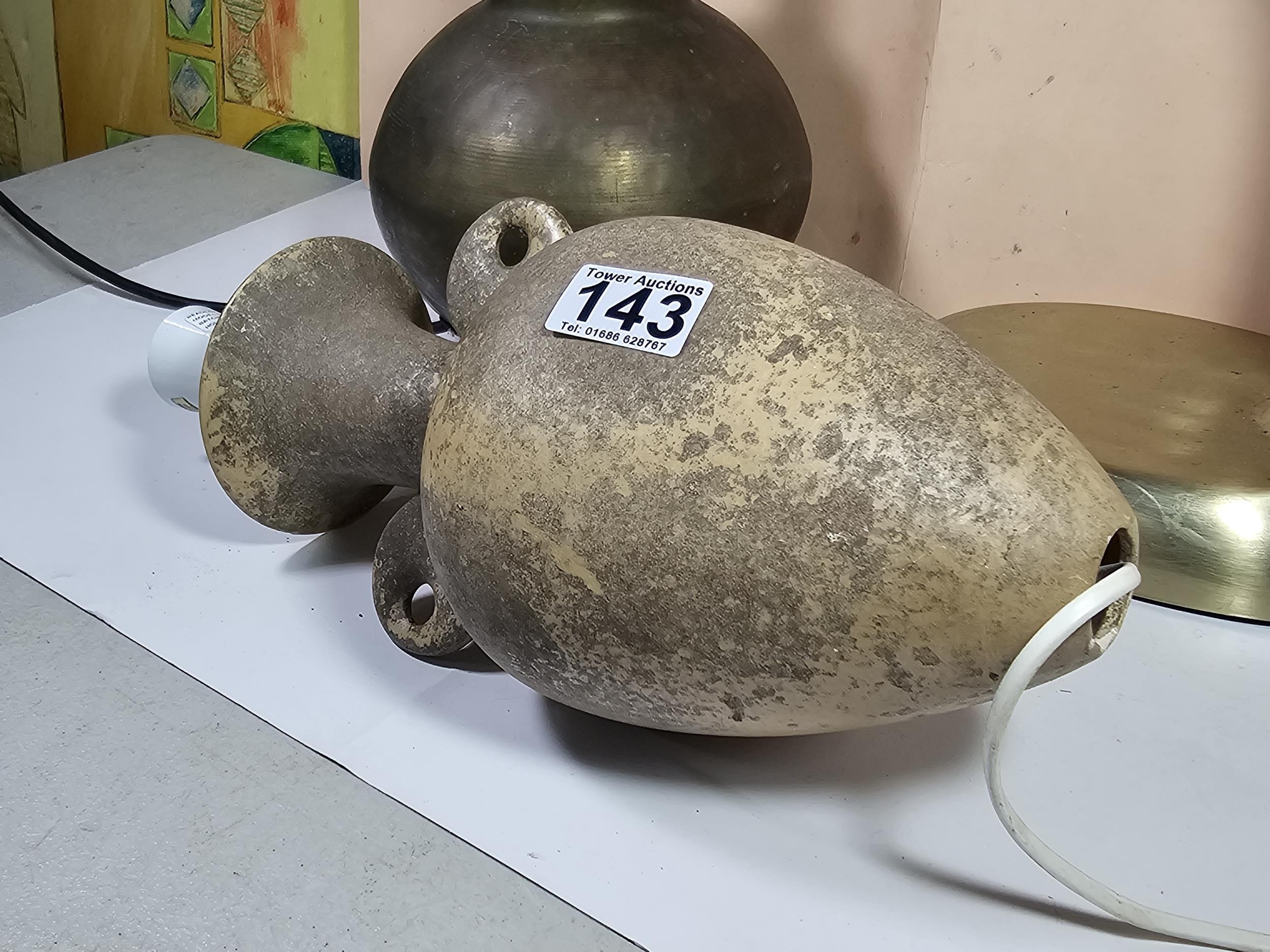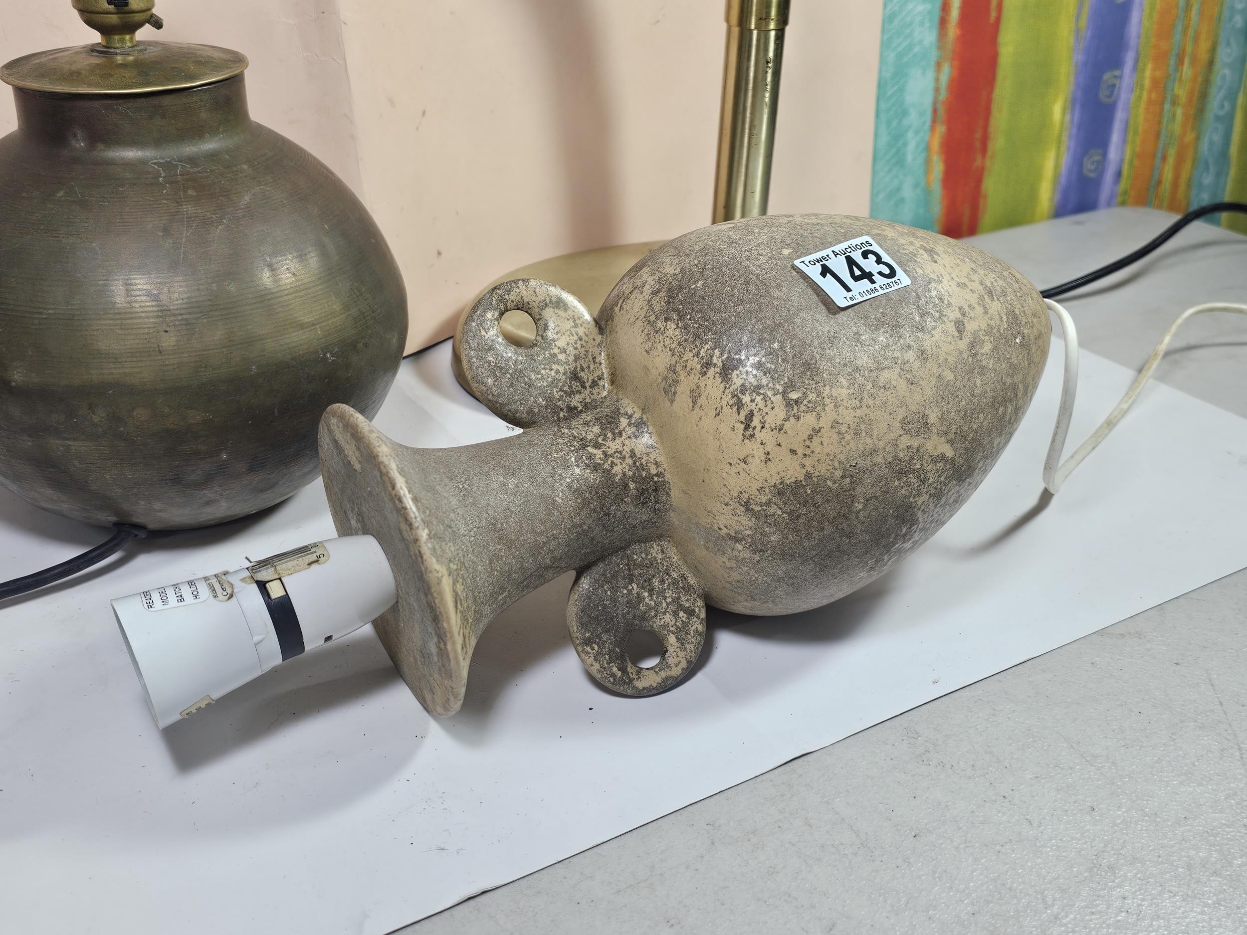 A collection of three lights to include a brass table top light with a flexible neck, a brass lamp with a bulbous base along with a ceramic light in the form of a ship wreck urn, the urn has a length of 29cm