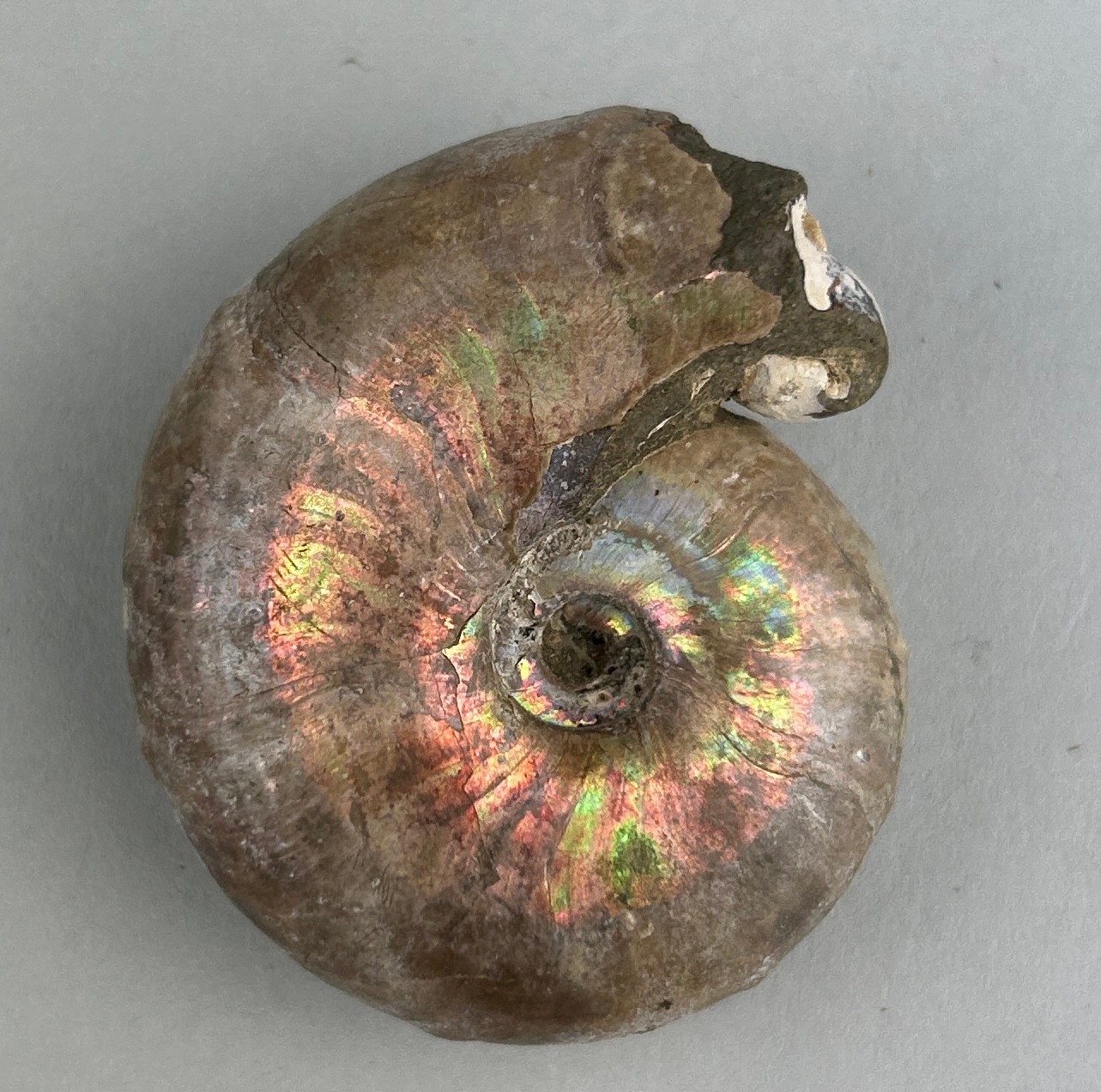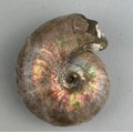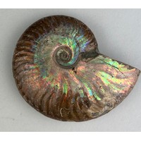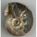 Ammonite From the Majunga Basin, Madagascar. Gastropod snail has washed into the aperture of the ammonite. Natural shell displaying striking flashes of blue, green and pink. Cretaceous period circa 100 million years old.
