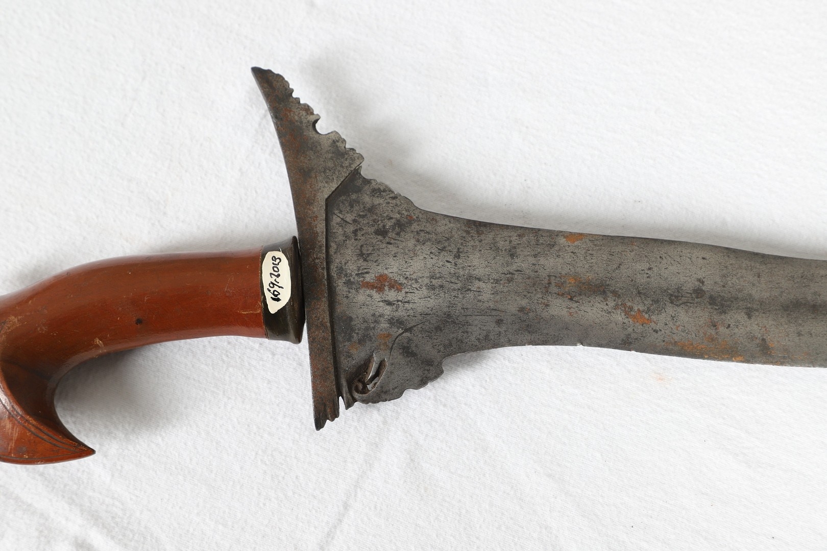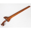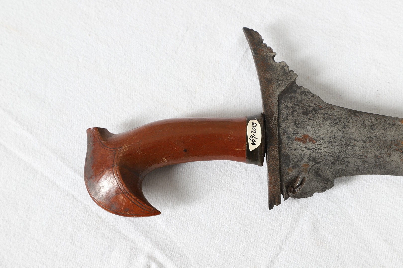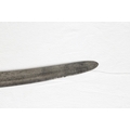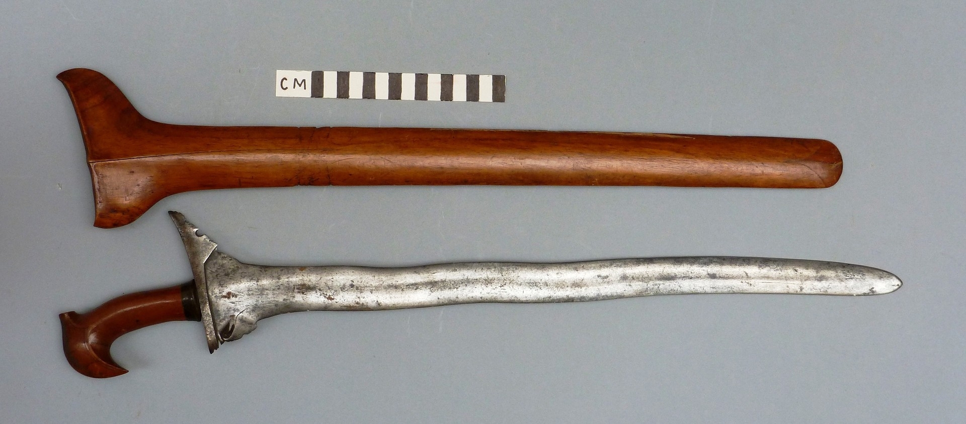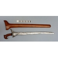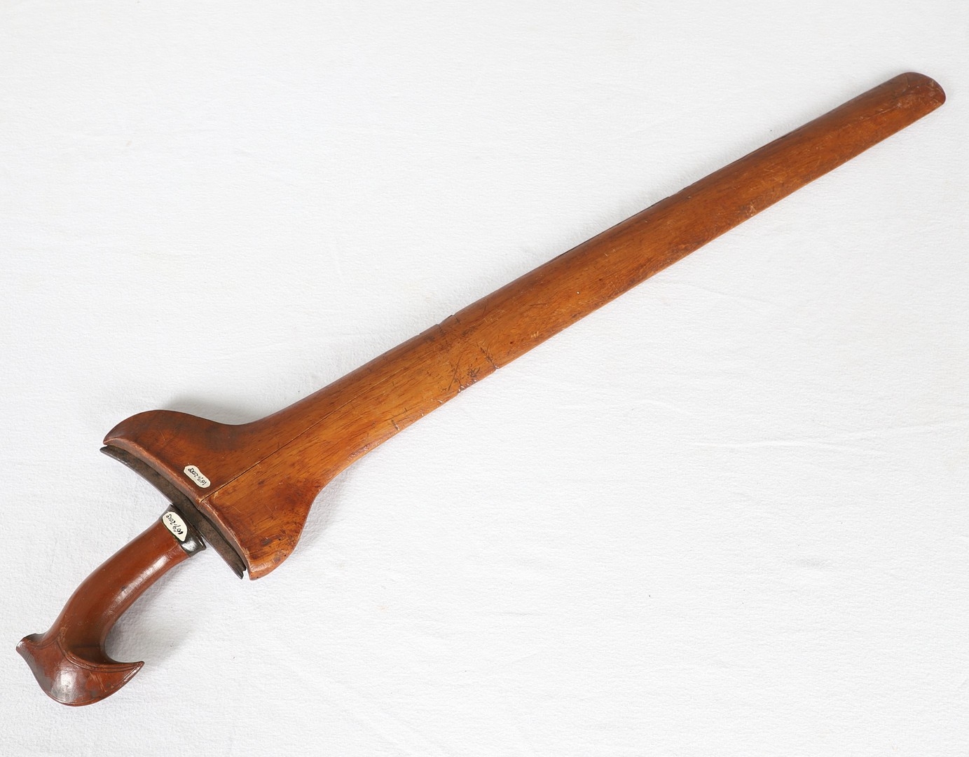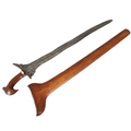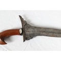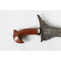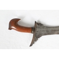 A PHILIPPINES KRIS SUNDANG AND SCABBARD. The 53 cm blade with six or seven faint curves and a central fuller, the cross piece with a decorated edge. On a wooden grip with a hooked pommel. In a plain wooden scabbard in the 'Sandang Wakikat' style. 68 cm.