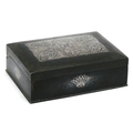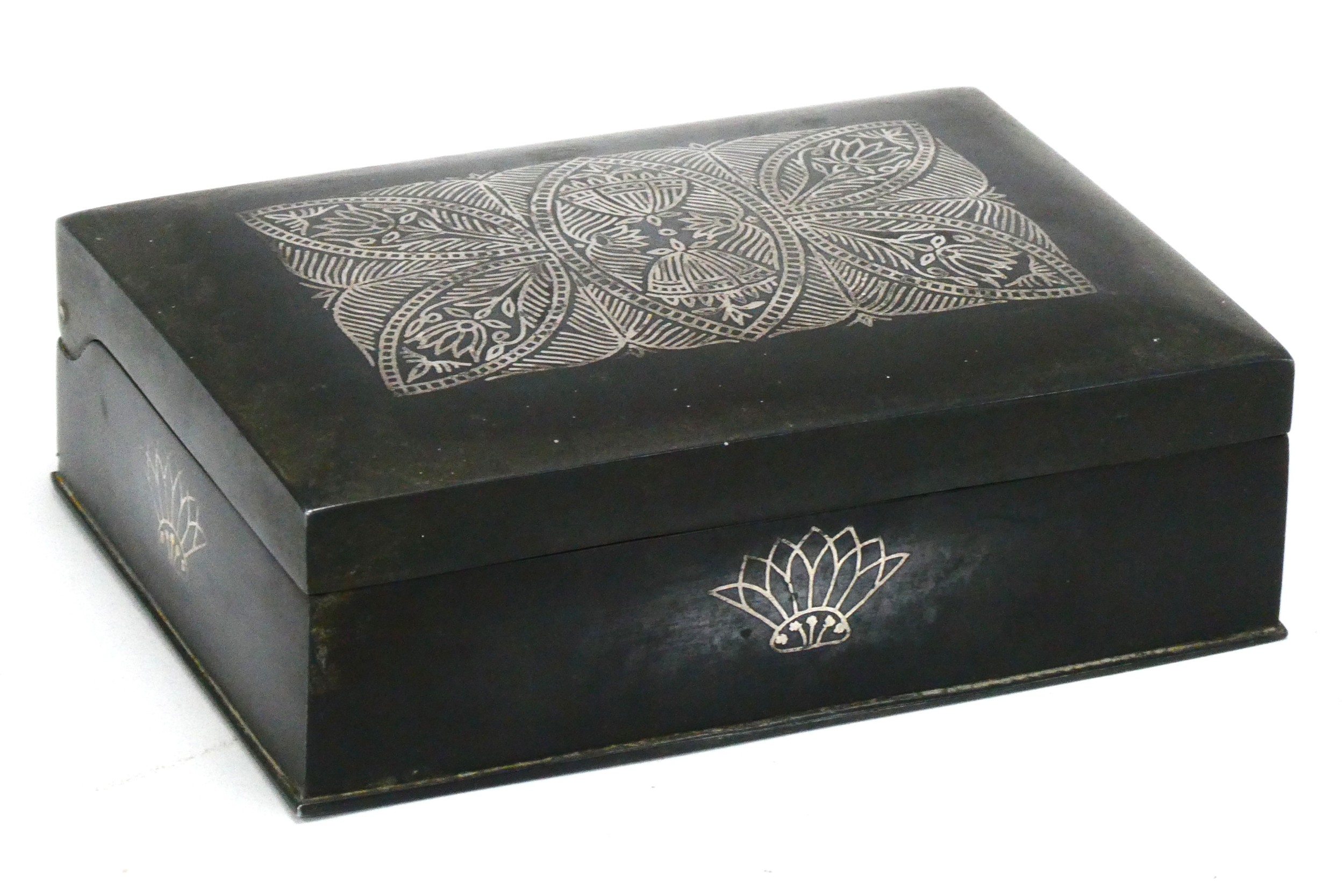 Heavy Metal Trinket Box, circa early XX Century, with silvered symmetrical design to lid and fanned decoration to sides, 12.5cm wide.