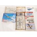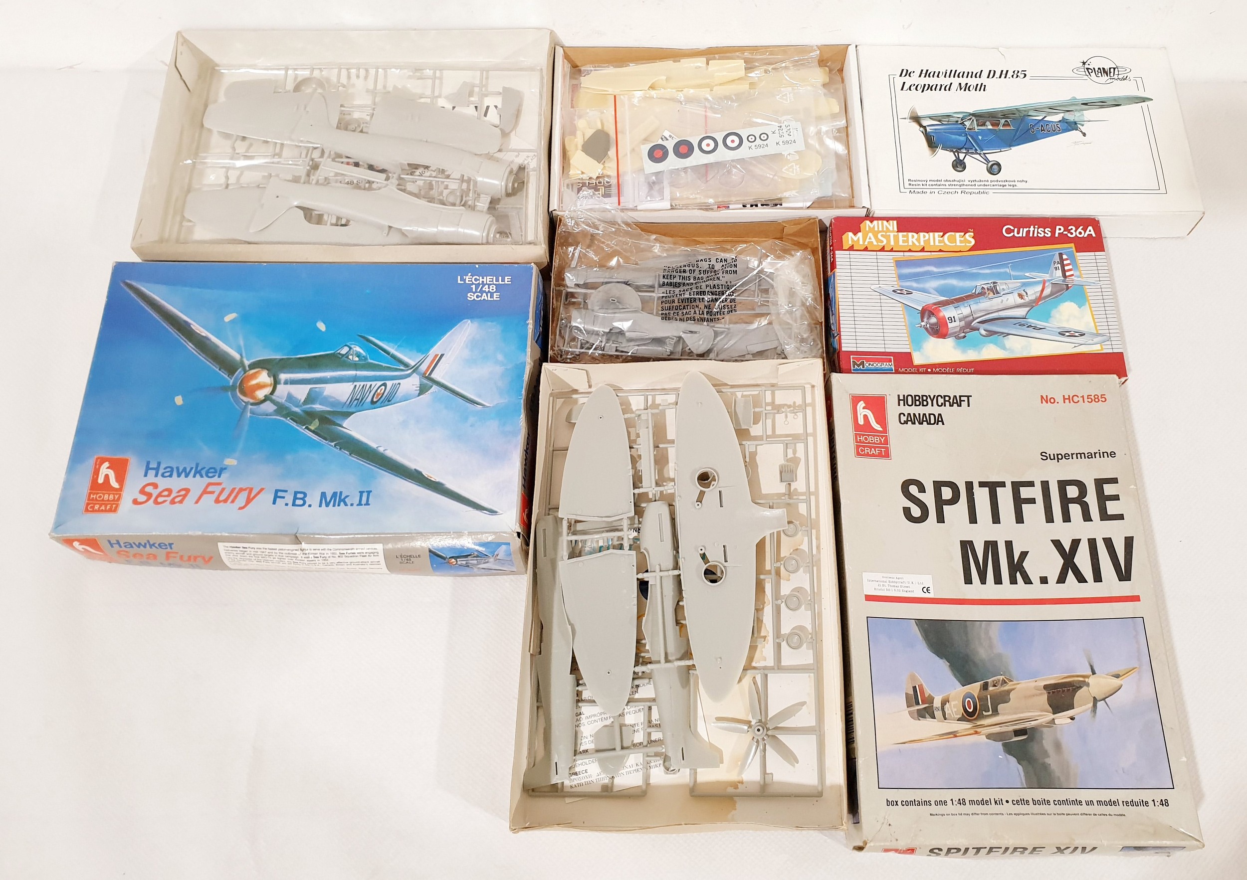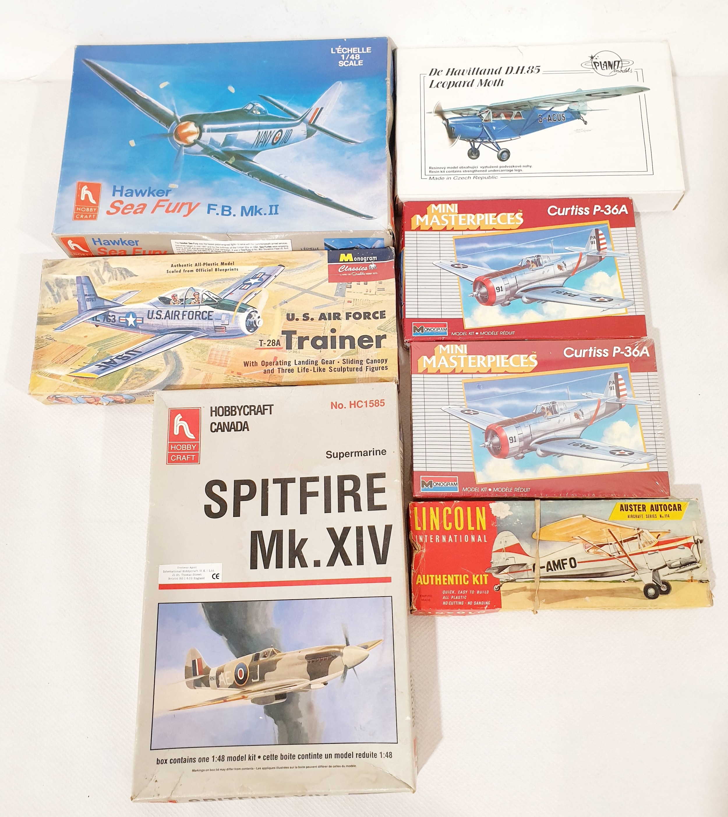 Three 1:48 scale model plane kits 'De Havilland DH85', 'Hawker FB MkII' & 'Spitfire MkXIV' with 4 US model plane kits.