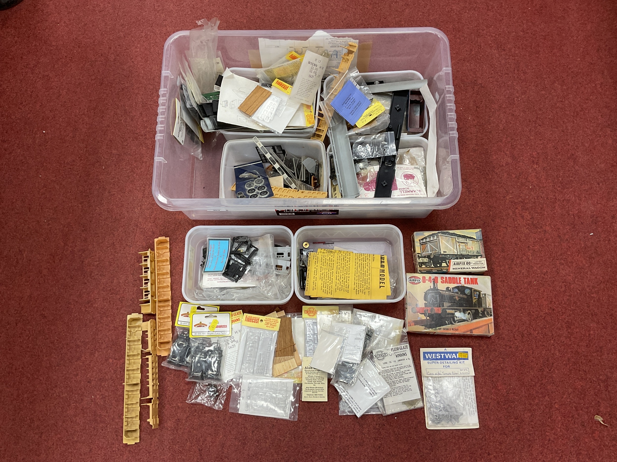 A Quantity of 'OO' Gauge Wagon and Other Kits by Dapol, Airfix and other, unchecked for completeness and some kits started noted, together with some bagged 'OO' Gauge accessories by Wrenn, Alan Gibson, Bachmann and others, including windows and bogies.