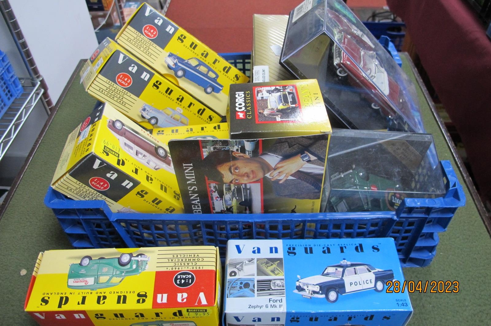 Twelve Diecast Model Vehicles, by Lledo, Corgi, City and other to include 'Vanguards' Navy Anglia, B.S.M Herald, Ford 100E, Corgi Mr Beans mini, boxed.