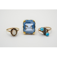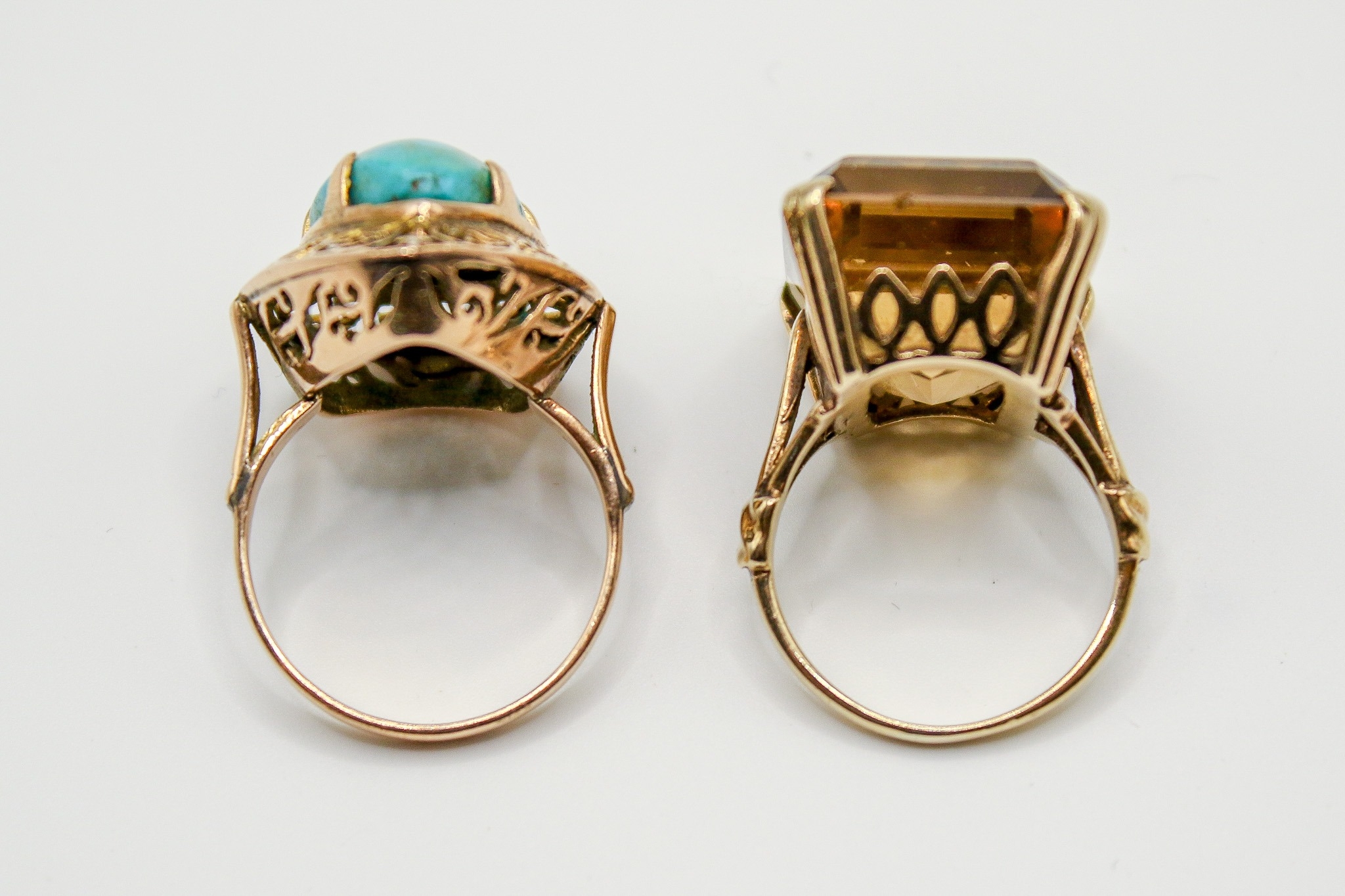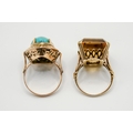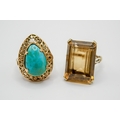 Two yellow metal stone set rings. The first with a teardrop turquoise cabochon in a pierced scroll mount, size N, the second with a rectangular faceted smoky quartz, size N, both mounts unmarked but test as 9ct gold. Gross weight 17.7g.
