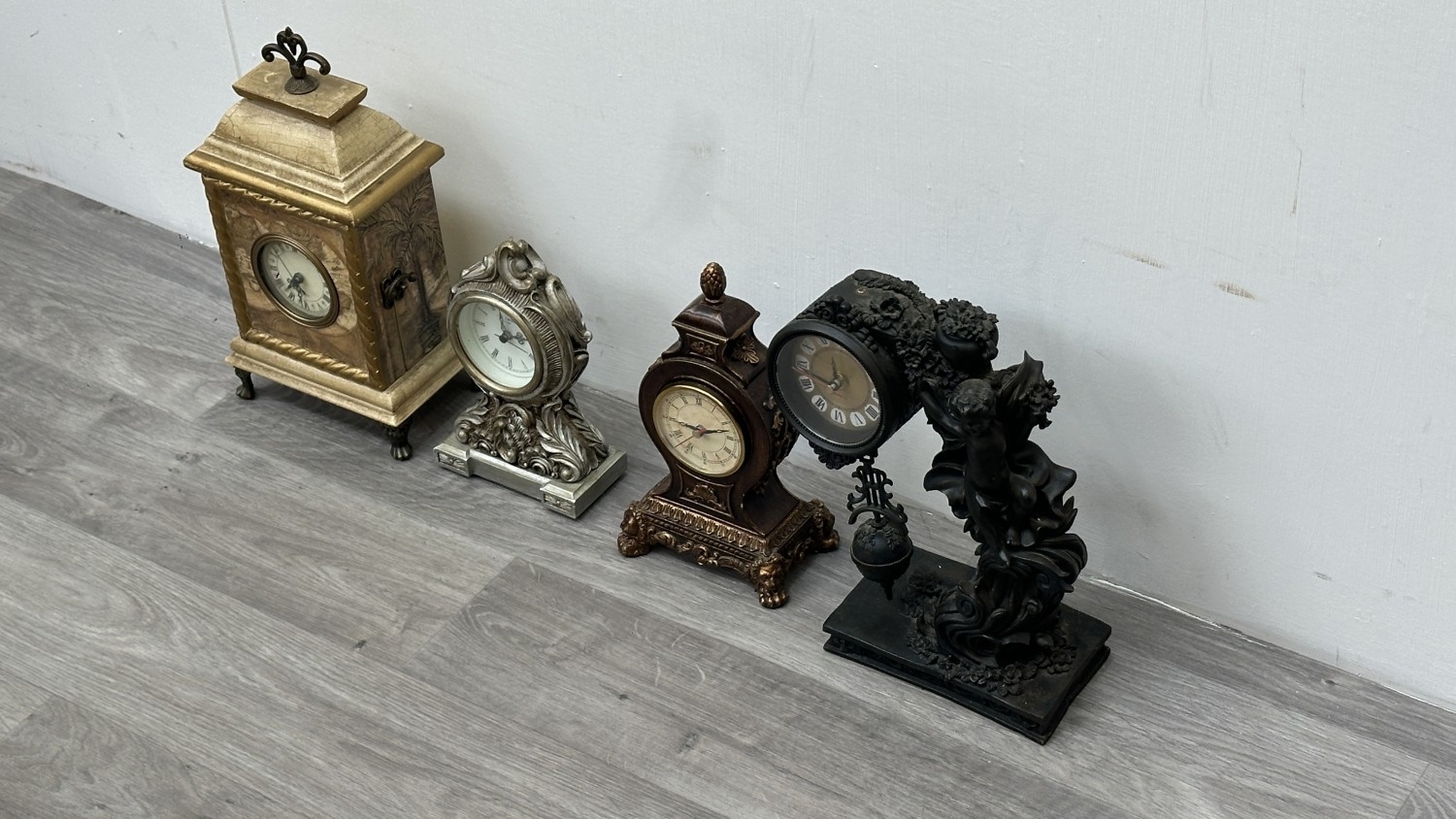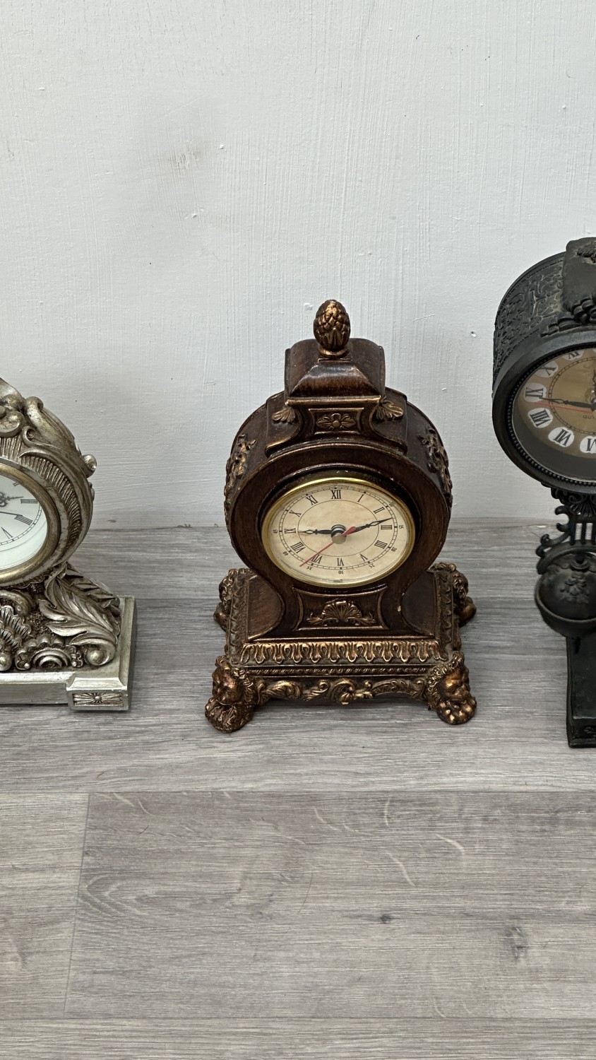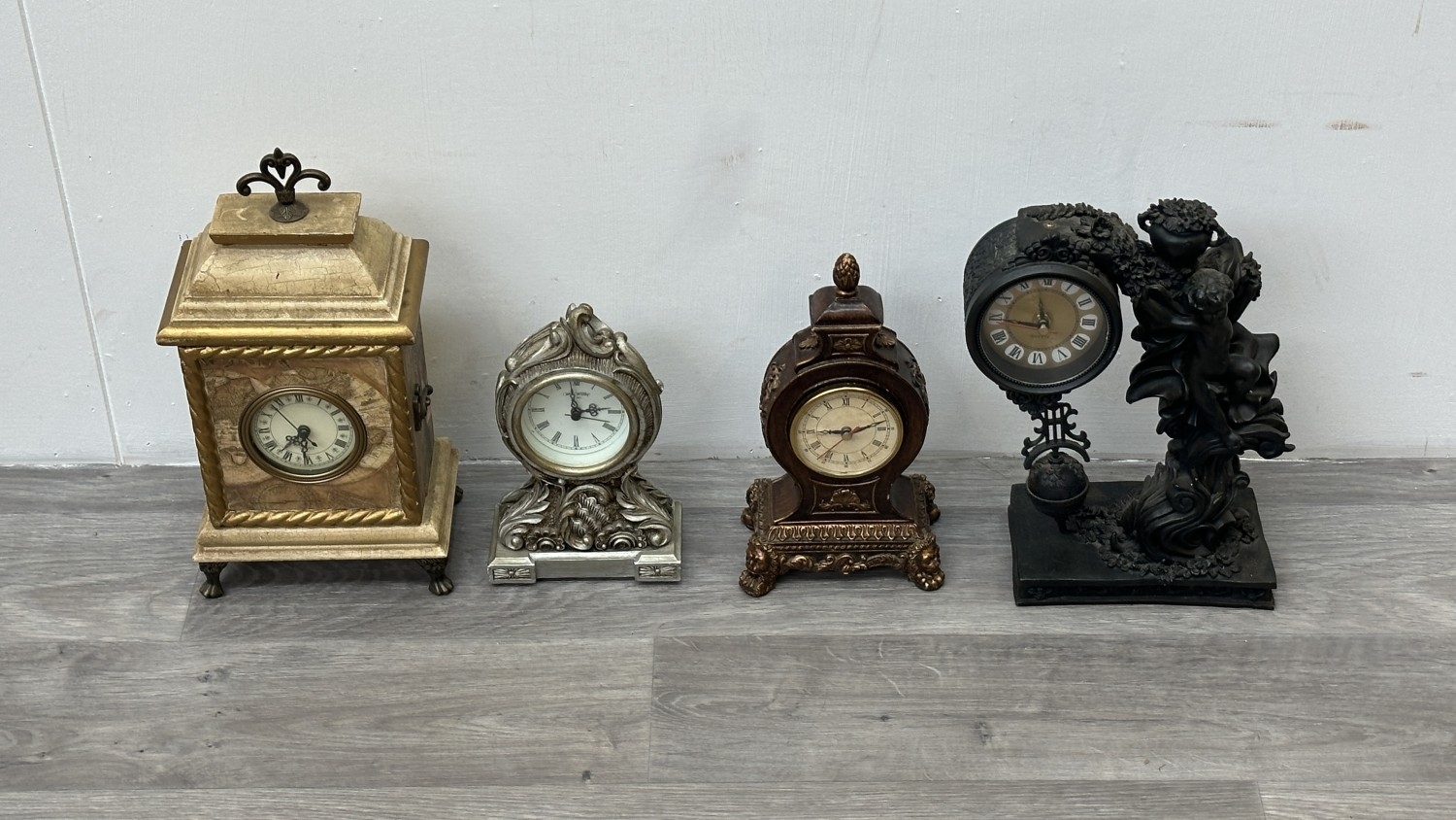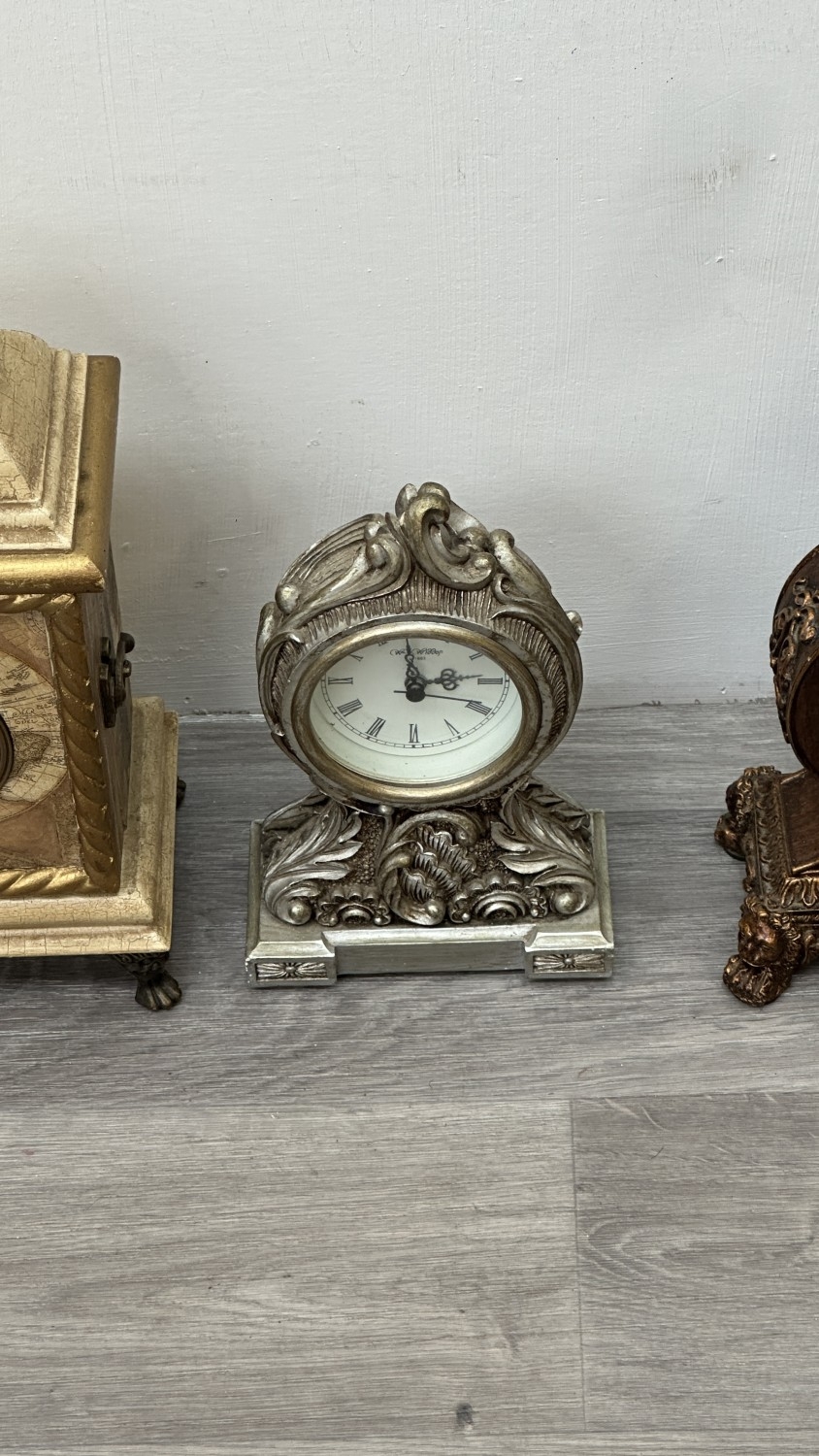 Four resin cased quartz mantel clocks, one Academy bronzed, one WM. Widdop silver painted, one Rococo style bronzed and one gilded with atlas decoupage design - largest approx. 34cm high