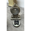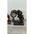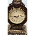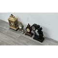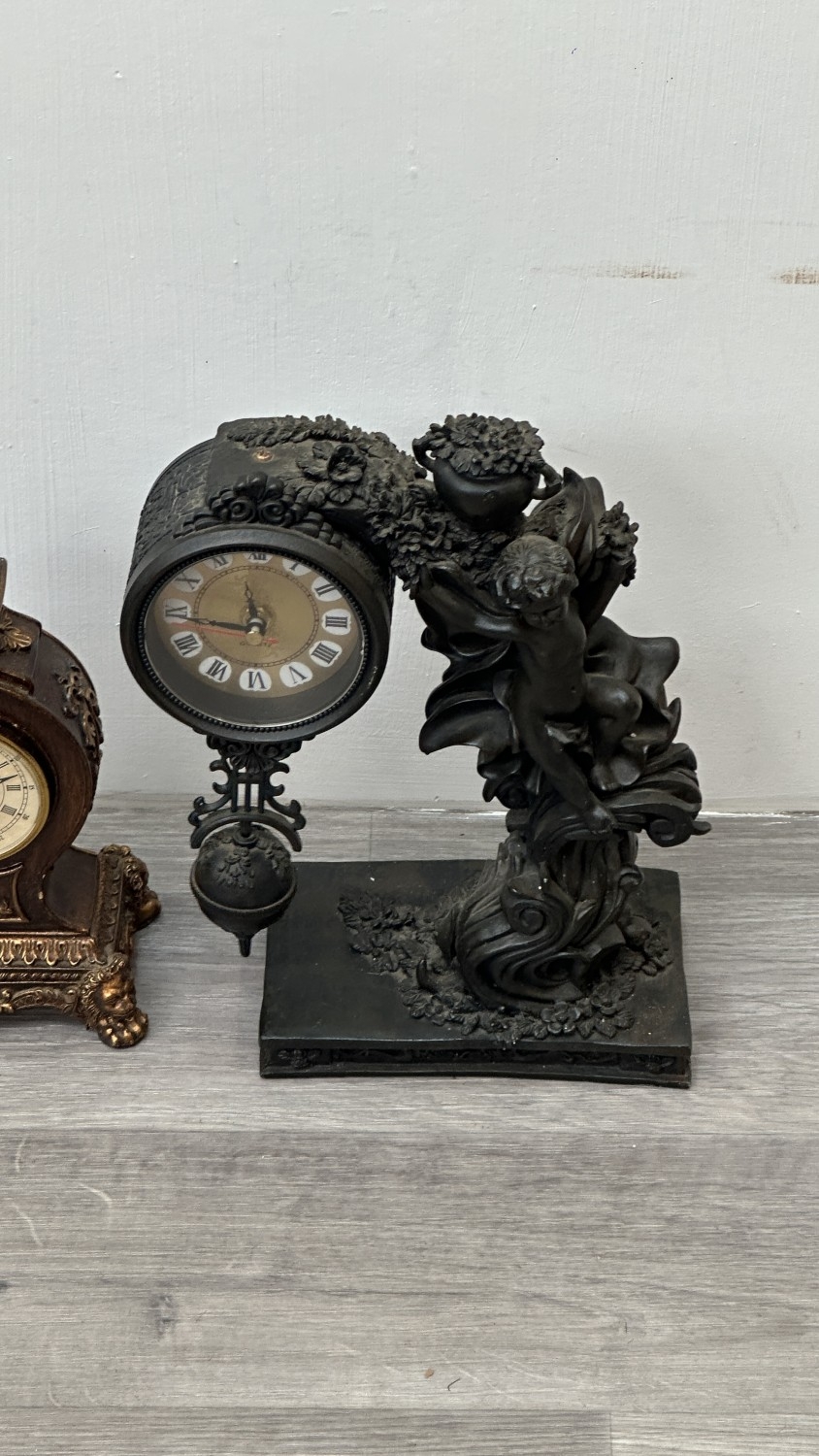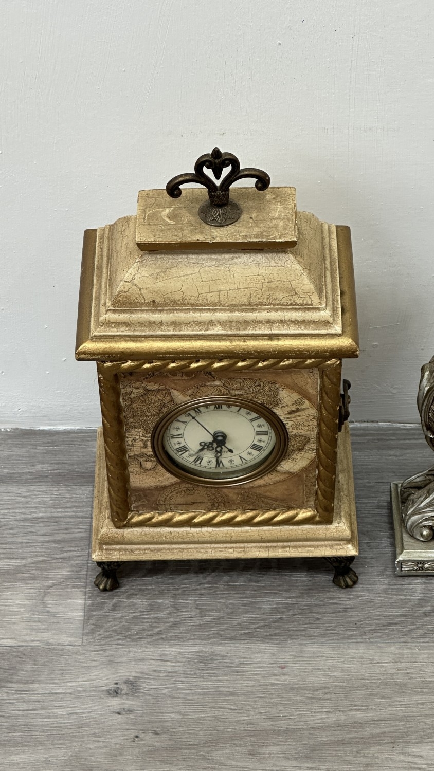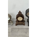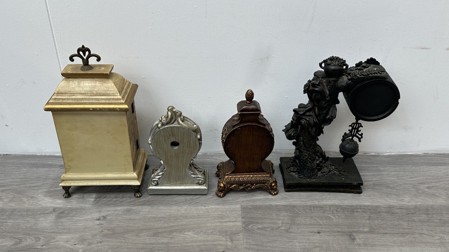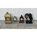 Four resin cased quartz mantel clocks, one Academy bronzed, one WM. Widdop silver painted, one Rococo style bronzed and one gilded with atlas decoupage design - largest approx. 34cm high