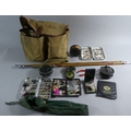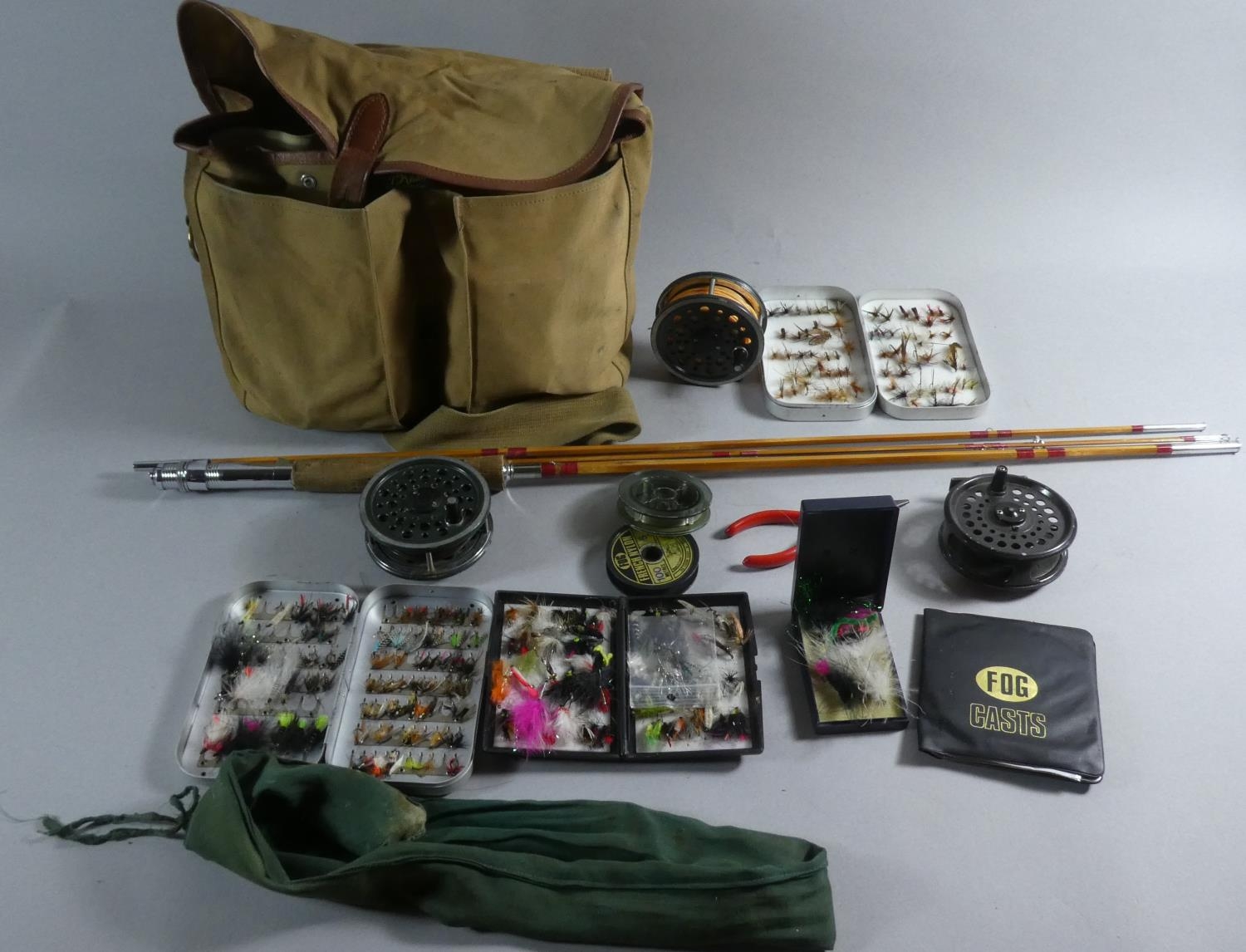 A Brady Canvas Fishing Bag Containing Fly fishing Equipment, Reels, Flies Together with a Split Cane Five Section Rod