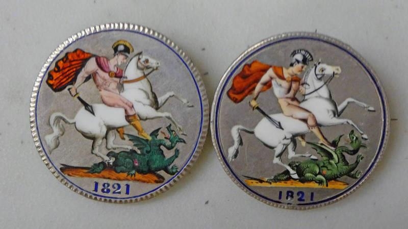 TWO 1821 GEORGE IV CROWNS WITH ENAMELLED REVERSES & PIN BACK FITTINGS