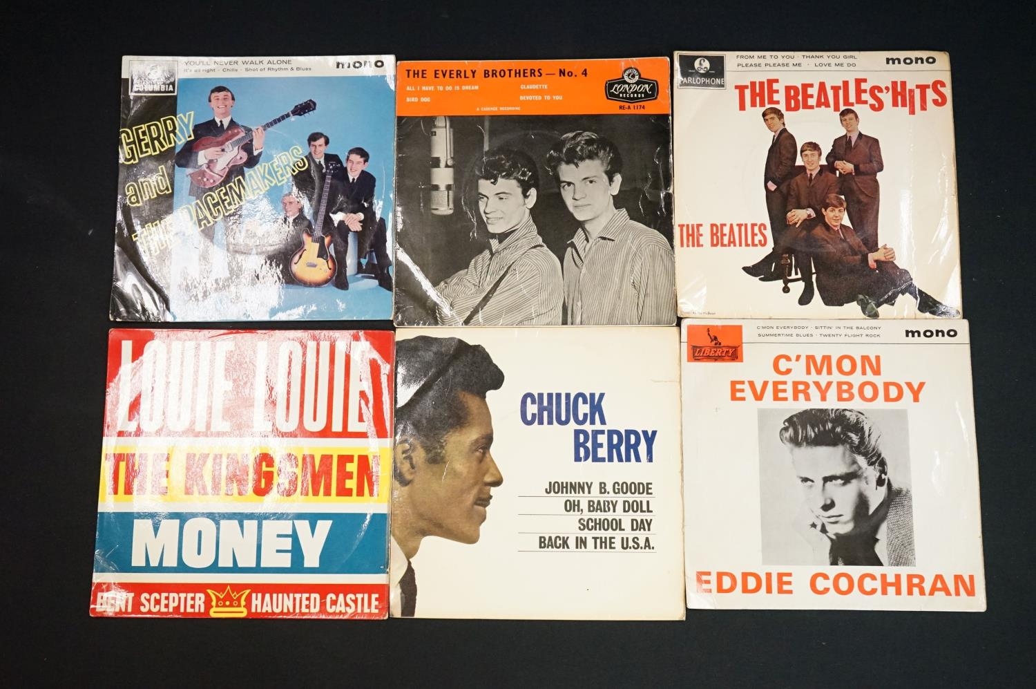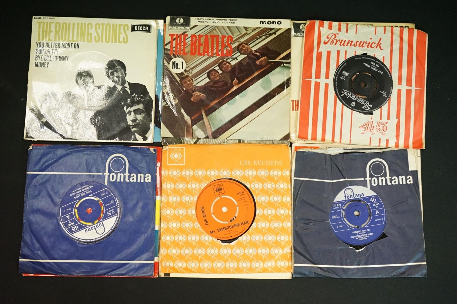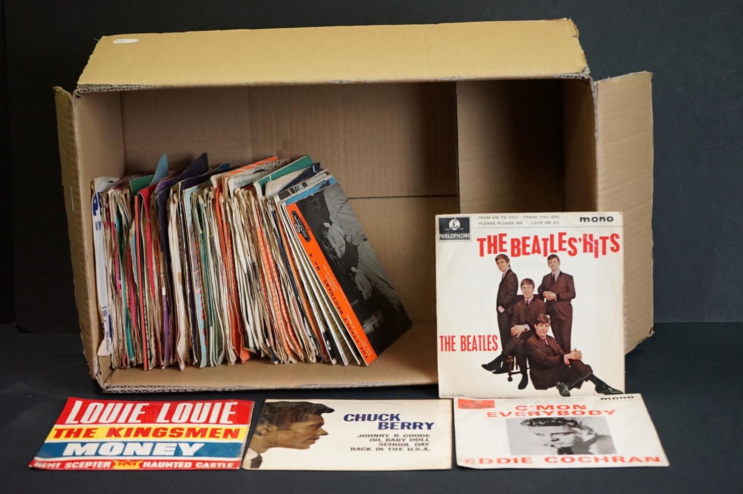 Vinyl - Over 50 mainly 1960's mod, beat, rock & pop 7" singles and EP's including The Who, The Byrds, The Gentrys, The Kinks, The Doors, The Beatles, The Rolling Stones, The Beach Boys, The Kingsmen, Eddie Cochran, Chuck Berry and others. Mainly in company sleeves. Condition of vinyl at least Vg overall