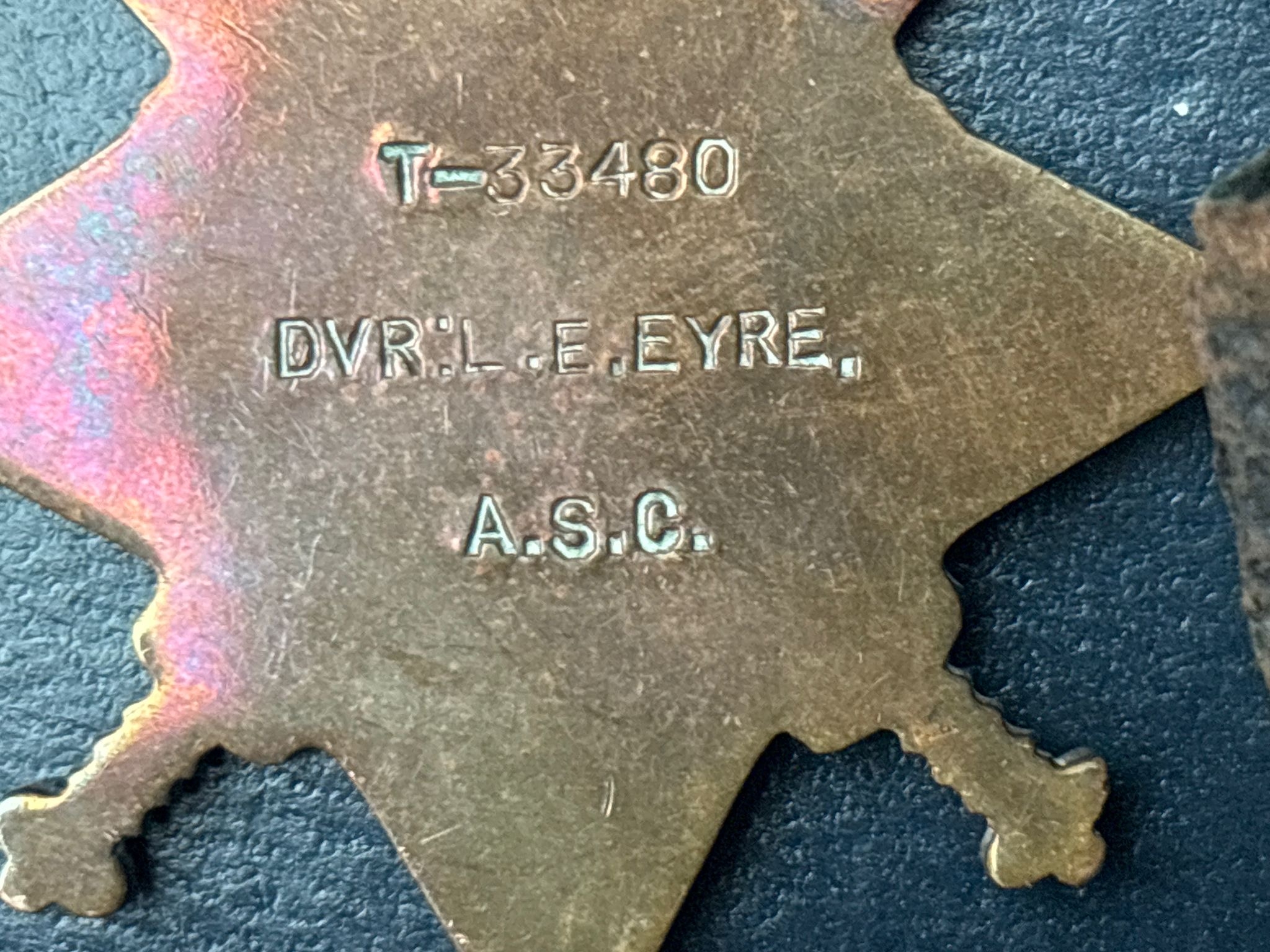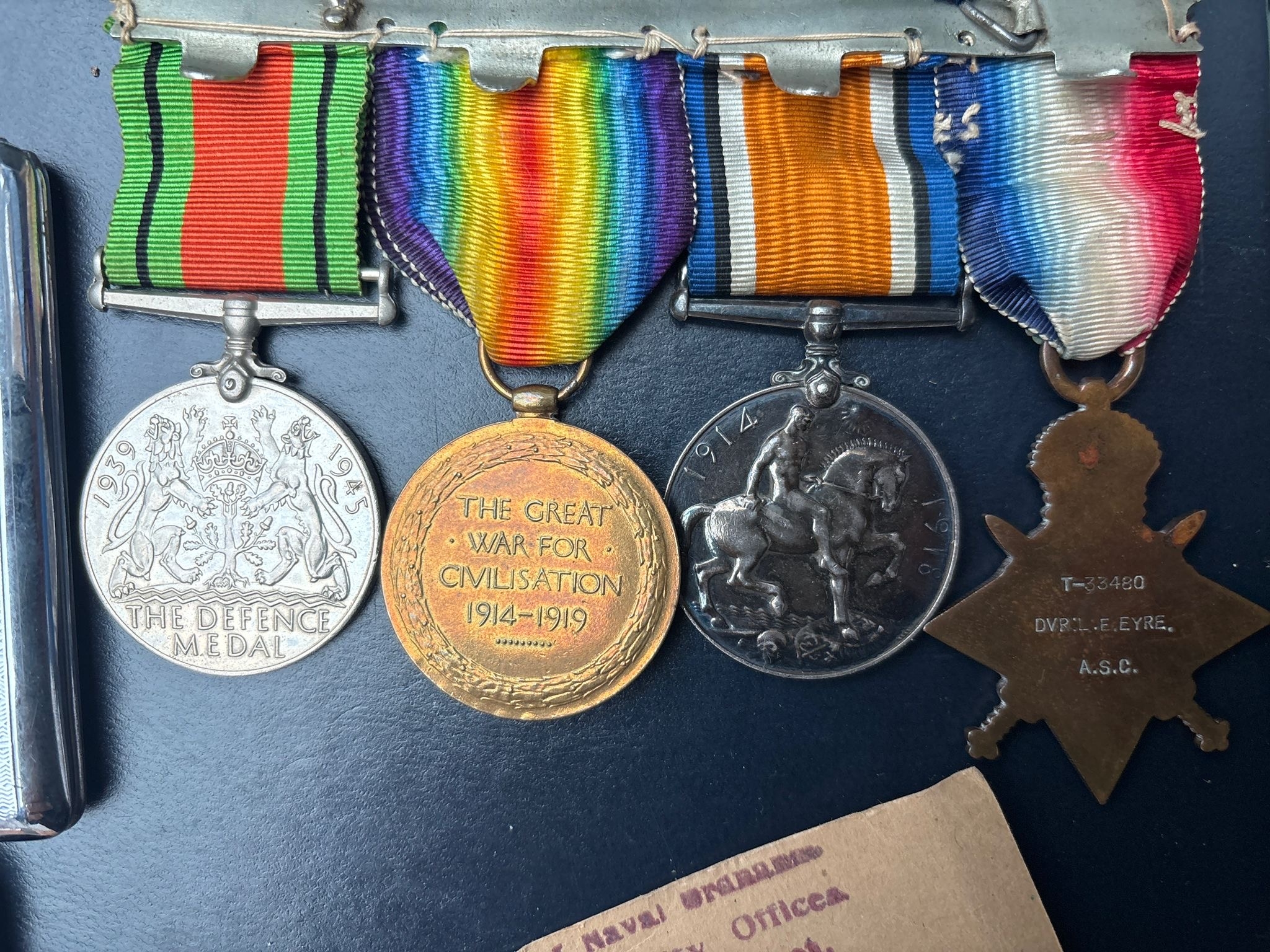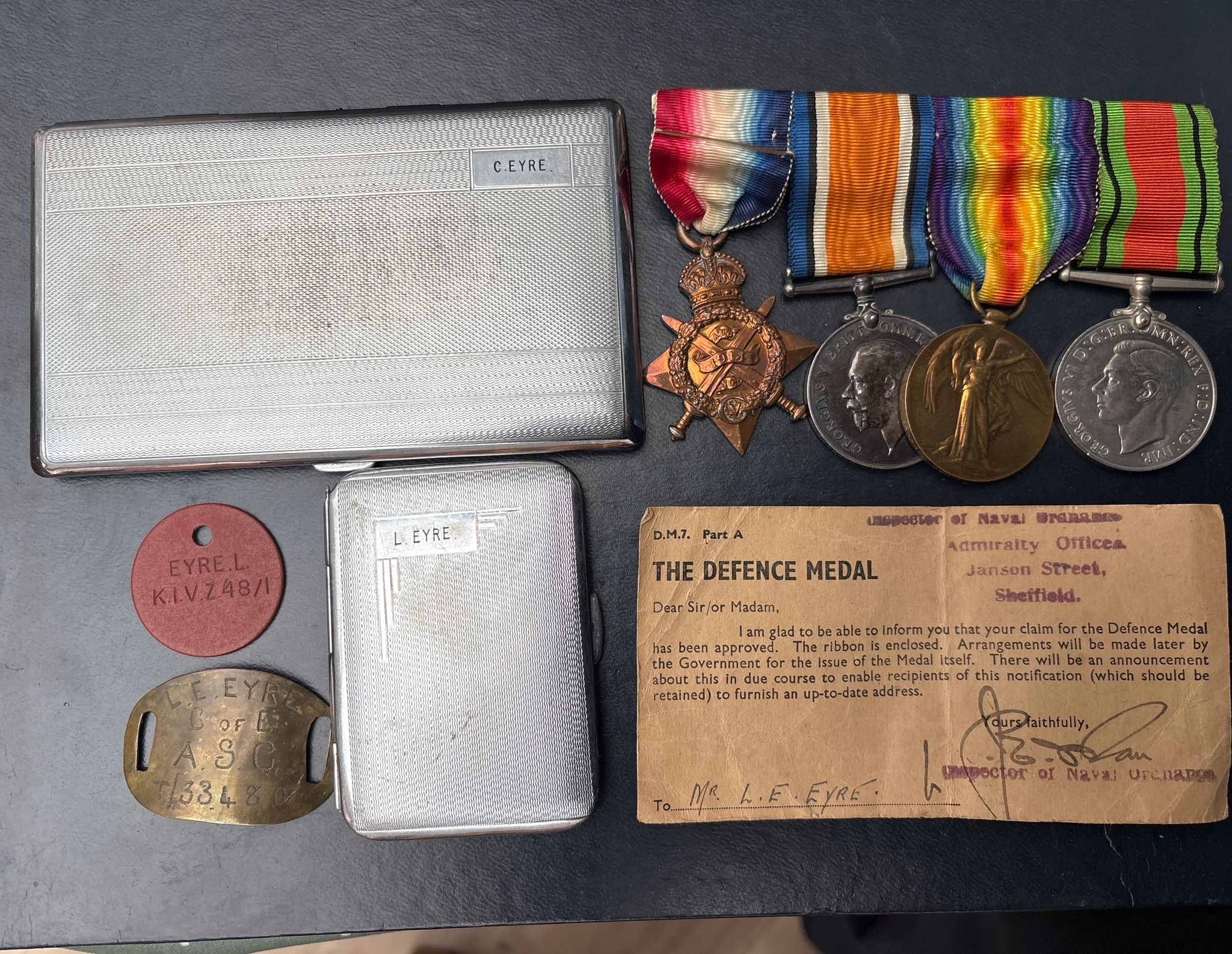 Attributed WW1 1914 Star Trio & WW2 Defence Medal Family Archive — Driver L. Eyre, A.S.C. A fully documented multi-period service group comprising the 1914 Star, British War Medal and Victory Medal to Driver L. Eyre, Army Service Corps, together with the 1939–45 Defence Medal and official Admiralty notification. Accompanied by personal effects including identity tags, named cigarette cases, civilian National Registration identity card, and contemporary family obituary notices from the Blackburn area. A cohesive archive representing both front-line First World War service and later wartime home-front contribution.