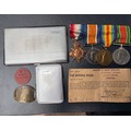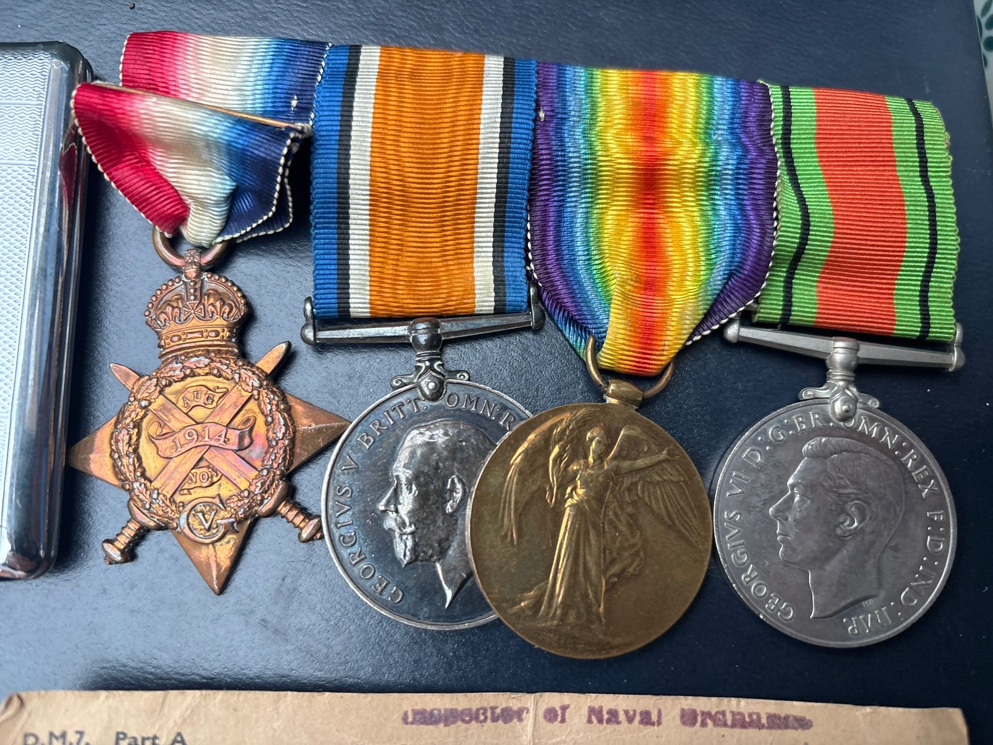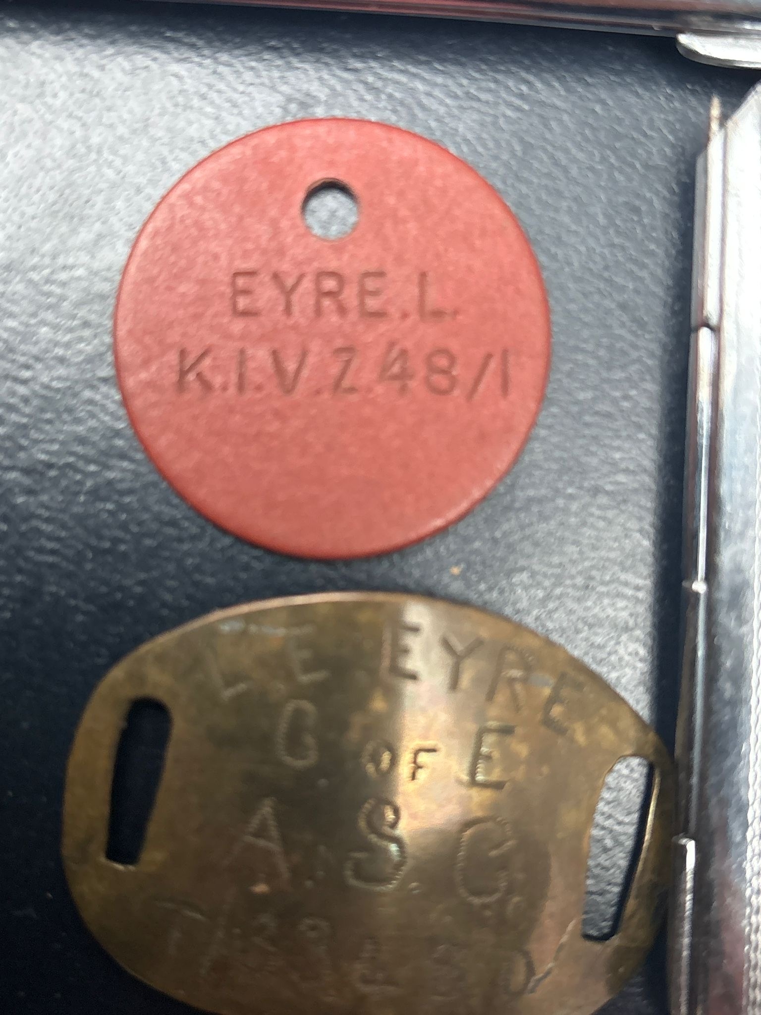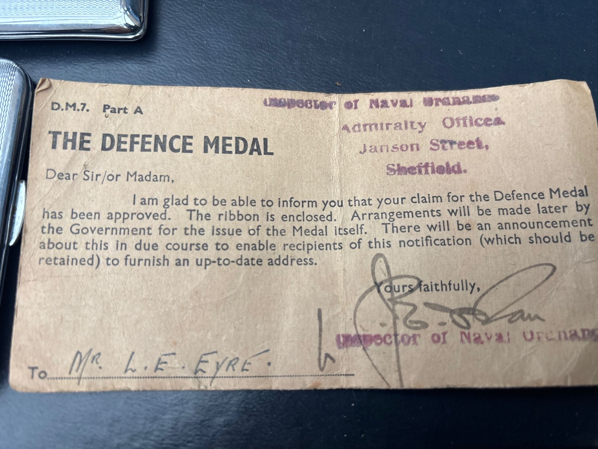 Attributed WW1 1914 Star Trio & WW2 Defence Medal Family Archive — Driver L. Eyre, A.S.C. A fully documented multi-period service group comprising the 1914 Star, British War Medal and Victory Medal to Driver L. Eyre, Army Service Corps, together with the 1939–45 Defence Medal and official Admiralty notification. Accompanied by personal effects including identity tags, named cigarette cases, civilian National Registration identity card, and contemporary family obituary notices from the Blackburn area. A cohesive archive representing both front-line First World War service and later wartime home-front contribution.