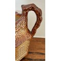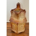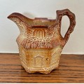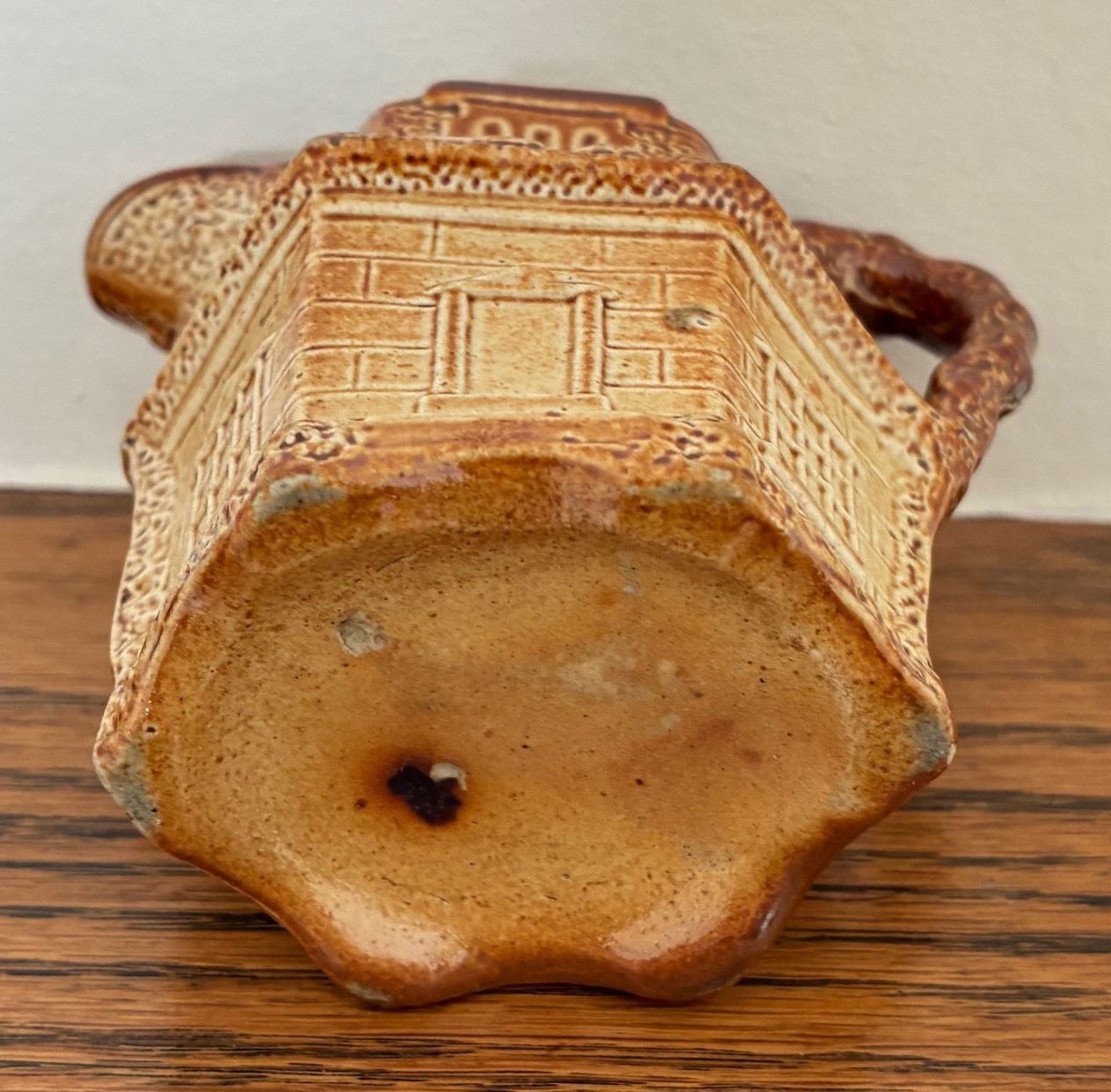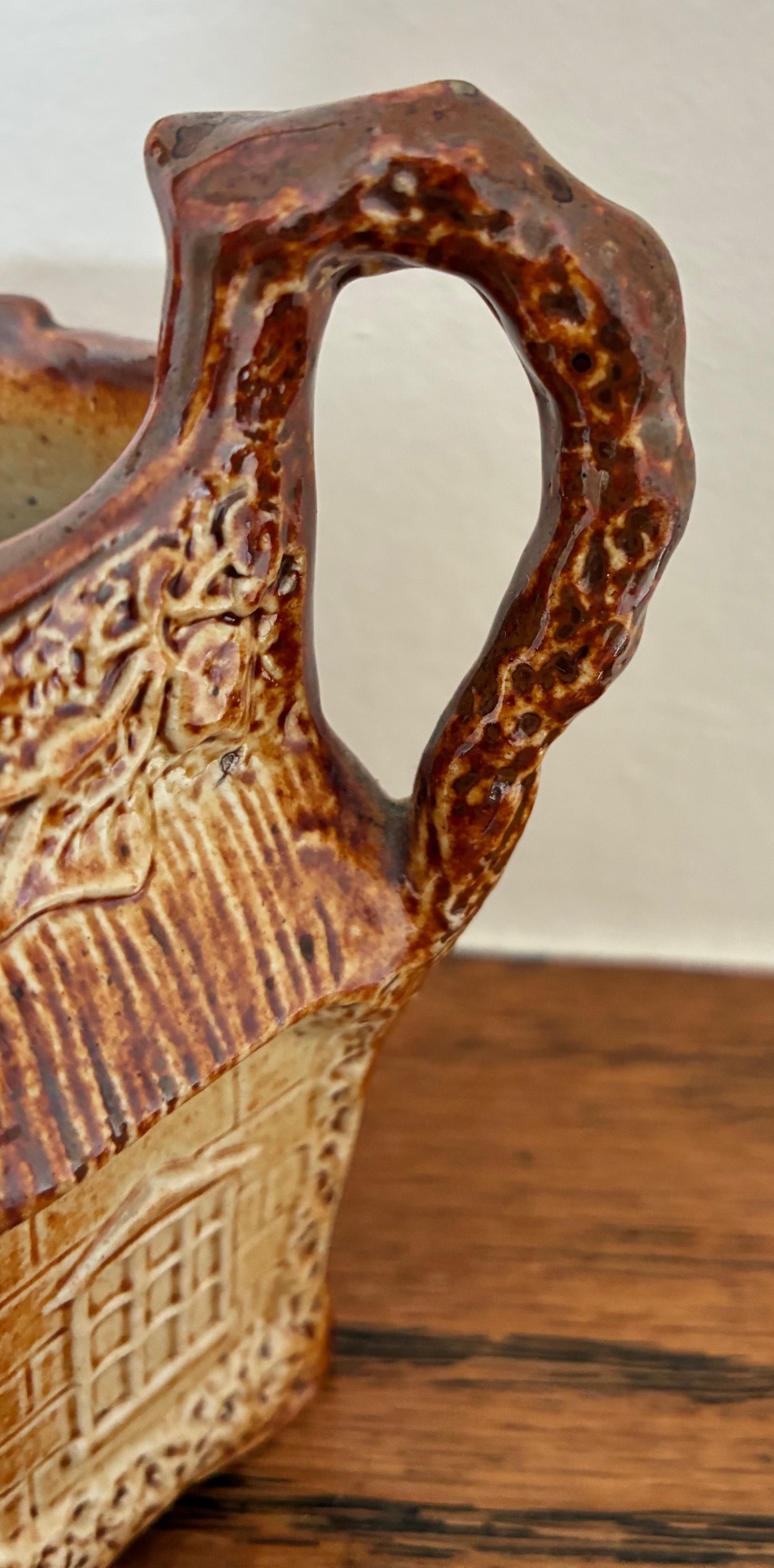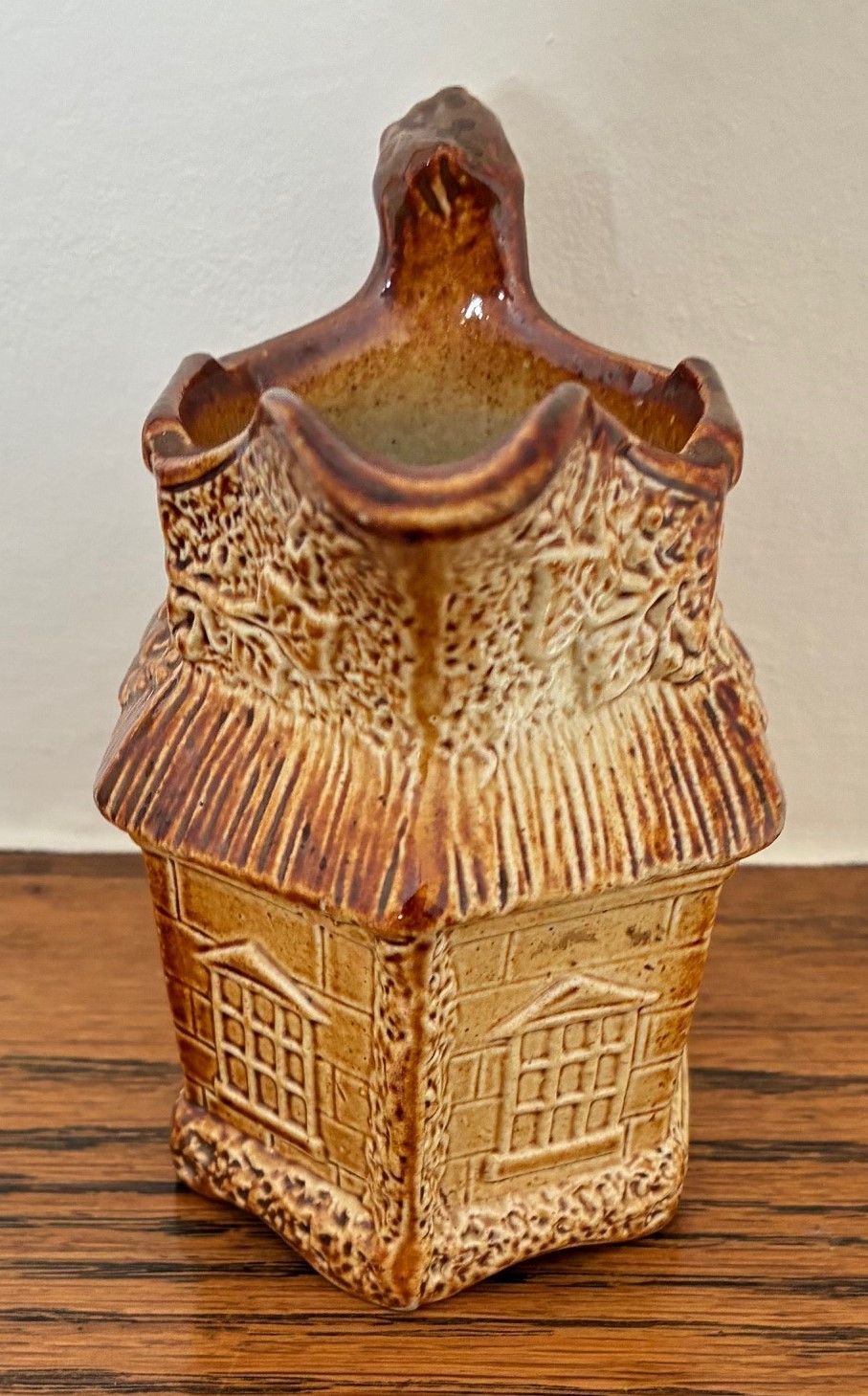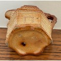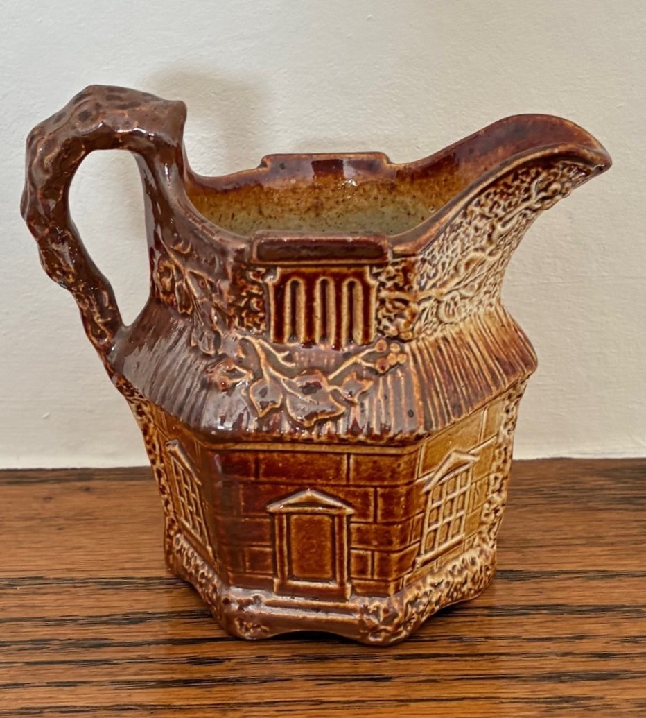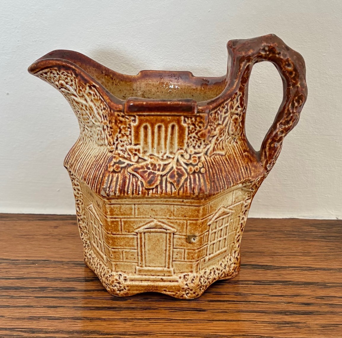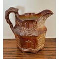 Brampton Derbyshire salt glazed stoneware hexagonal shaped novelty cream jug, circa 1840, in the form of a thatched cottage with windows, brickwork and ivy, the handle in the form of a twig, 10cm high.