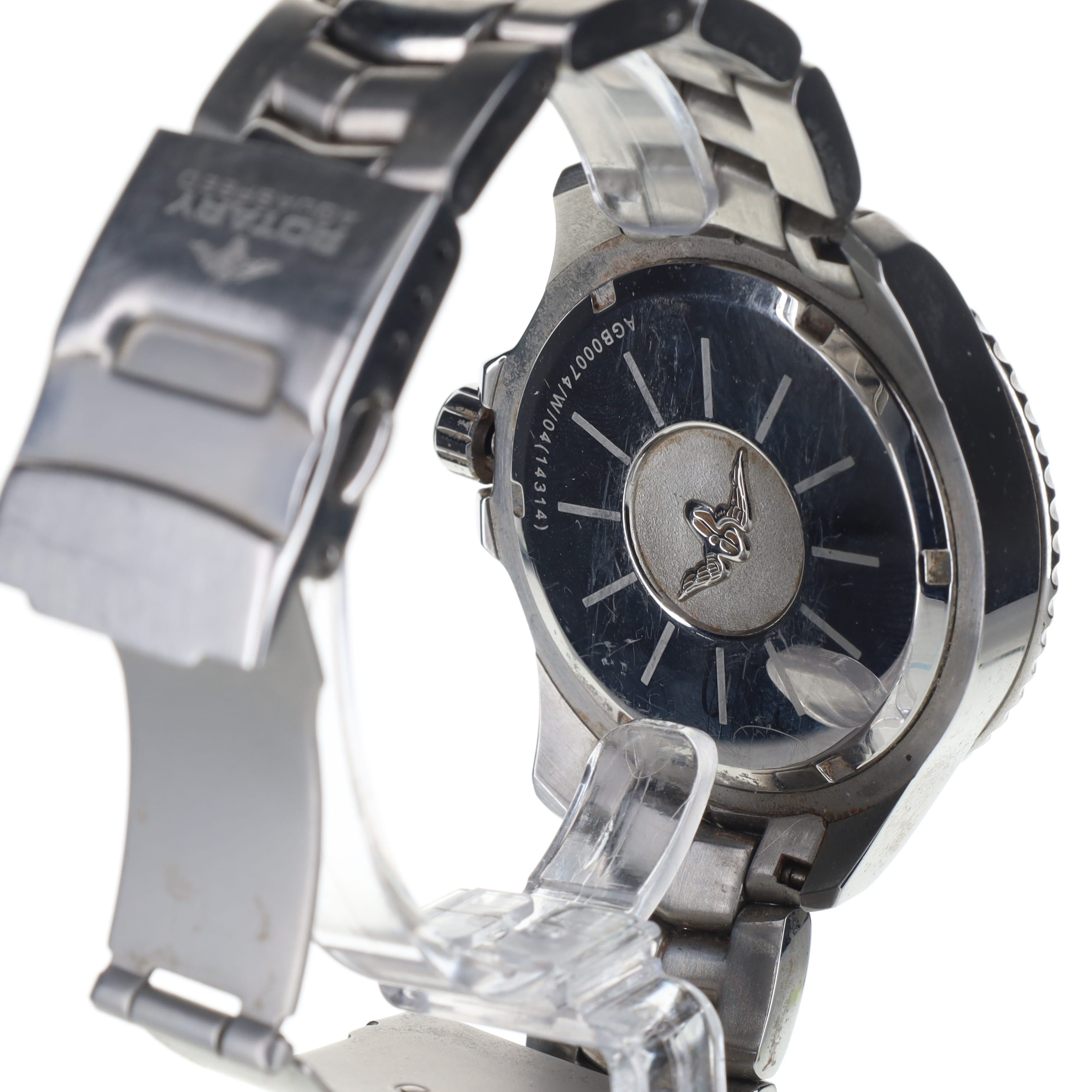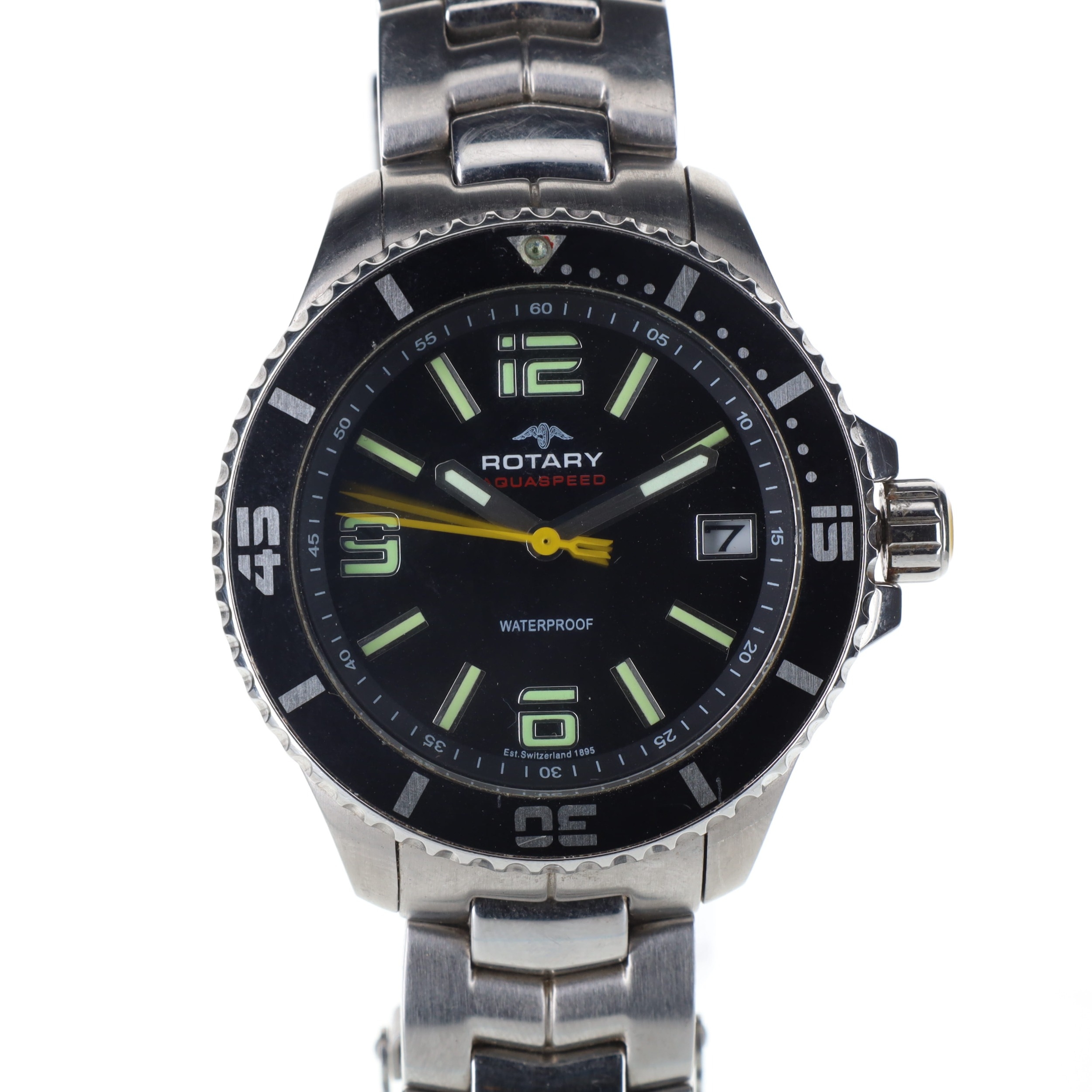 Rotary - Aquaspeed Quartz Sports Watch. Japanese made quartz movement. Case and bracelet made from stainless steel. Glass crystal. Unidirectional bezel. Black dial with silver lumed hands and hour markers, date window at 3 o'clock. Screw down crown and quick set date. Watch is in full working order with box, spare links and manuals included. Case back reference code: Ref AGB00074