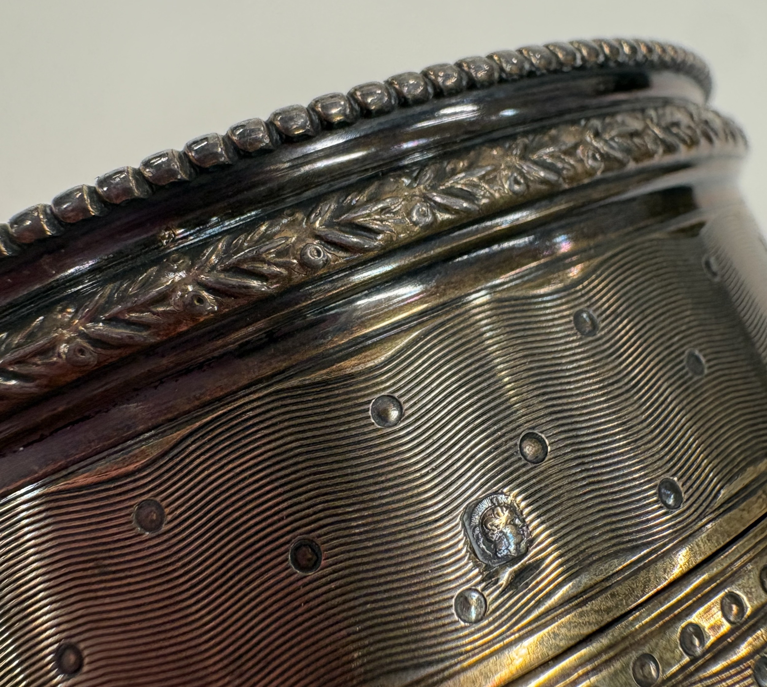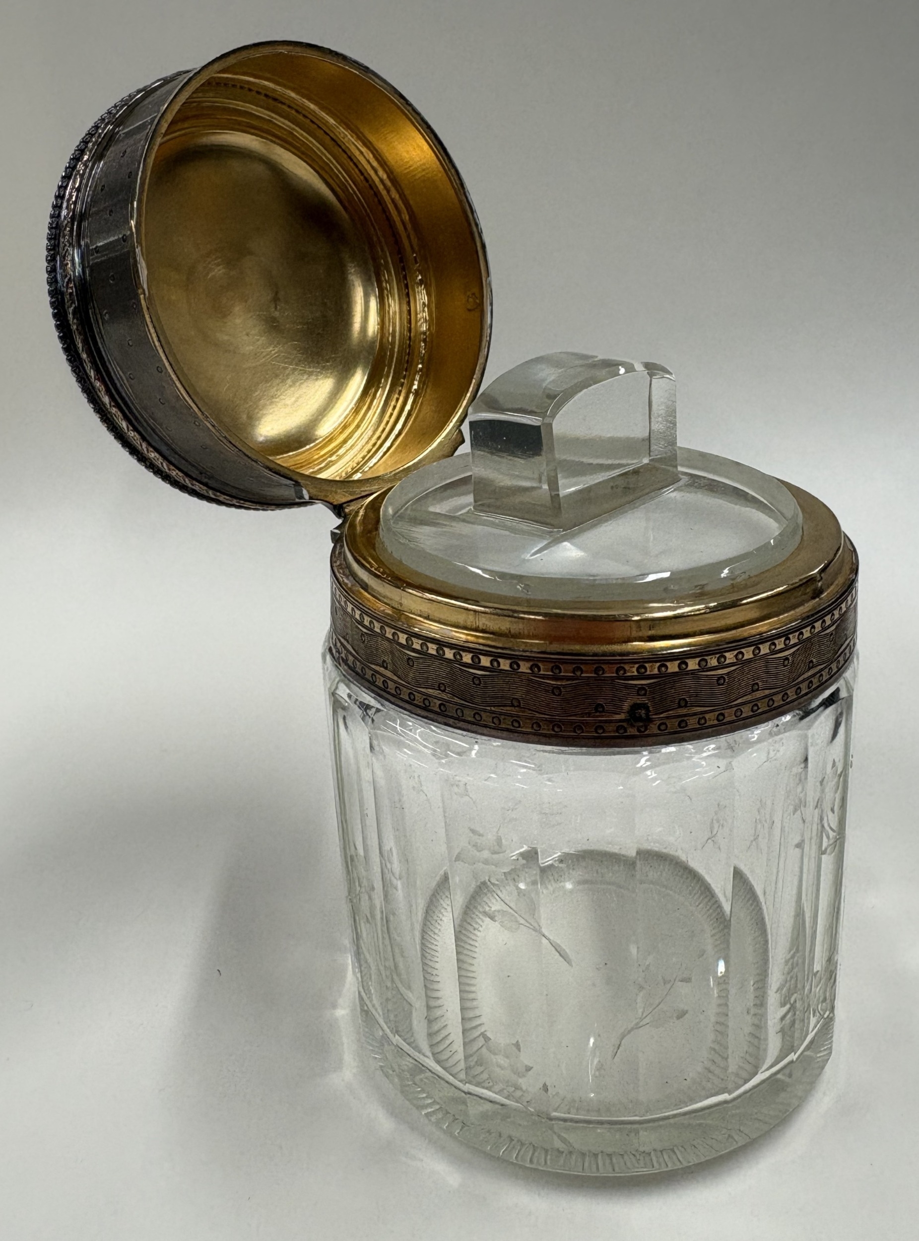 An attractive silver-gilt-mounted etched glass perfume jar. Est. £350 - £400.