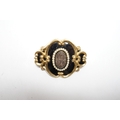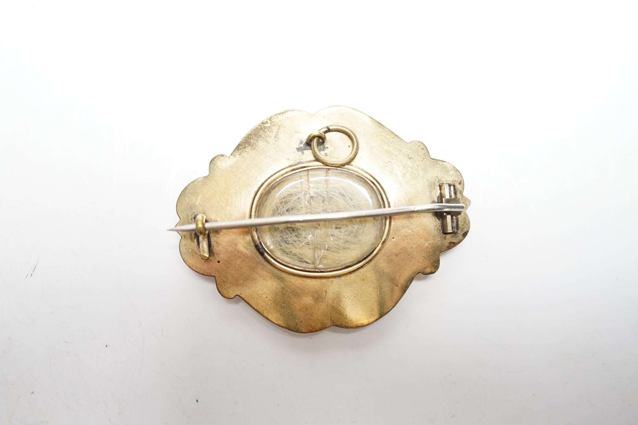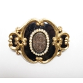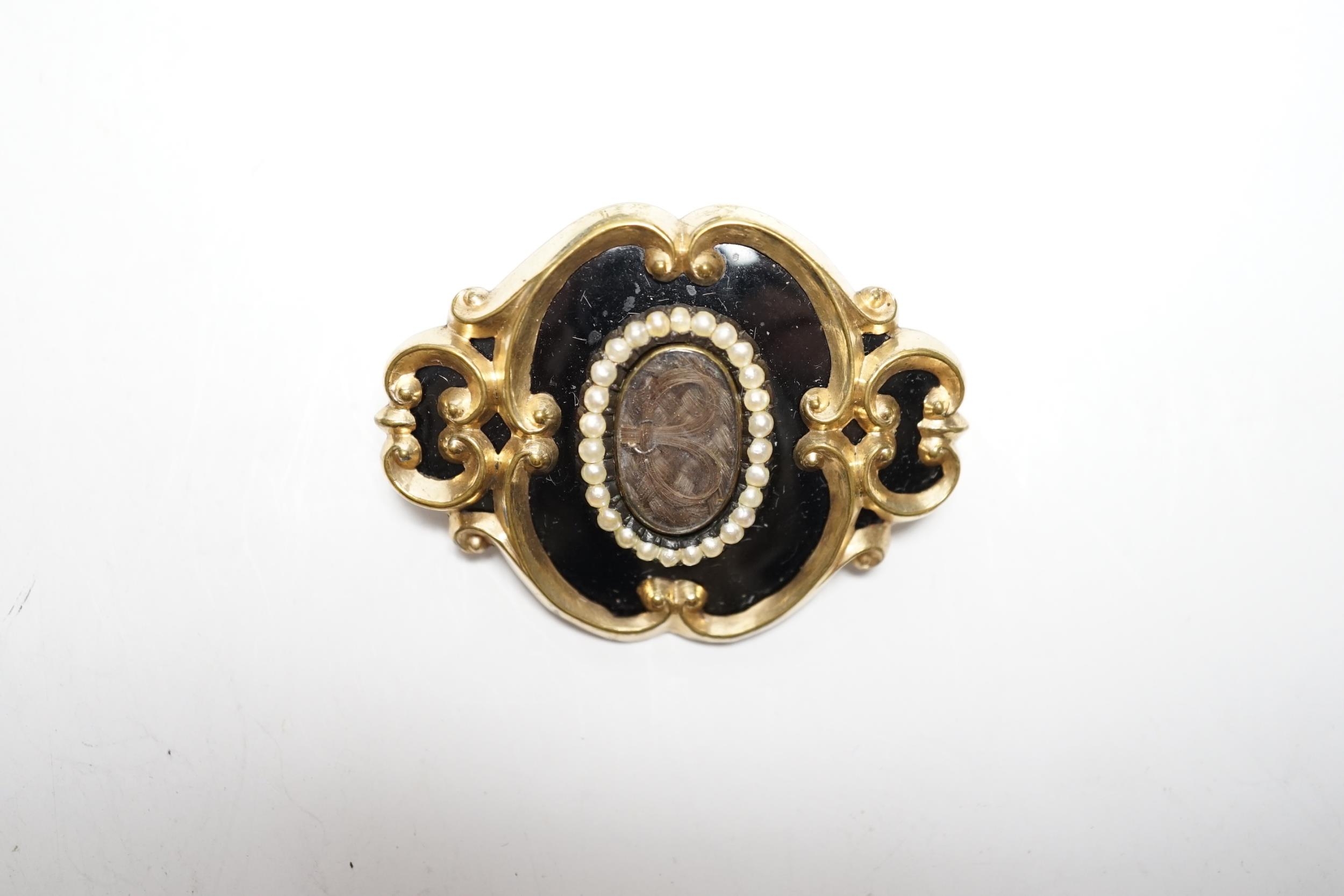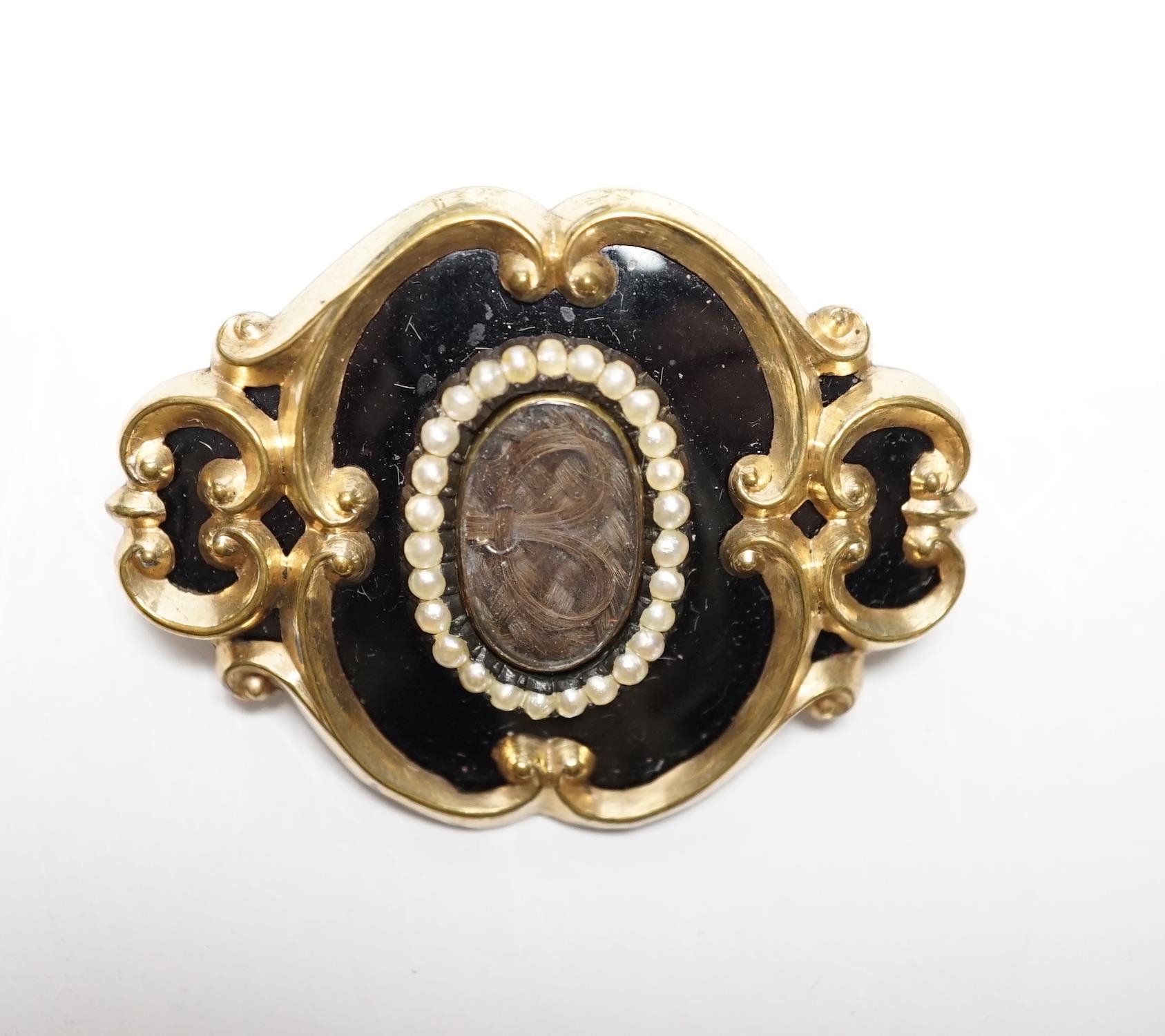 A Victorian yellow metal, black enamel and seed pearl set mourning brooch, 47mm.