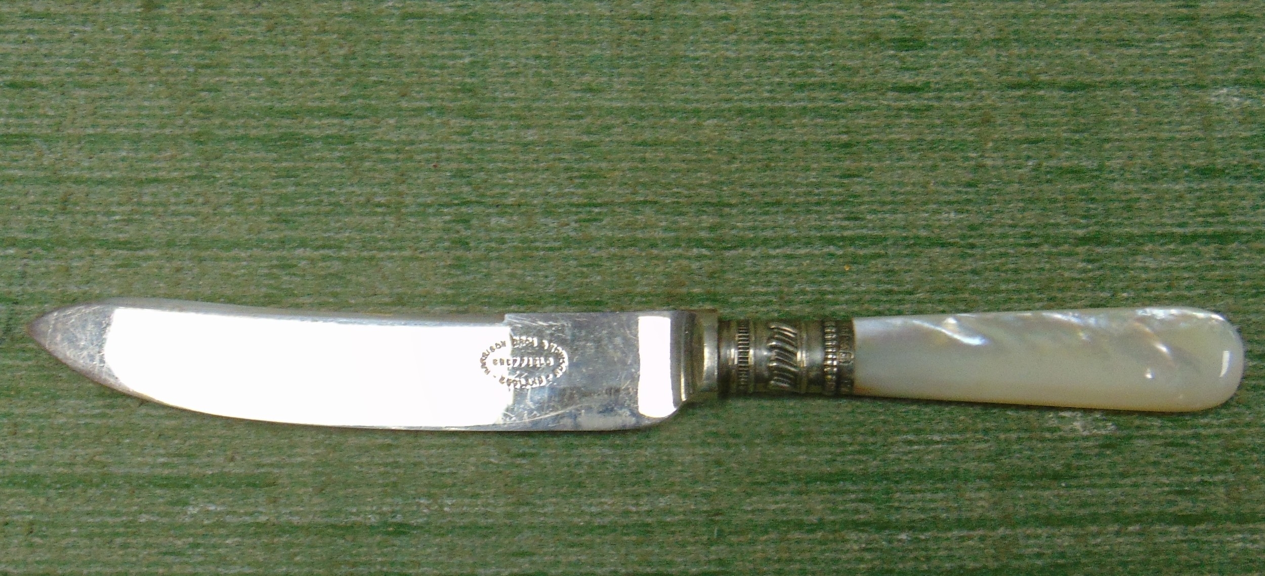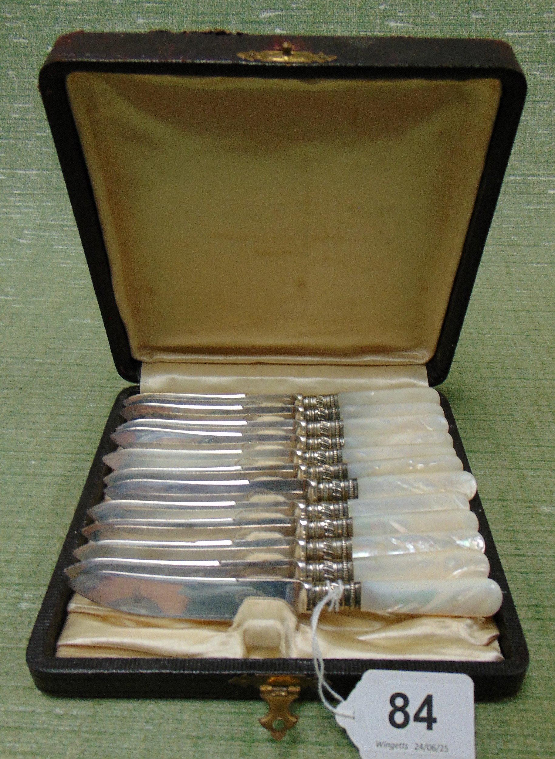 Cased set of 12 mother of pearl handled silver bezzeled fruit knives.