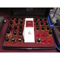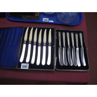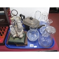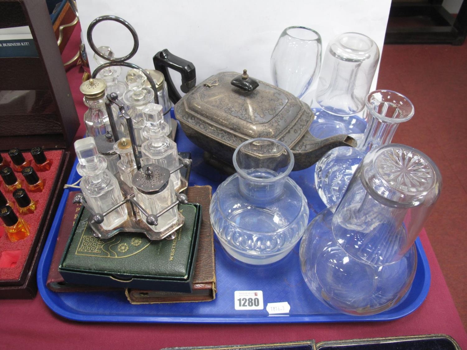 Four Bottle Cruets, plated tea pot, XIX Century water decanters, saving boxes etc:- One Tray.