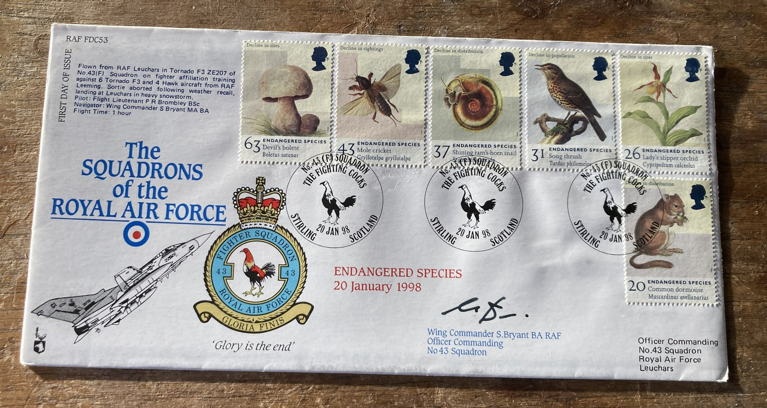 RAF FDC53 The Squadrons of the Royal Air Force Endangered Species 20 Jan 1998 with Endangered Species Stamp set signed by Wg Cmdr S Bryant. PM 43sqn The Fighting Cocks 20 01 98 Stirling Scotland RAF FDC. Single Vendor collection. Good condition. We combine postage on multiple winning lots and can ship worldwide. UK postage from £5.99, EU from £7.99, Rest of World from £9.99.