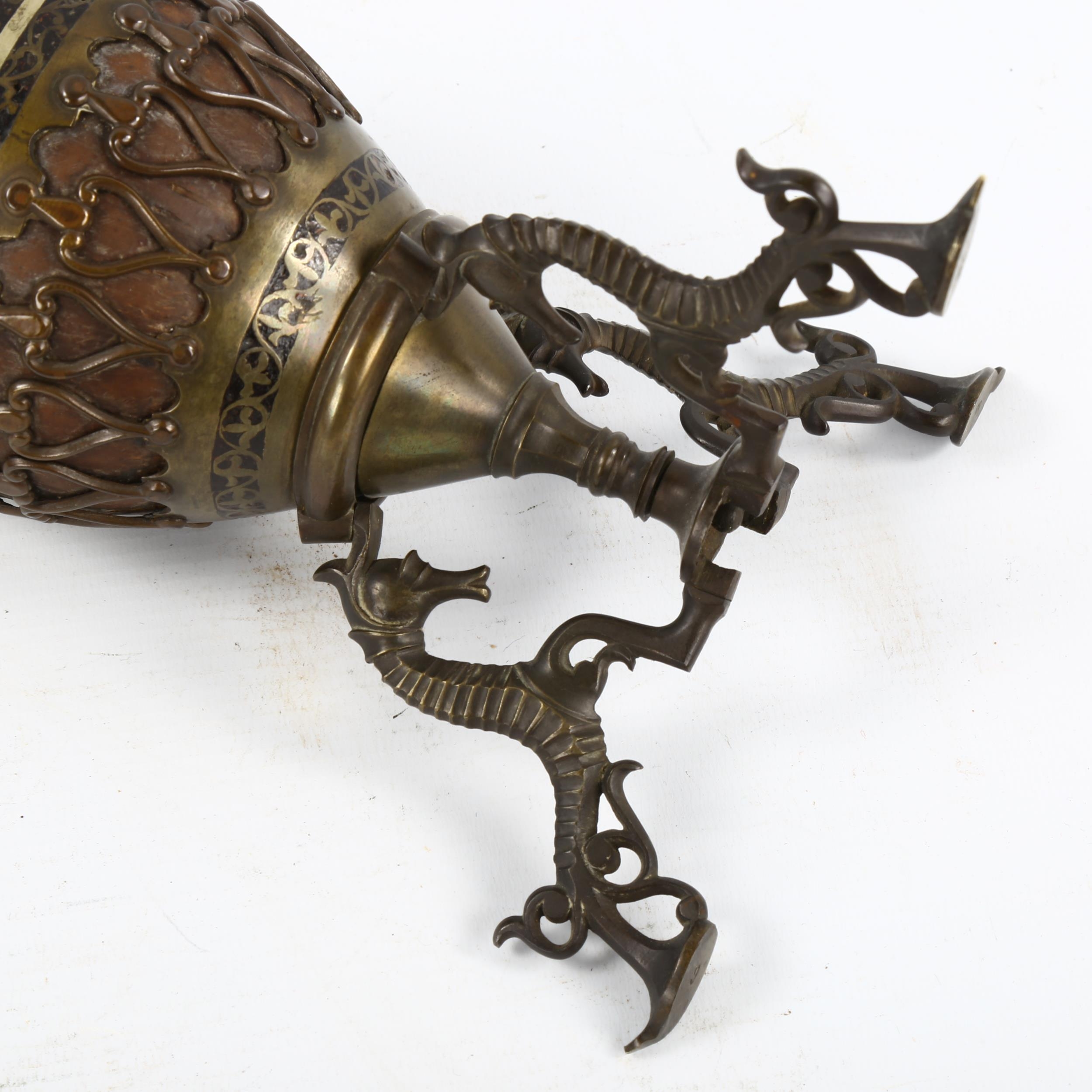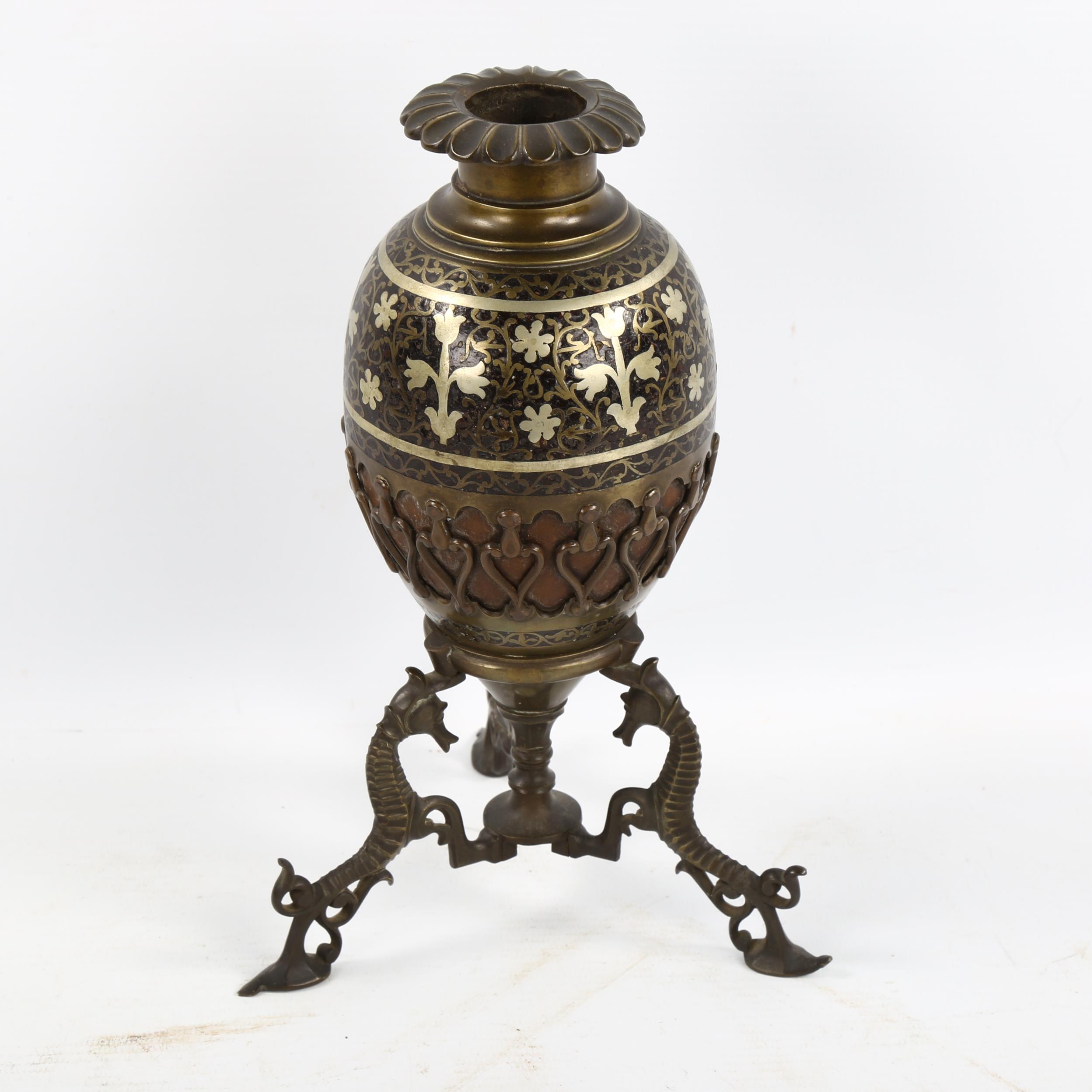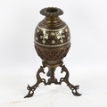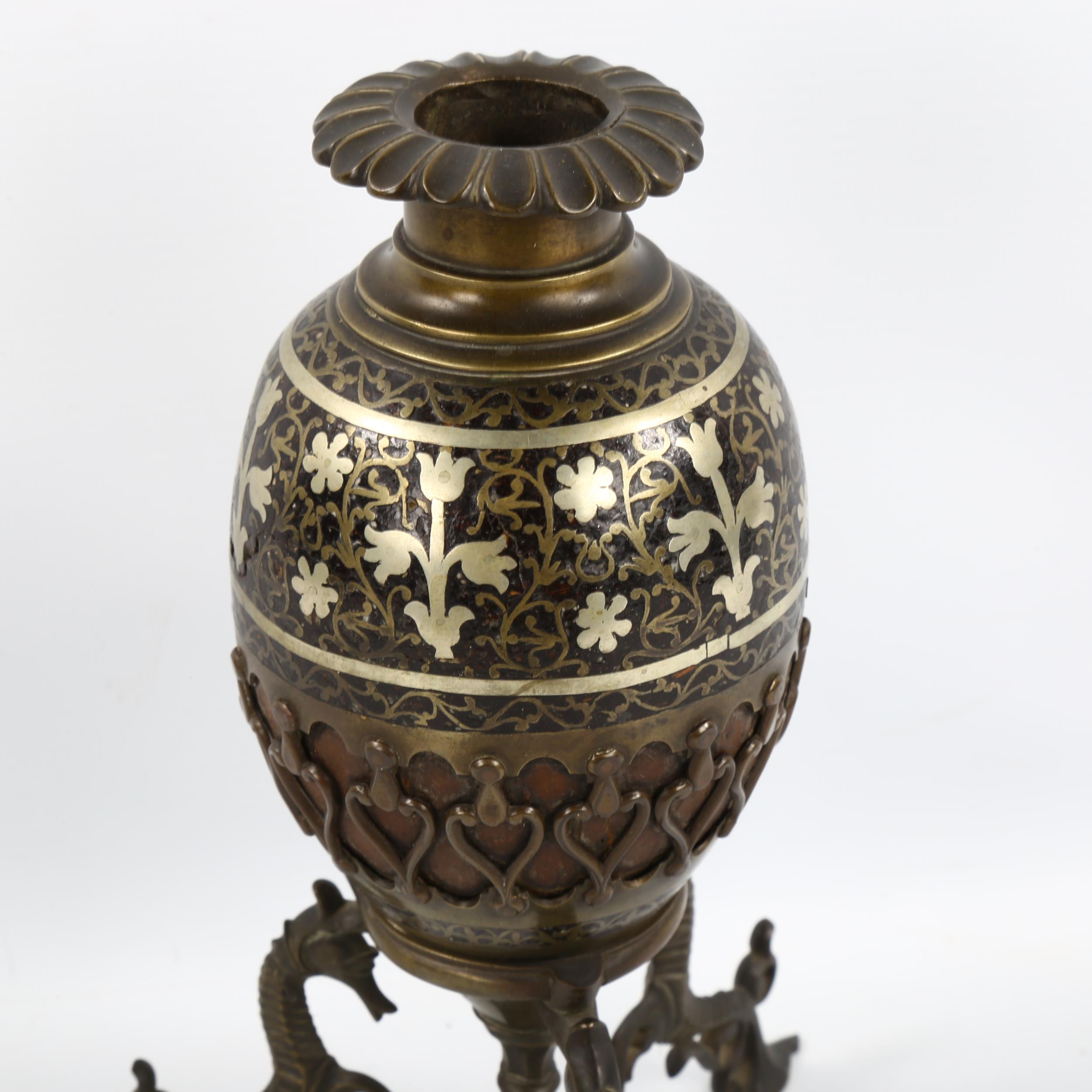 An Islamic brass lamp base, with silver inlaid decoration on cast stand, height 22cm
