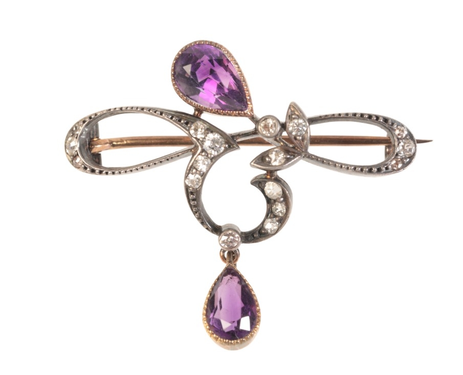 AN ART NOUVEAU AMETHYST AND DIAMOND BROOCH