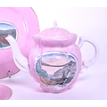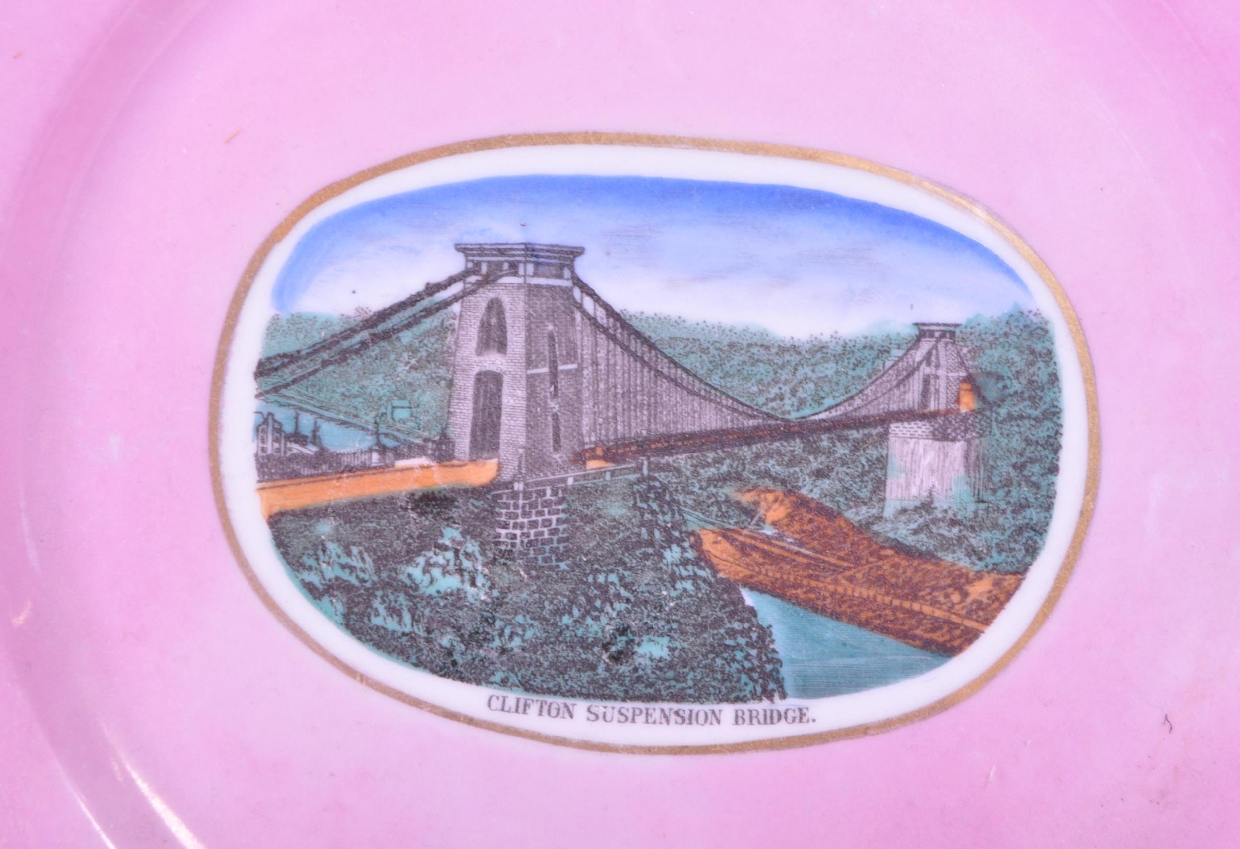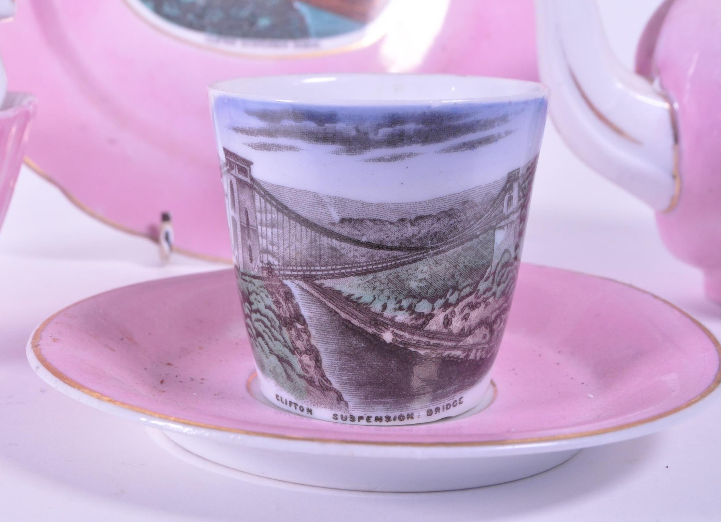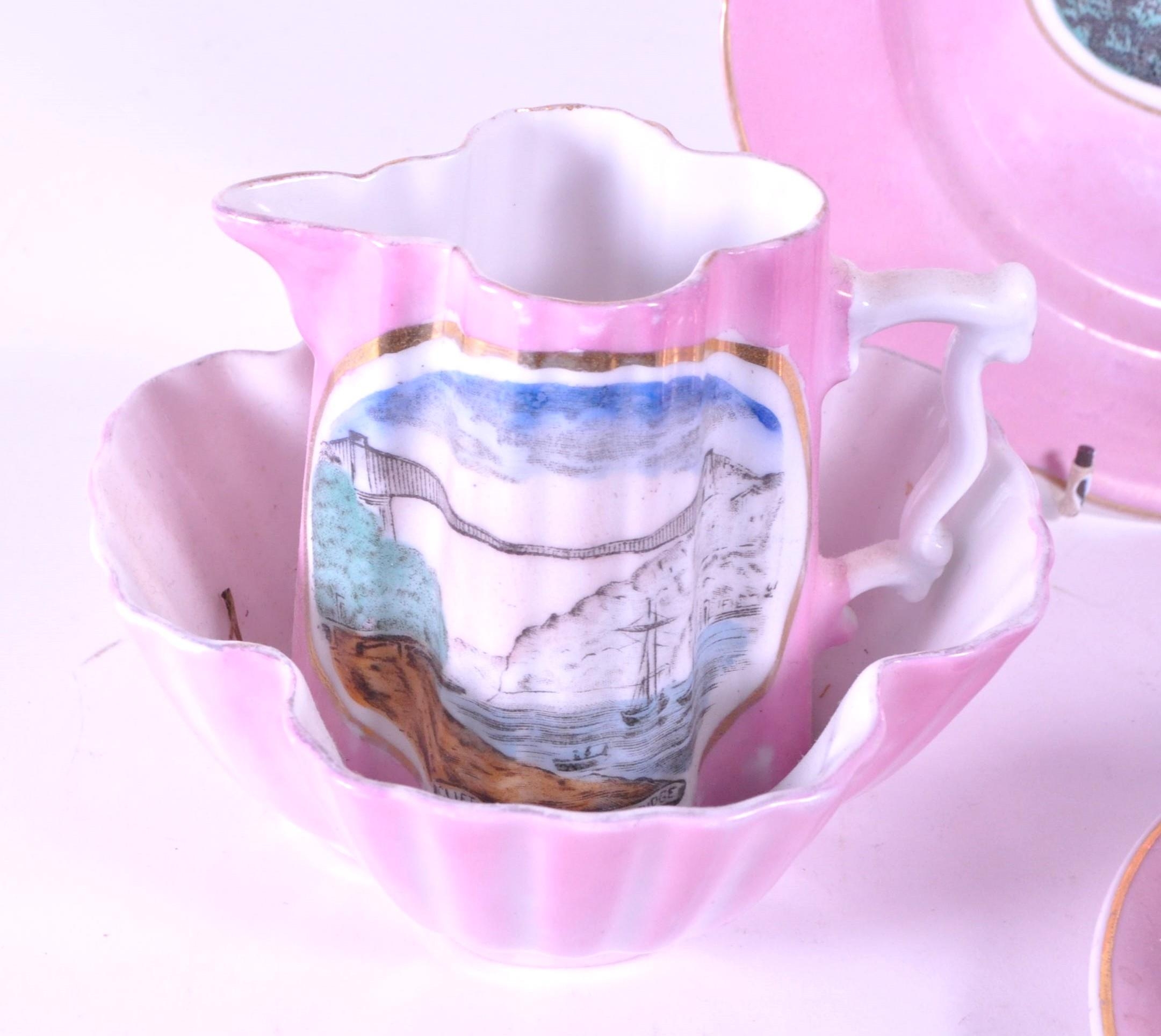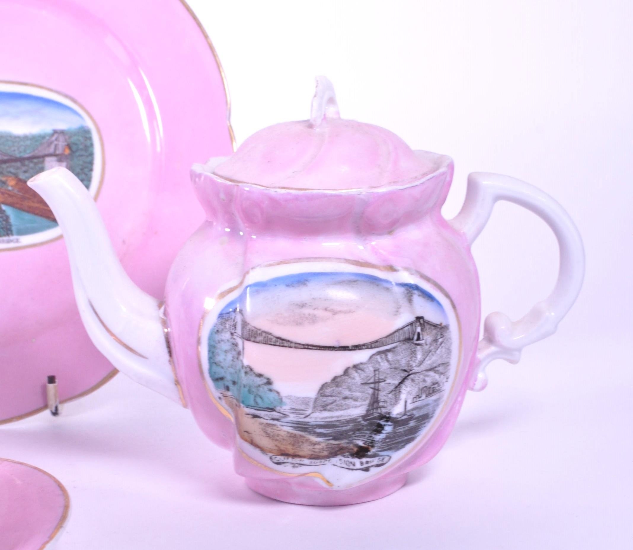 1890 Victorian pink lustre porcelain china Clifton Suspension Bridge souvenir ware. Comprised of a teapot, tea cup, saucer, milk jug, sugar bowl and small plate. Both containing a transfer design of an illustration of Bristol's Clifton Suspension Bridge. Stamped 'Made in Germany' to the undersides.