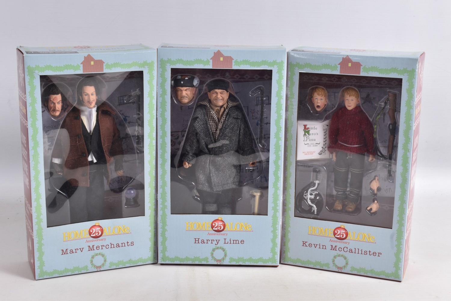 THREE BOXED 2015 NECA REEL TOYS 20TH CENTURY FOX HOME ALONE 25TH ANNIVERSARY FIGURES, to include Kevin McCallister, Marv Merchants and Harry Lime, all appear new and sealed, with alll accessories and figures, very little wear