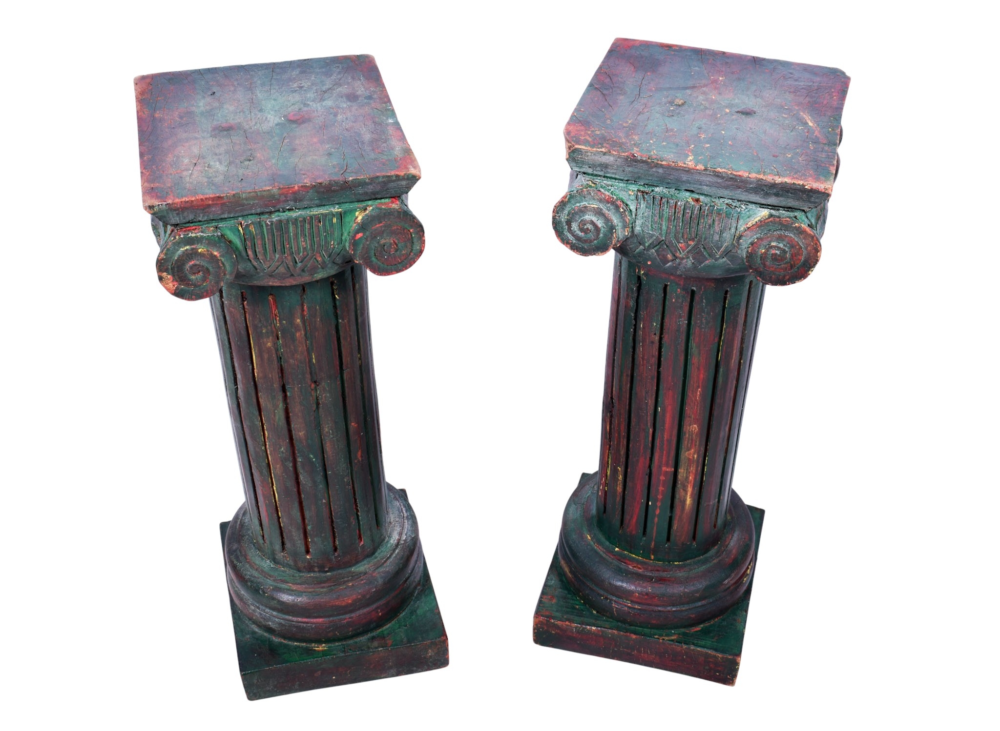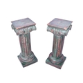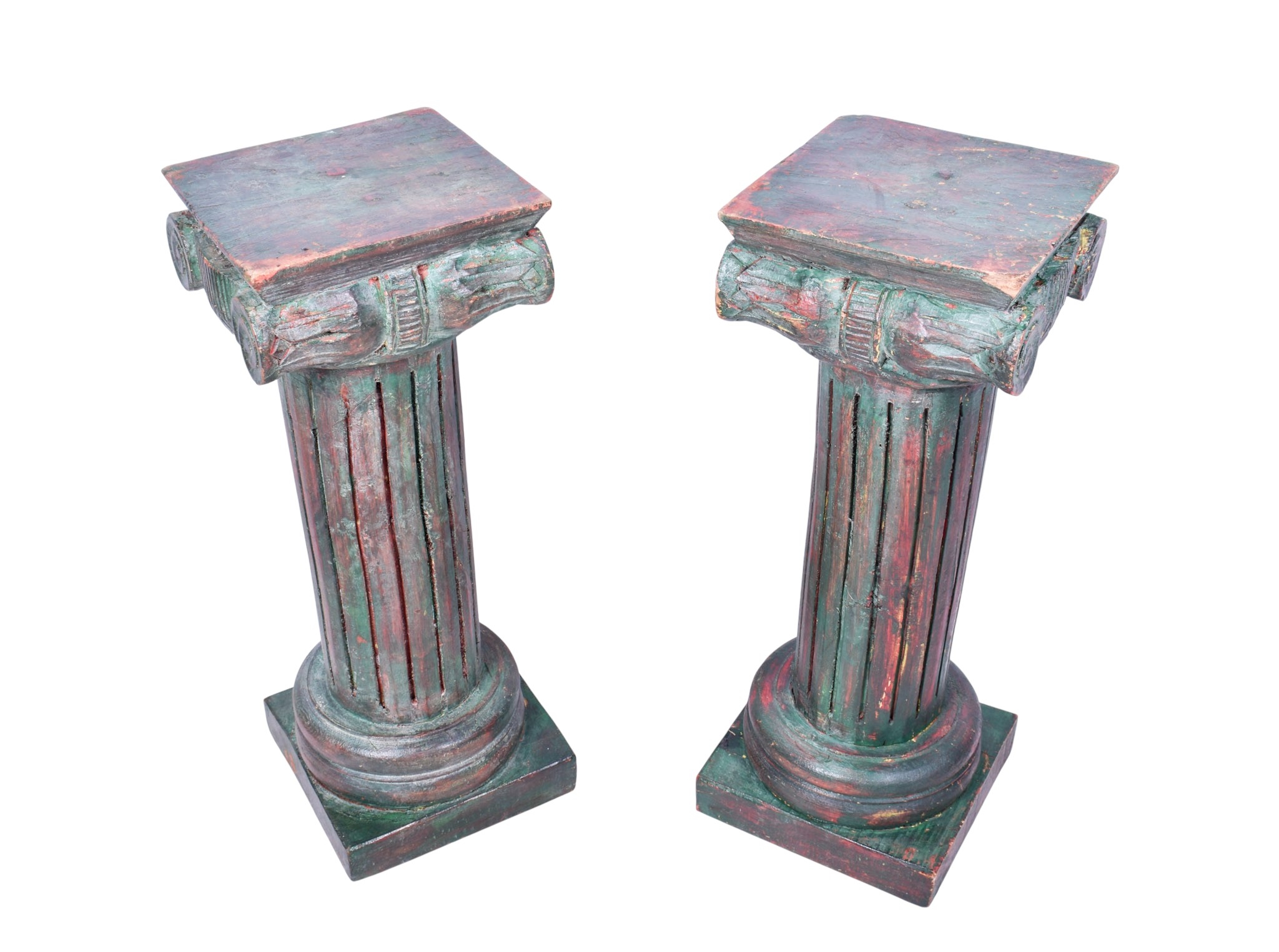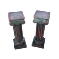 A pair of carved wooden stands. Modelled as Corinthian columns, mounted on square bases, painted green, H61cm.