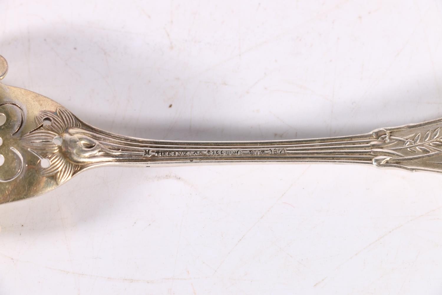 George III silver marrow scoop by William Eley & William Fearn, London 1799 56g, 23cm long, a silver bacon fork by Tiffany and Co 28.9g, and a pair of silver sugar tongs 31g, (3)