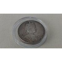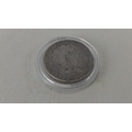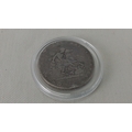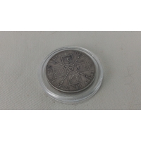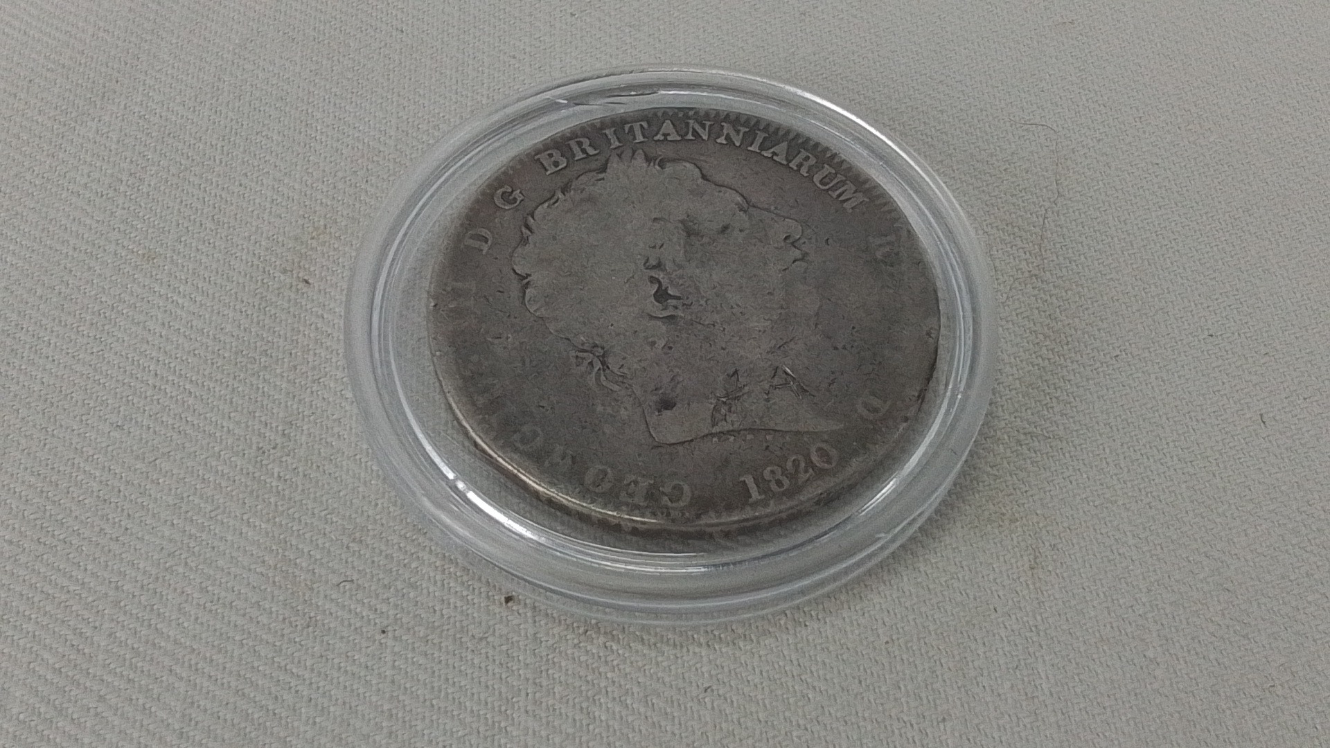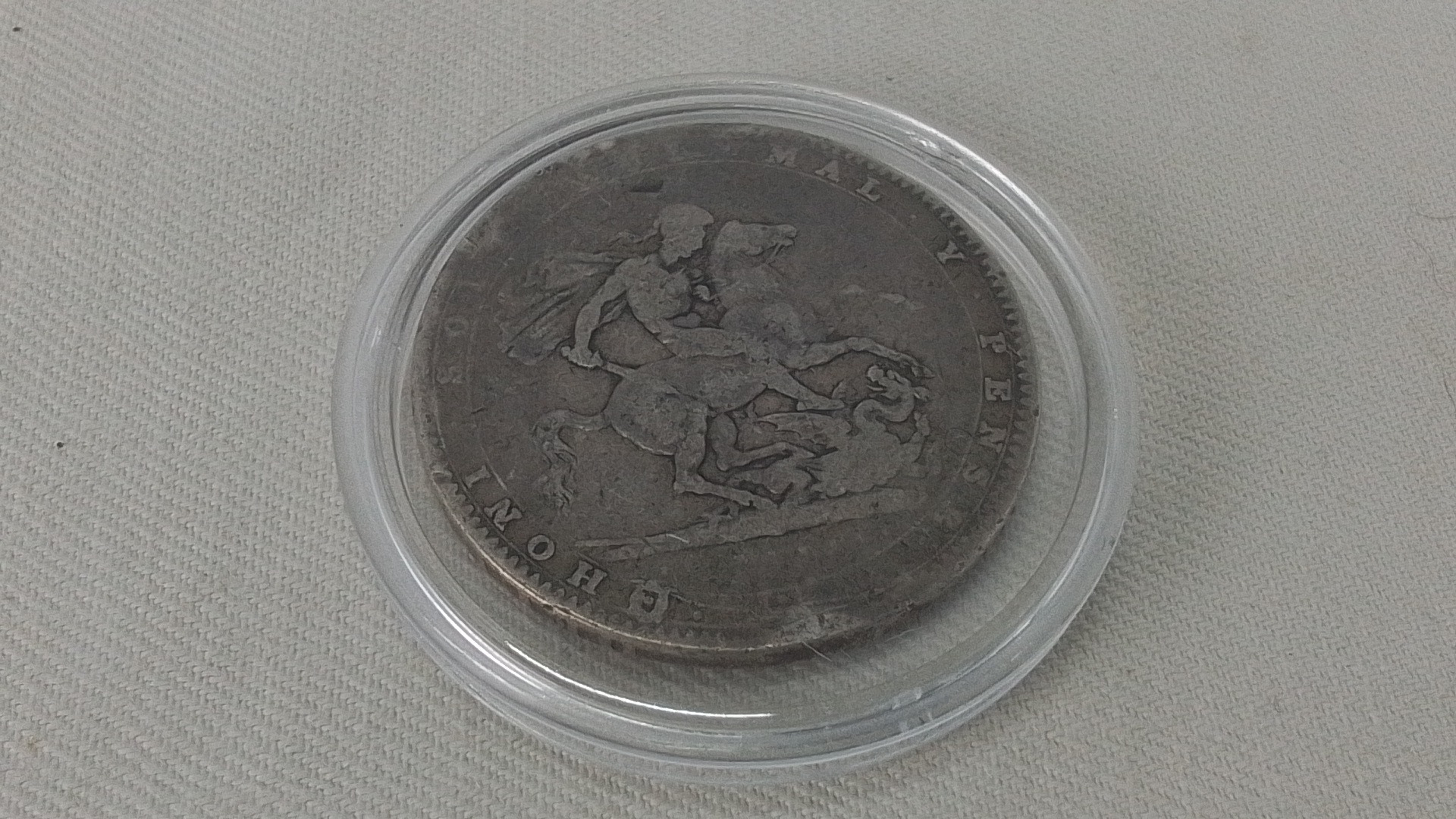 A George III silver crown coin, 1820, laureate bust with Latin legend; reverse with St George slaying the dragon, within garter-style legend, housed in a clear capsule.