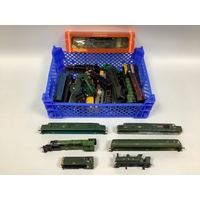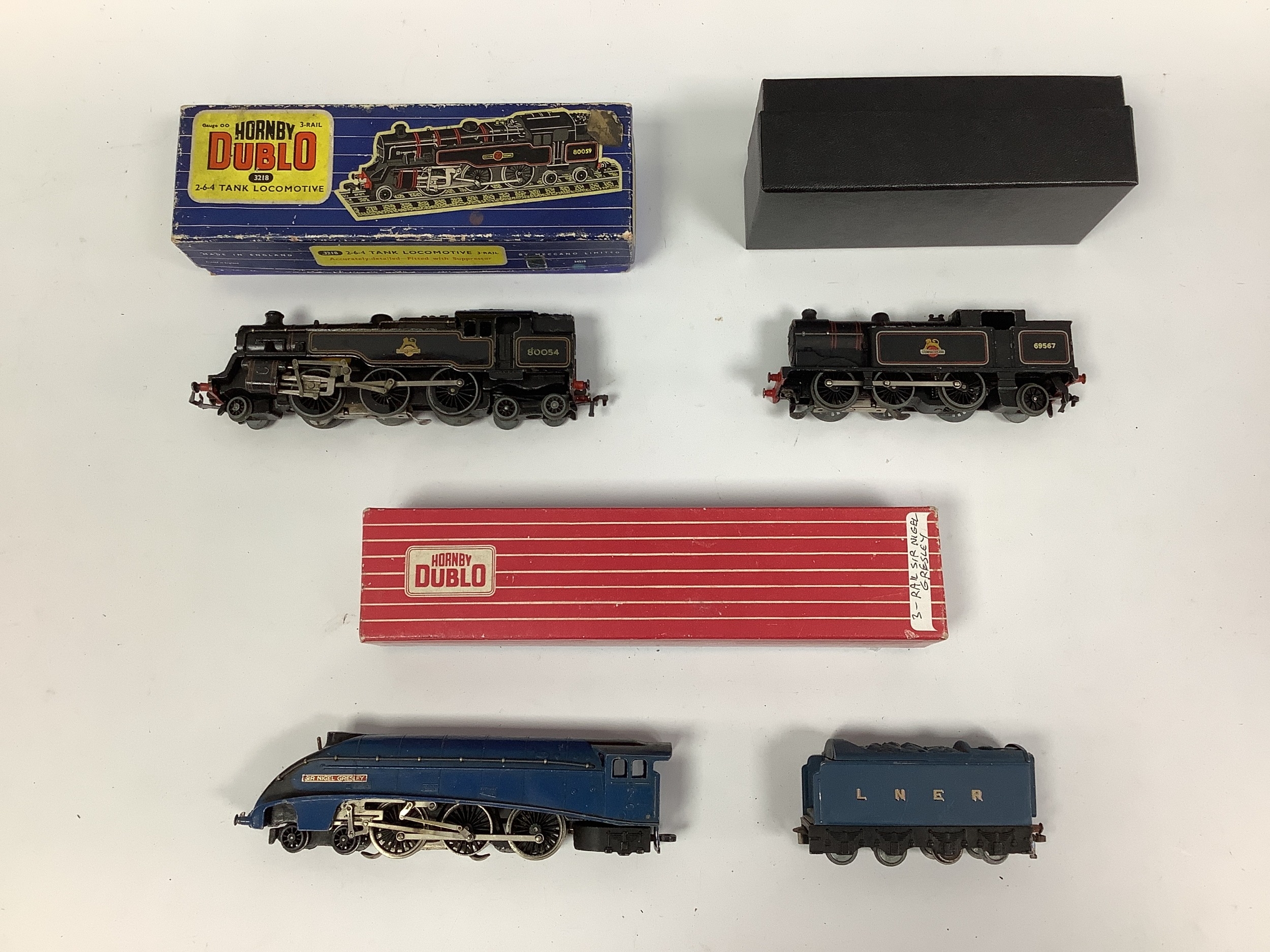 Three Hornby-Dublo three-rail locomotives: a "Sir Nigel Gresley" in LNER blue; a 2-6-4 tank engine; and an N2 0-6-2 tank engine; all untested and playworn.