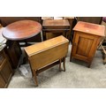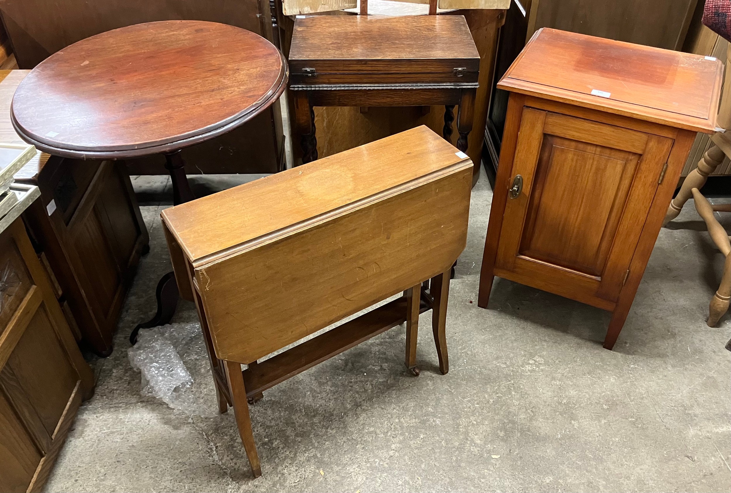 An early 20th Century oak barleytwist cutlery chest, an Edward VII walnut Sutherland table, circular mahogany tripod table and a walnut bedside cupboard