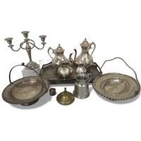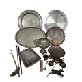 Large collection of silver-plated tableware and serving pieces, largest 15 inches. Extensive mixed lot comprising various serving trays including gallery tray with rope-twist border, pierced silver-plated tray with decorative rim, engraved oval tray with presentation inscription showing pheasant and game birds, round tray with beaded edge, plus rectangular serving tray. Additional pieces include twin-handled trophy cup on pedestal base, shell-form butter dish or bon bon dish with fluted decoration, divided serving dish with glass liner, small jugs and creamers, napkin rings, various Victorian and Edwardian spoons including souvenir examples, brass candle snuffer, brass wall bracket or shelf, cast metal animal ornament (possibly rabbit or hare), plus assorted metalware. Mix of Victorian to mid-20th century silver plate showing varied decorative styles. Comprehensive metalware lot suitable for use or resale.