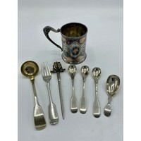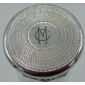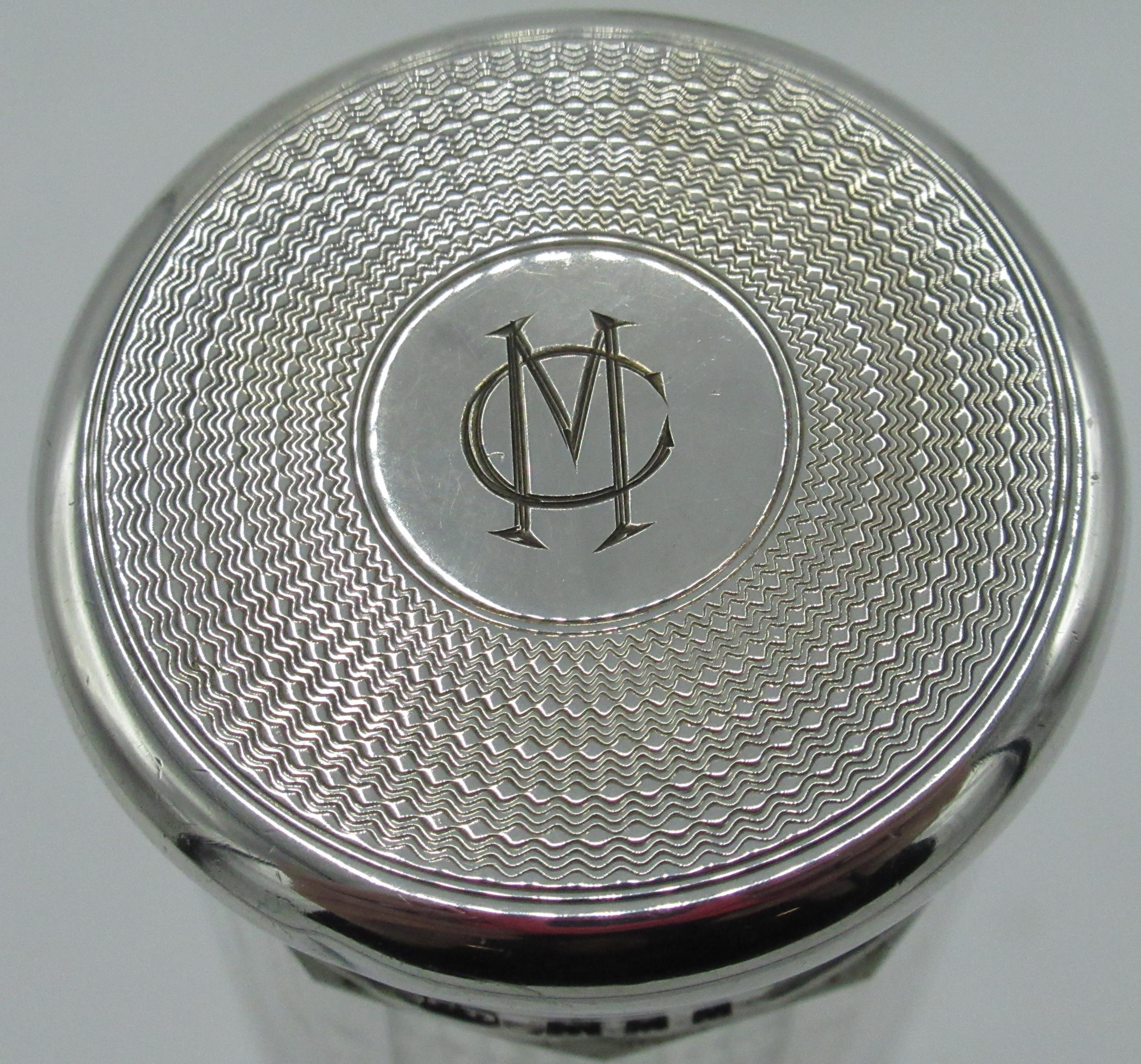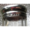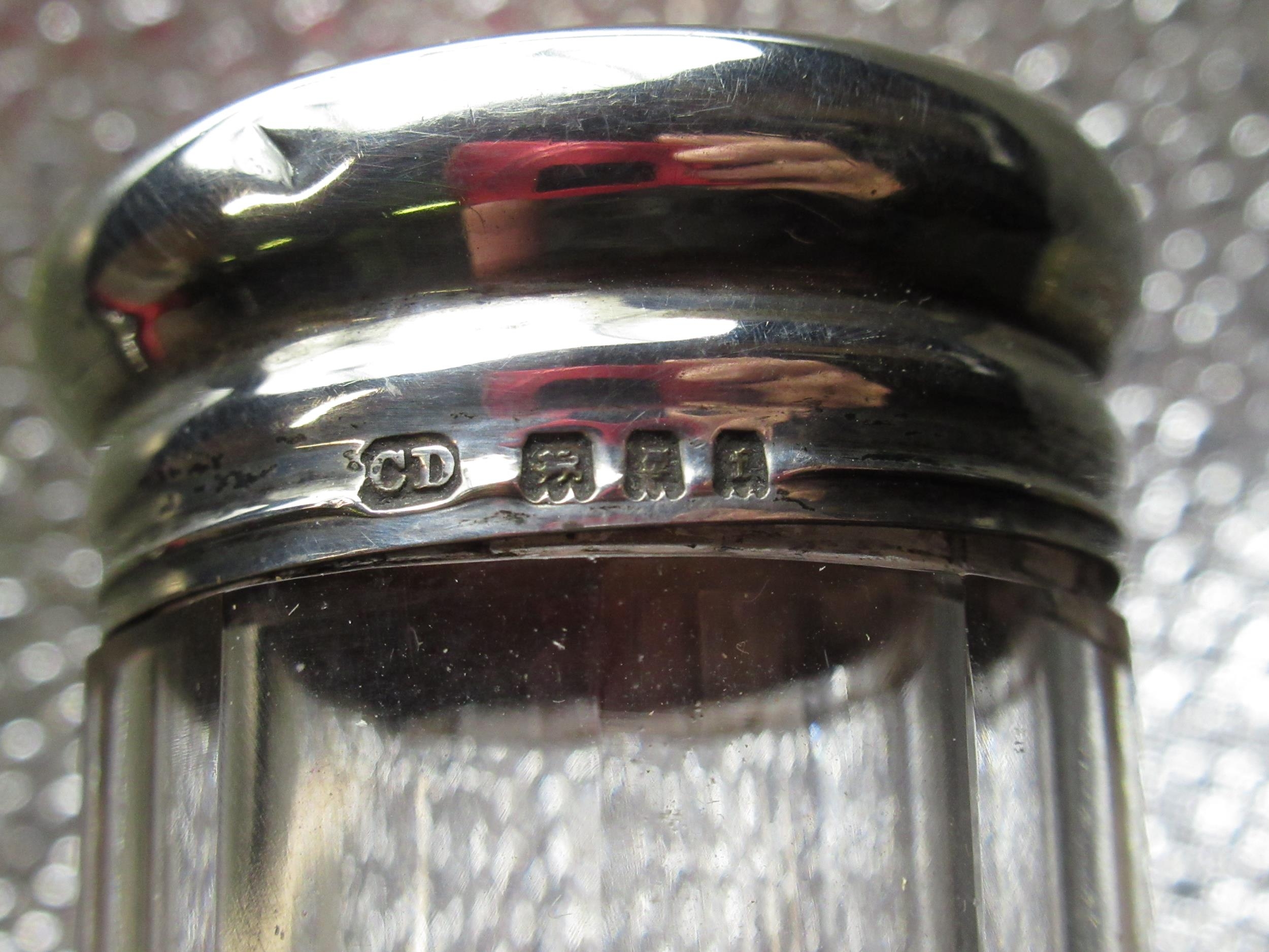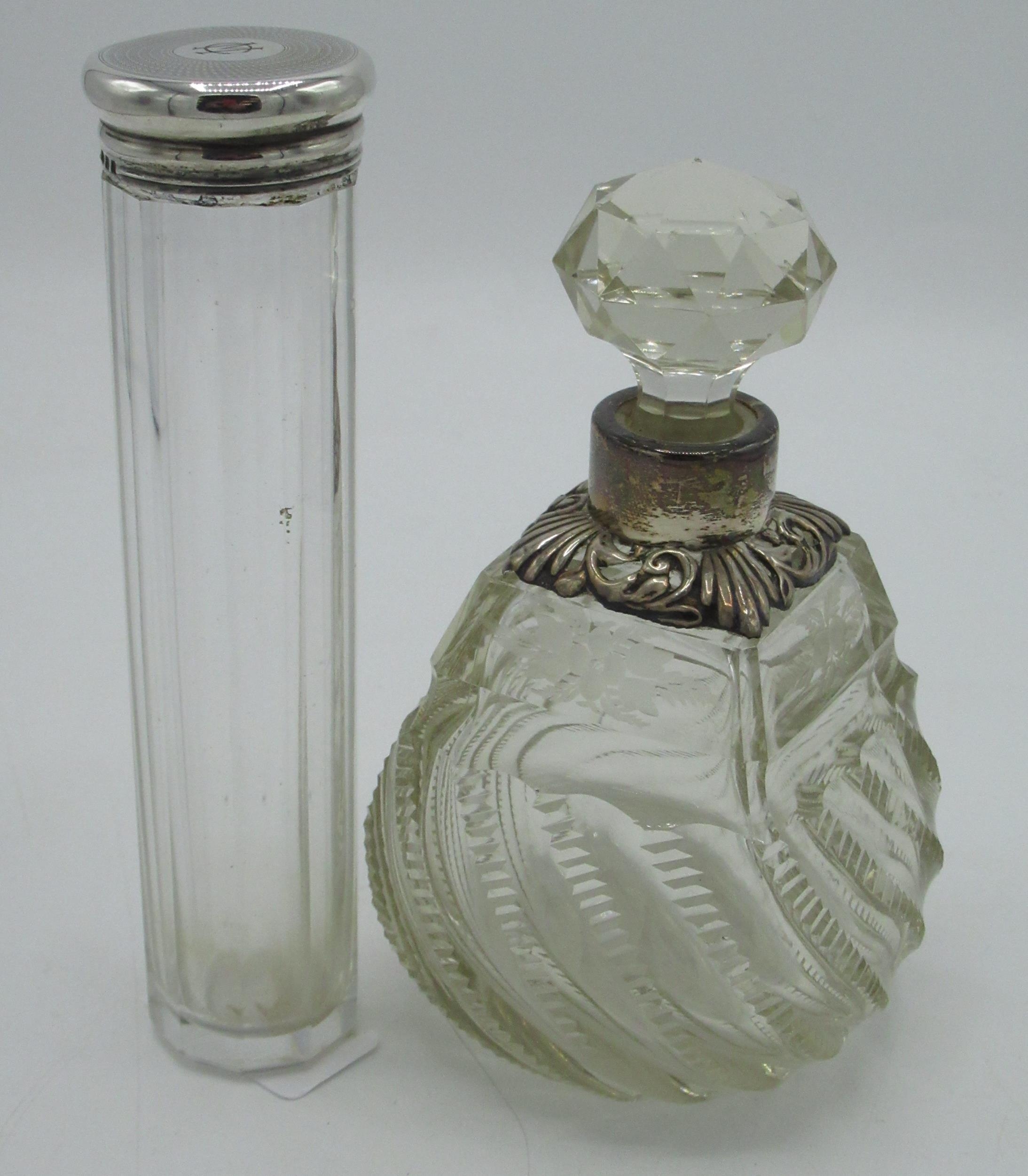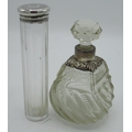 Victorian silver mounted clear glass scent bottle with spiralling cut glass body, hallmarked sterling silver Repoussé and pierced collar with leafy scrolls, (marks rubbed) below a circular faceted stopper, H15cm, Geo.V Art Deco dressing table jar with hallmarked sterling silver engine turned screw lid baring monogram MC with mark CD,