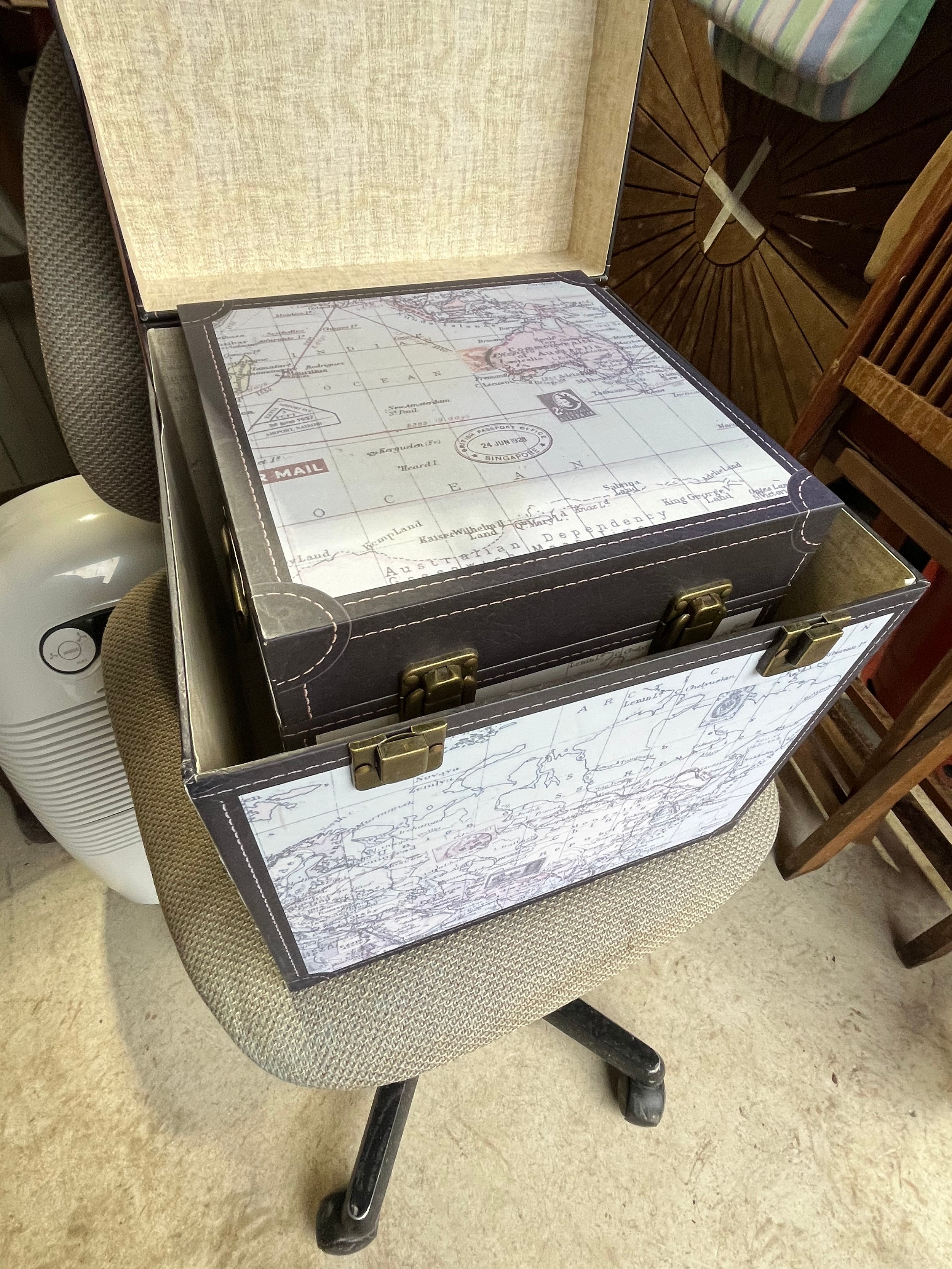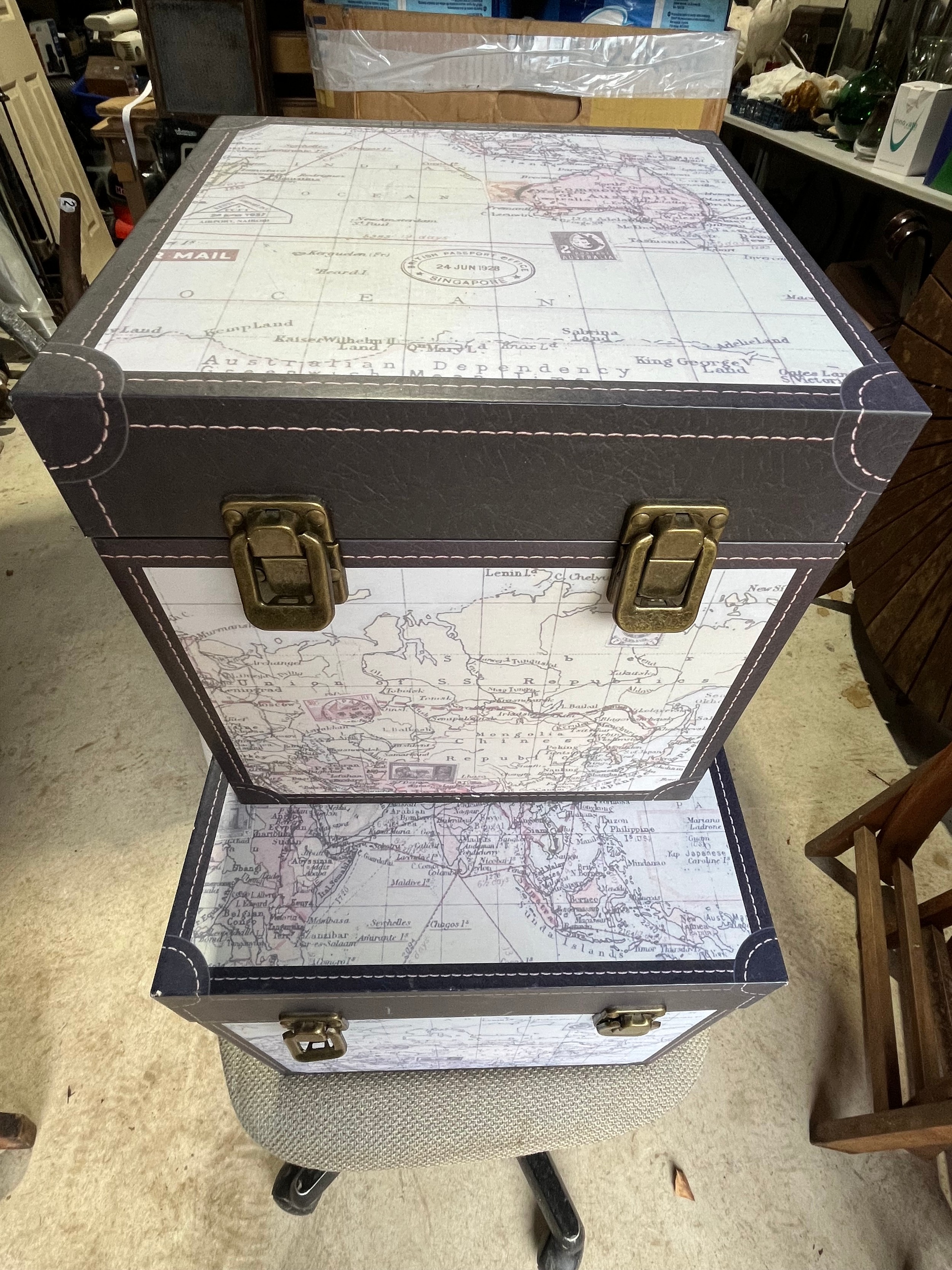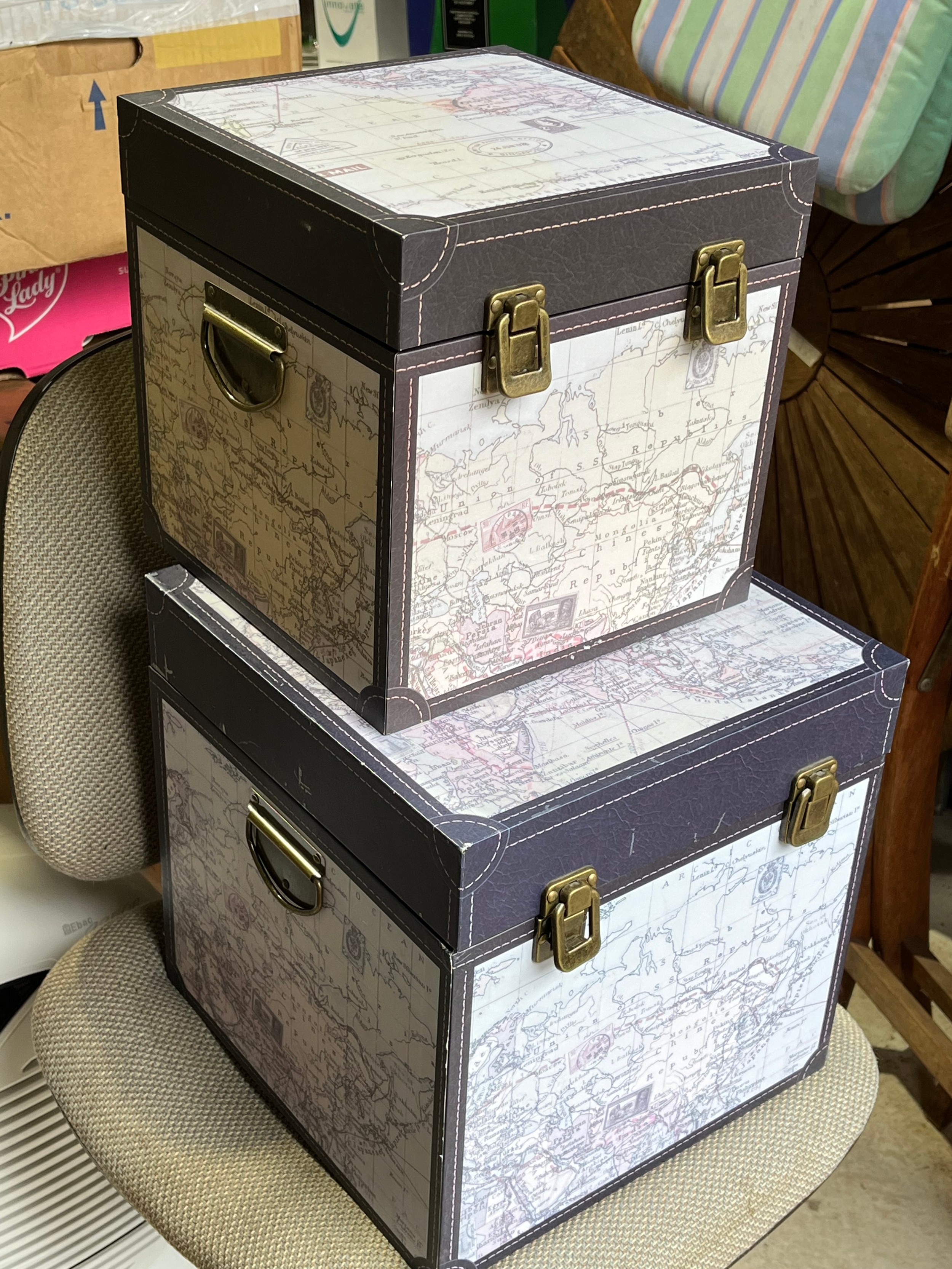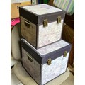 2 atlas map covered modern storage boxes.