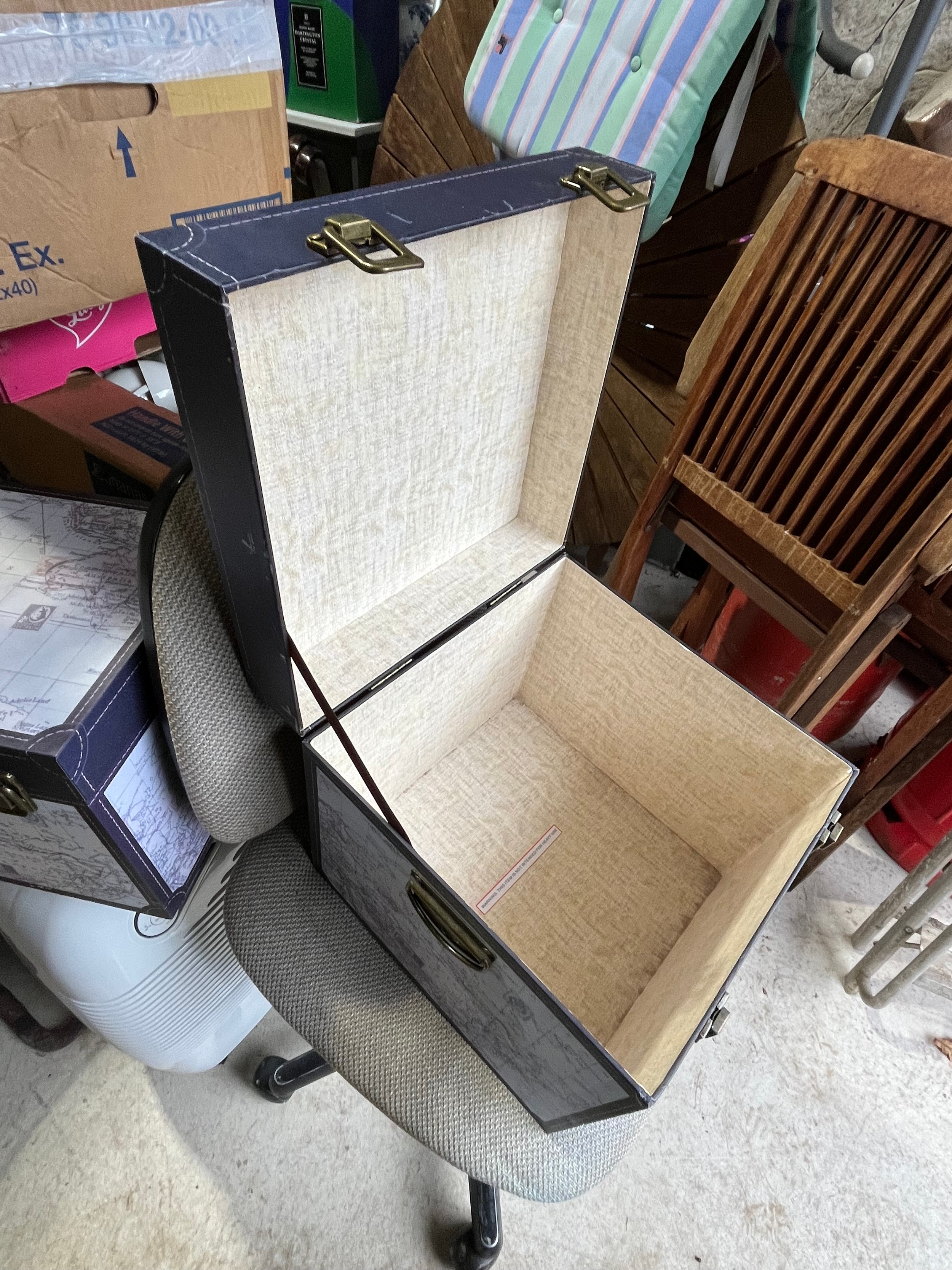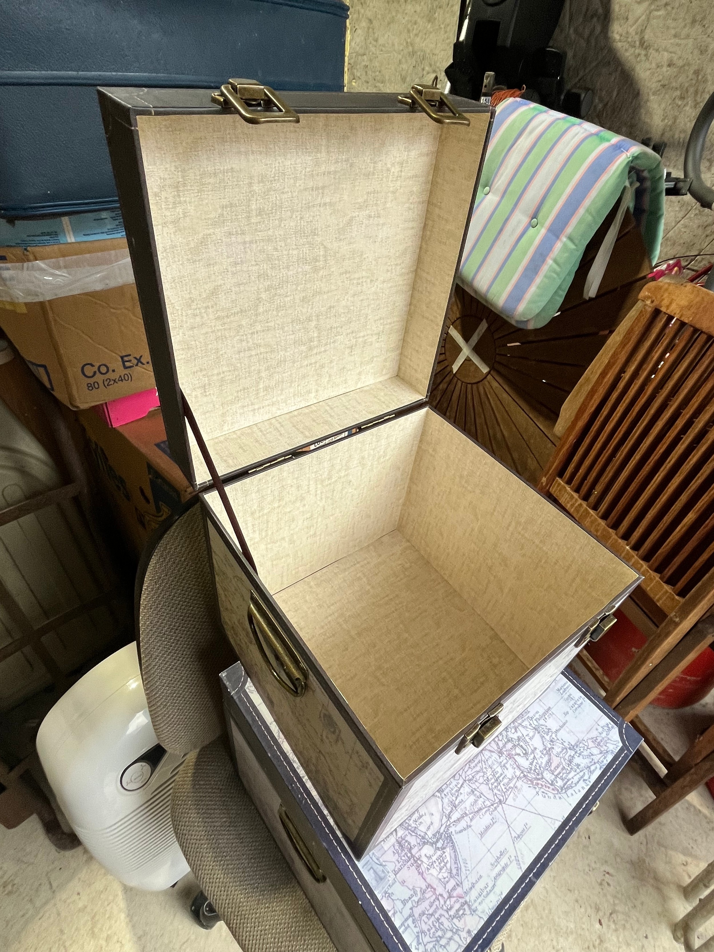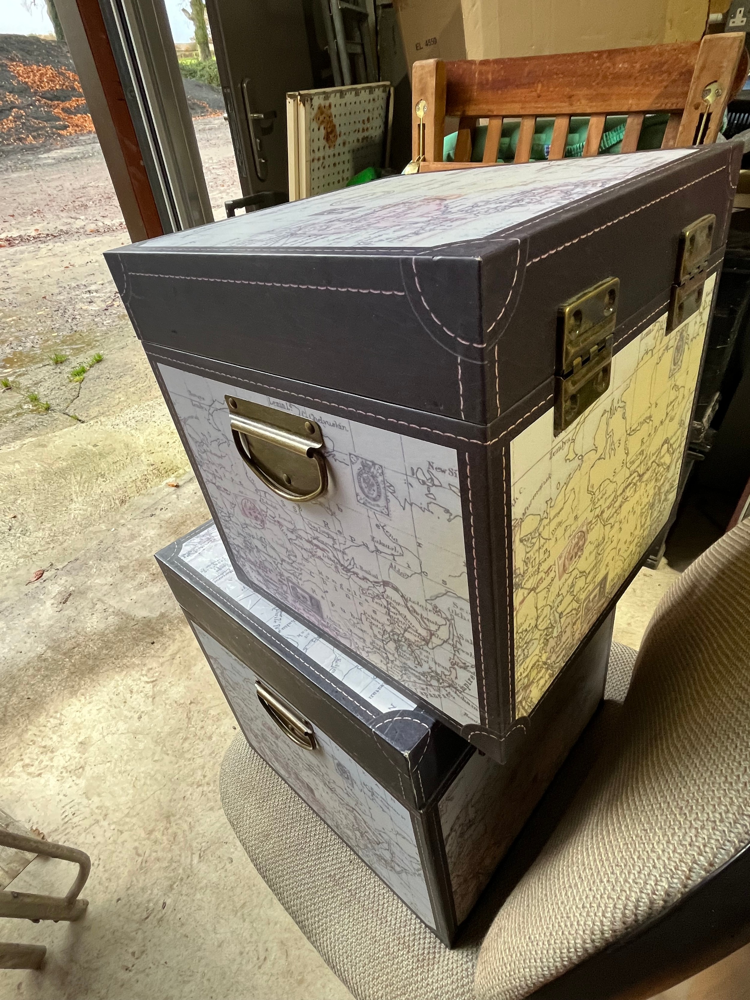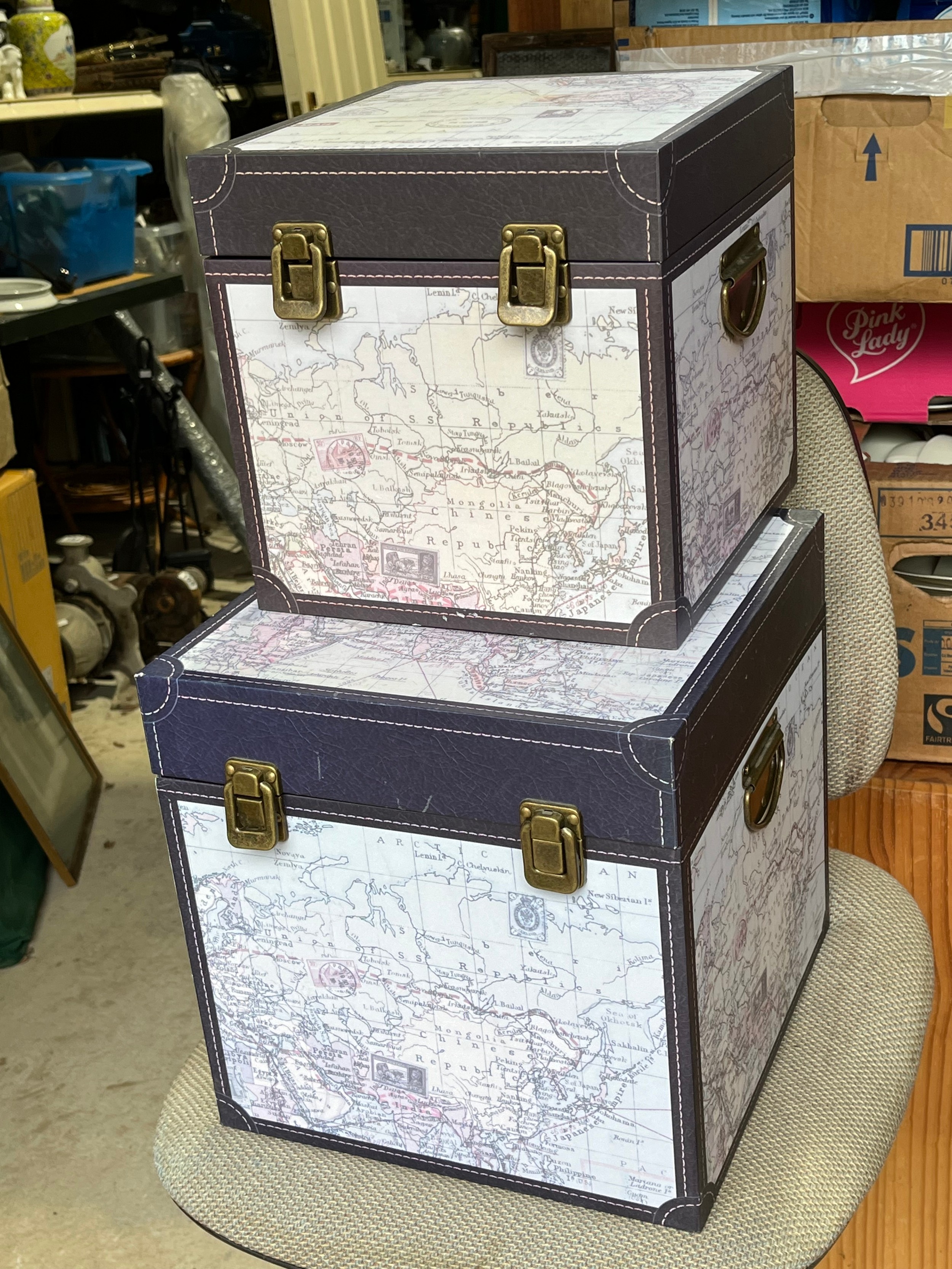 2 atlas map covered modern storage boxes.