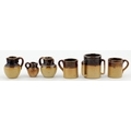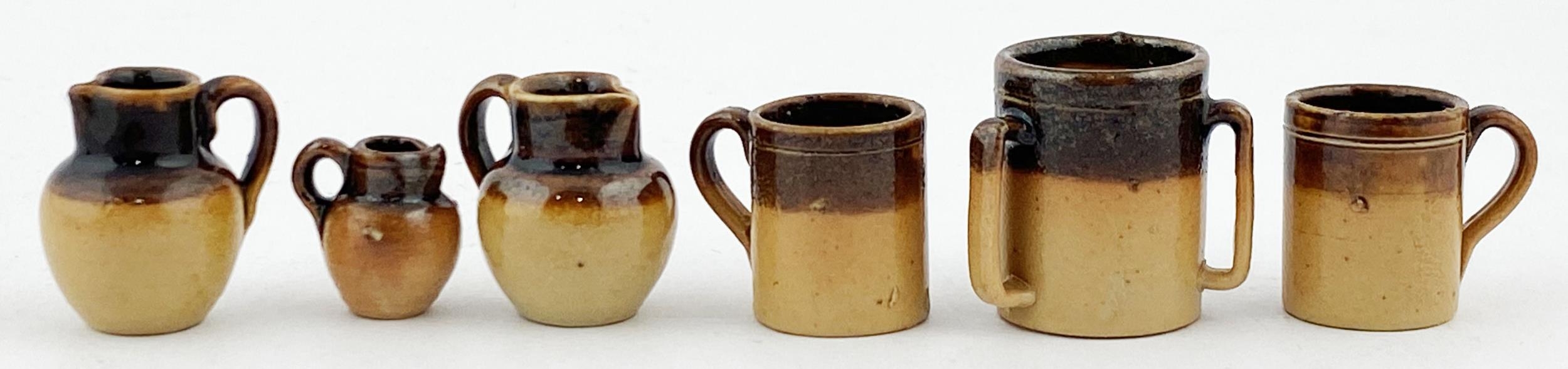 MINIATURE DOULTON (UNMARKED) POTTERY GROUP. Tallest 22mms, all t.t. Three two tankards, one tyg. All good. (6)