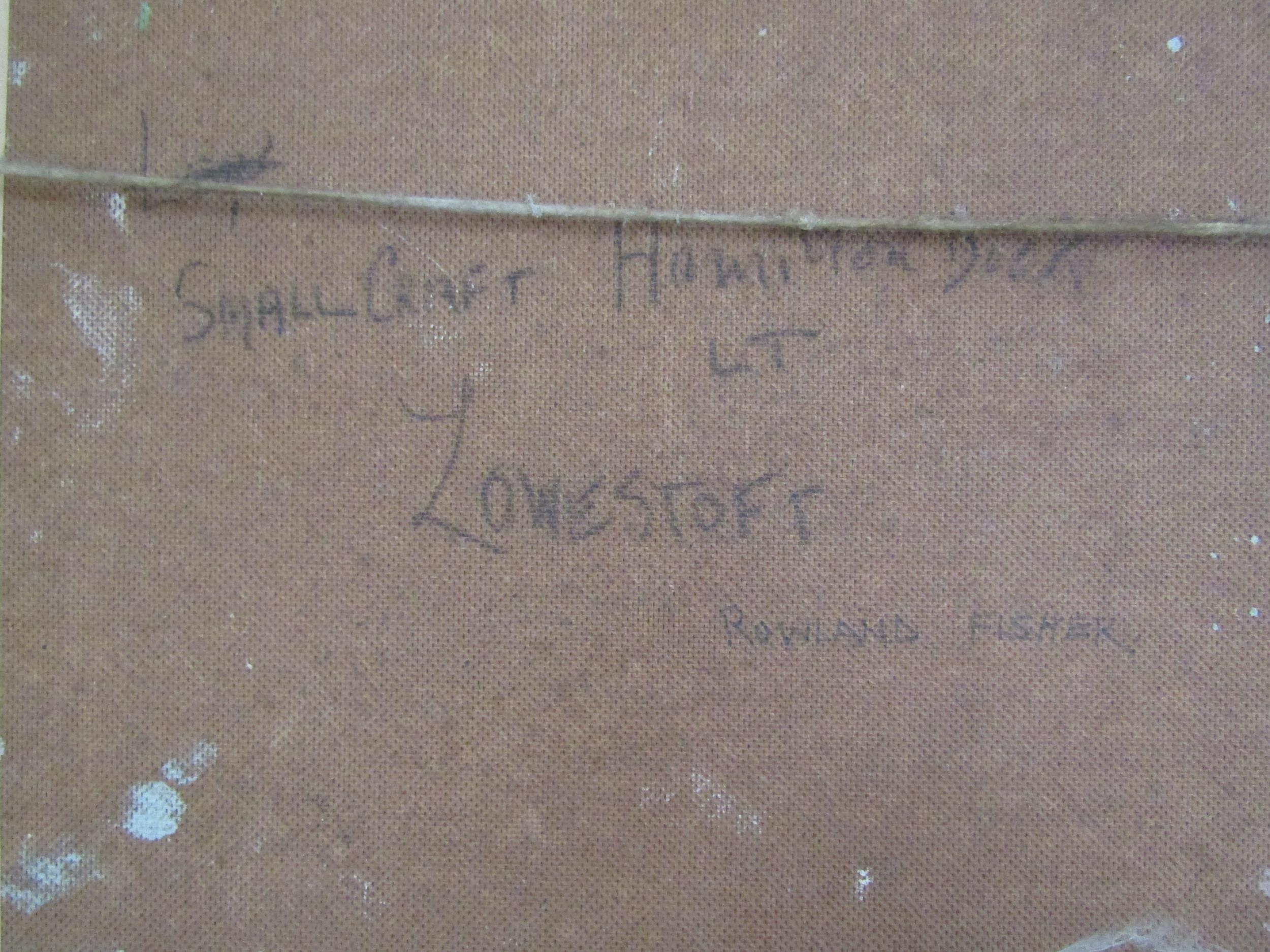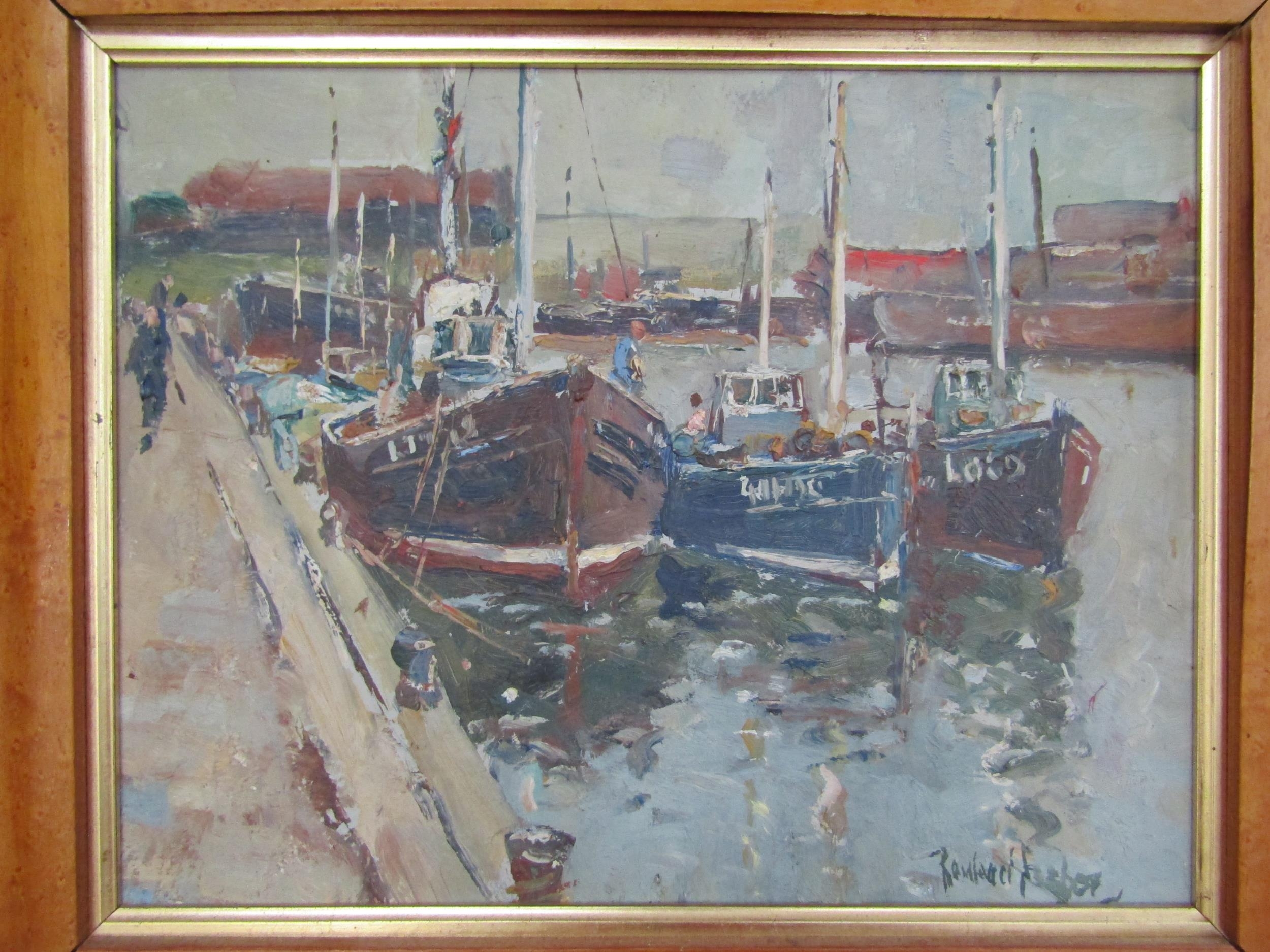 ROWLAND FISHER RA, RMSA, ROI (1885-1969) A framed oil on board, 'Small craft, Hamilton dock, Lowestoft'. Signed bottom right and set in a maple frame (veneer lifting). Image size 28cm x 35.5cm